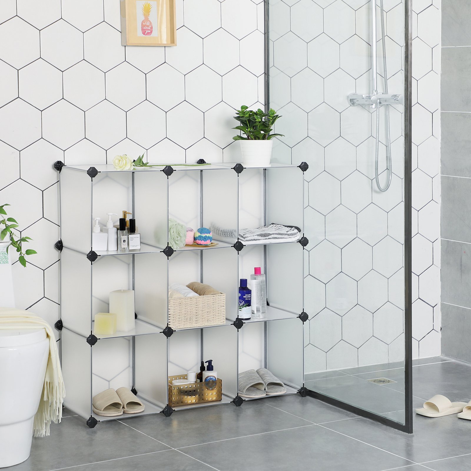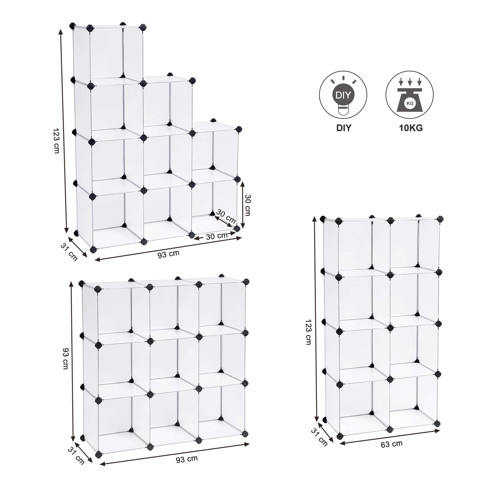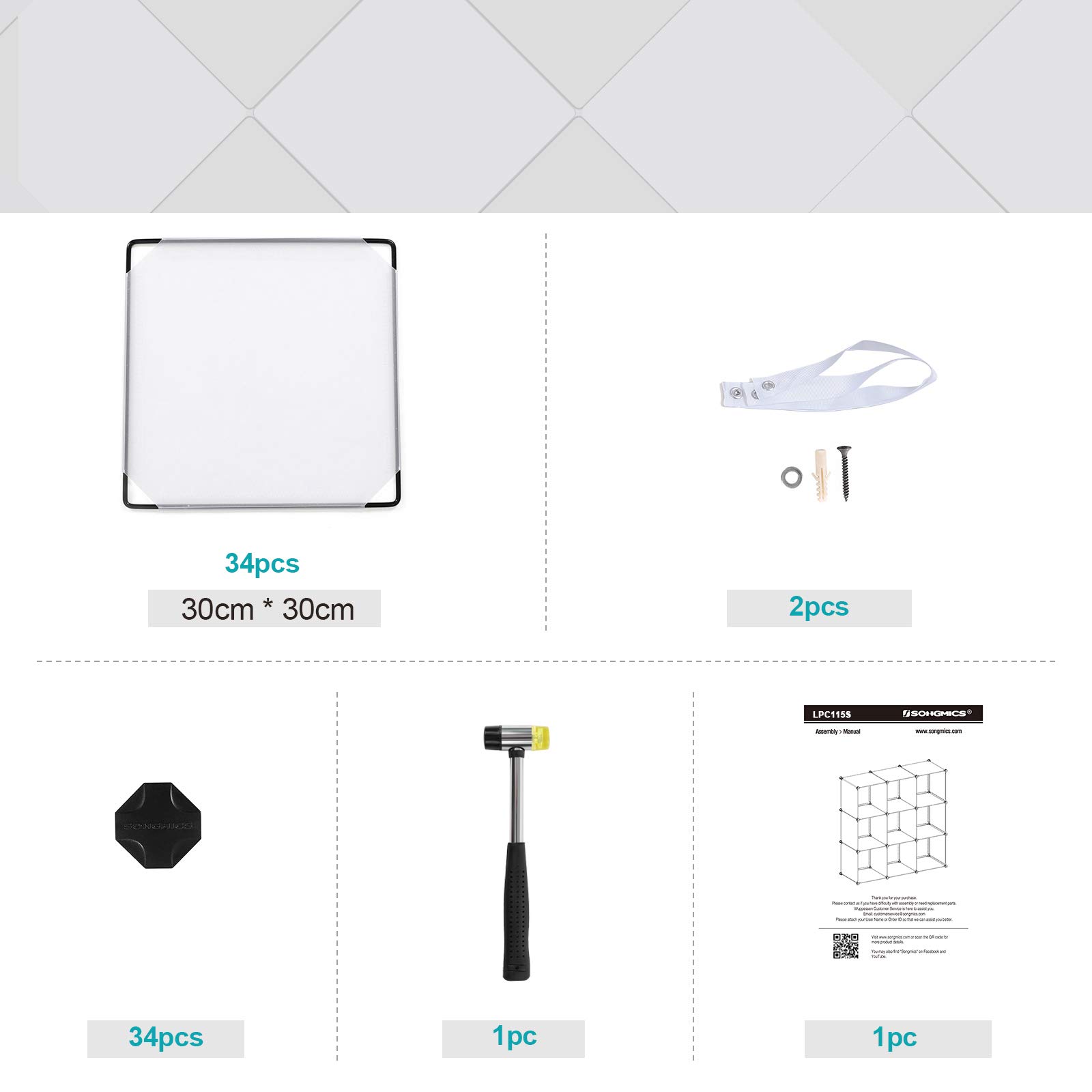 Langlebigkeit, die Sie verdienenLanglebige Kunststoffplatten mit einem Drahtrahmen in Kombination mit ABS-Verbindern machen dieses Treppenregal zu einem langlebigen Begleiter. Jedes der 30 x 30 x 30 cm grossen Fächer ist ideal für die dauerhafte Aufbewahrung von Kleidung, Büchern, Dekoration und mehr.Modulares Design für vielseitigen EinsatzDas vielseitige Stecksystem bietet Ihnen die Möglichkeit, Ihre Würfel so zu bauen, wie Sie es wünschen, und sich an Ihren Raum anzupassen. Mit seinem schlichten und modernen Design ist dieses Würfelregal perfekt für Ihr Wohnzimmer, Ihre Garage, Ihr Kinderzimmer oder Ihren Keller.Produktdetails:- Farbe: Weiss- Material: PP-Kunststoff (Platte), ABS-Kunststoff (Verbindungsstück), Drahtgitter- Abmessungen der einzelnen Fächer: 30 x 30 x 30 cm (T x B x H)- Grösse: 31,5 x 94 x 124 cm (T x B x H)- Gewicht: 5,6 kg- Statische Belastbarkeit pro Fach: 10 kgLieferumfang:- 34 x Platte (30 x 30 cm)- 34 x Schwarzer ABS-Kunststoffstecker- 2 x Kippschutz- 1 x Metallhammer mit Gummikopf- 1 x AnleitungSONGMICS Hinweise:- Bitte befestigen Sie das Regal vor der Benutzung aus Sicherheitsgründen mit dem mitgelieferten Kippschutz an der Wand.- Stellen Sie dieses Regal nicht über längere Zeit im Freien auf, um Witterungsschäden zu vermeiden.- Achten Sie bei der Montage darauf, dass die abgerundete Kante mit dem "SONGMICS"-Logo auf den Kunststoffsteckern nach aussen zeigt.- Achten Sie bei der Montage darauf, dass die Ecken der Platten vollständig in die Unterseite der Verbinder eingesteckt werden, um die Stabilität zu erhöhen.