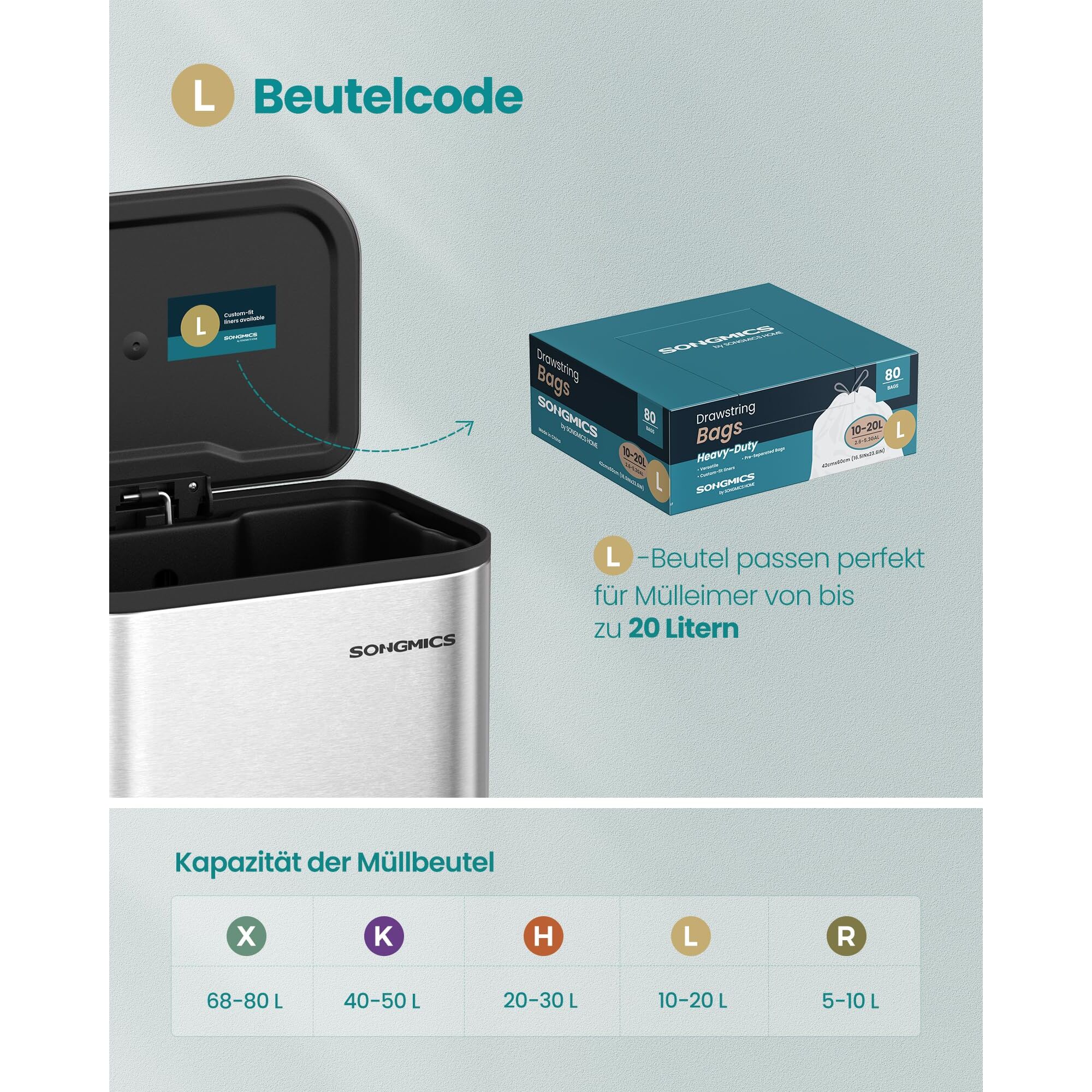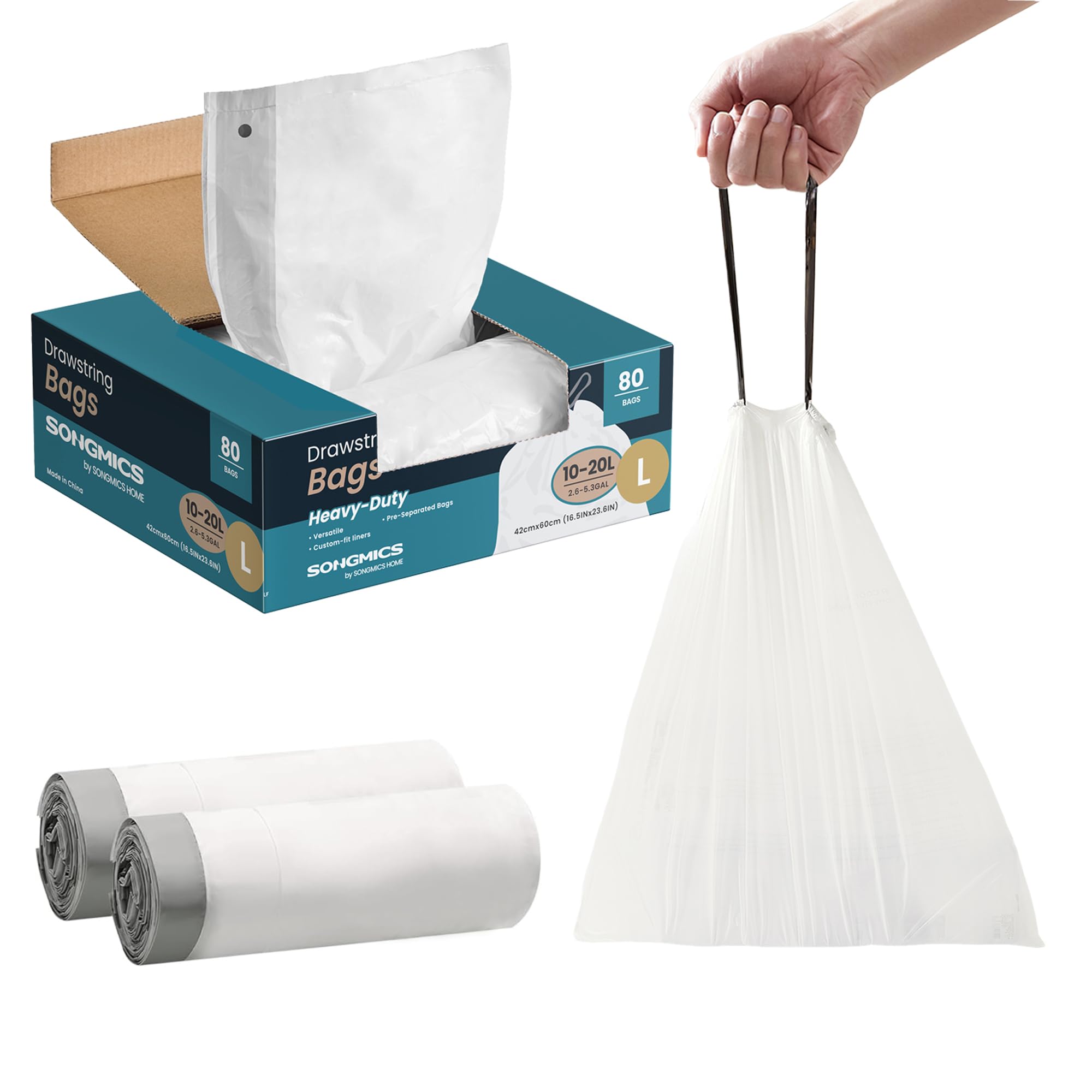 SONGMICS Müllbeutel mit Zugband, hochbelastbar, Müllsäcke für 20 Liter Mülleimer, bereits getrennt, Schnellzugriffsbox, Code L, 2 Rollen, insgesamt 80 Stück, weiss KRB021A02