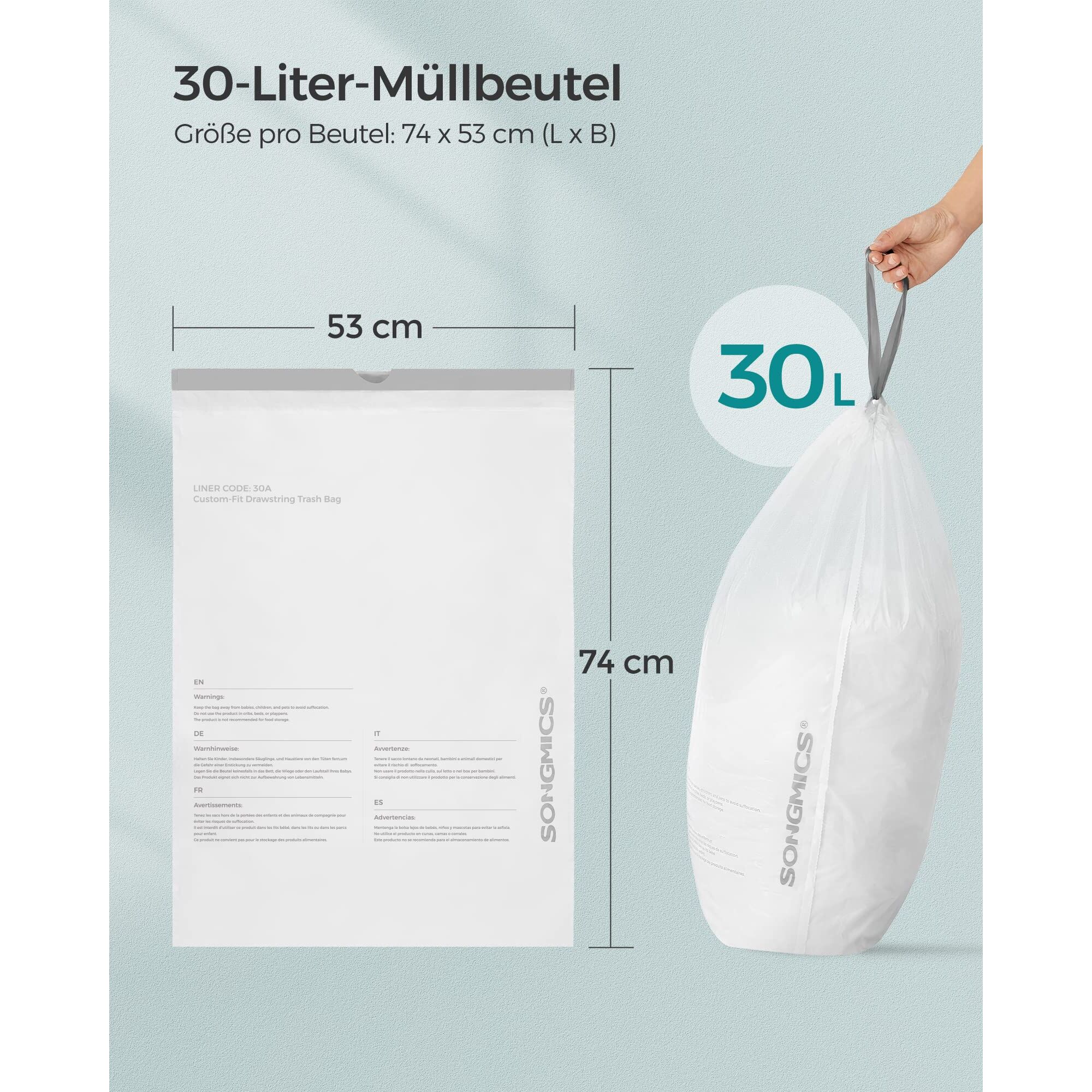Produktdetails: - Farbe: Weiss - Material: 20 μm dicker MDPE-Kunststoff (Mitteldichtes Polyethylen) - Grösse je Beutel: 50,5 x 74 cm (B x H) - Kapazität je Beutel: 30 Liter - Gewicht insgesamt: 3,2 kg - Max. statische Belastbarkeit pro Beutel: 20 kg - Max. statische Belastbarkeit des Zugbandes: 10 kg Lieferumfang: - 4 x Rolle Müllbeutel (insgesamt 180 Stück) SONGMICS Hinweise: - Wenn der Müllbeutel im Mülleimer stecken bleibt, nehmen Sie ihn vorsichtig heraus, um zu vermeiden, dass der Beutel reisst. - Um den Verpackungsbeutel der Müllsäcke zu öffnen, reissen Sie den perforierten Streifen auf der rechten Seite des „Open“-Symbols vorsichtig ab. - Wir raten davon ab, die Müllsäcke zur Aufbewahrung von Lebensmitteln zu benutzen.