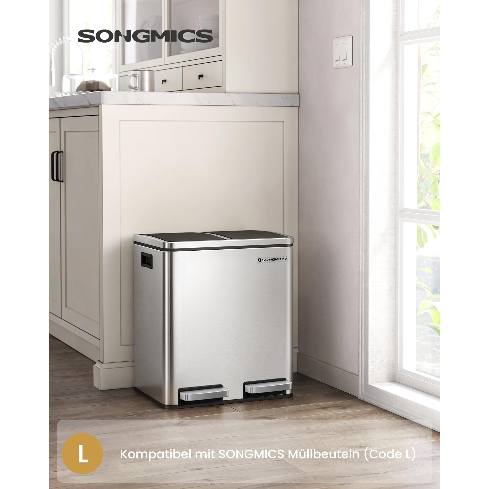 SONGMICS Mülleimer Küche, 2 x 15 Liter, Mülltrennsystem 2 Fächer, inklusive 15 Müllbeutel, Abfalleimer, Treteimer, recycelbare Abfälle, Biomüll, Softclose-Deckel, metallicsilber-tintenschwarz LTB30H