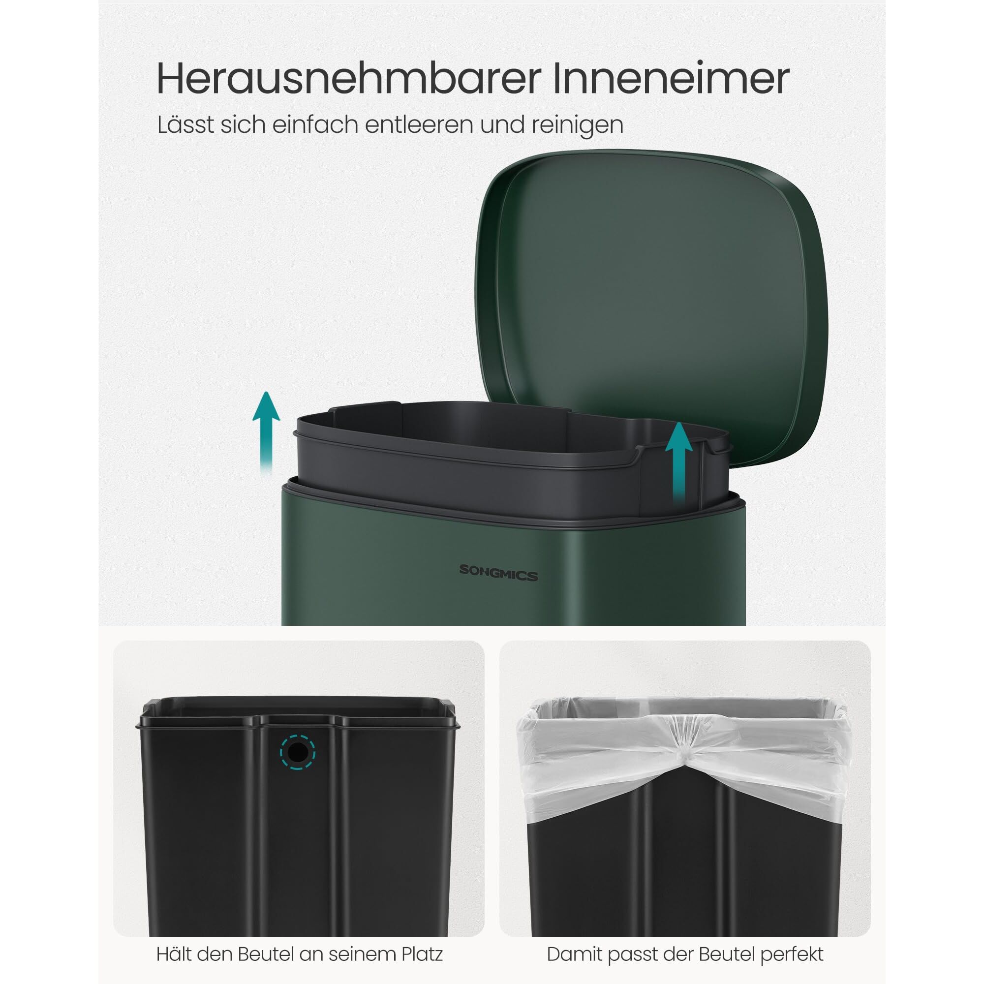 - Grösse des Inneneimers: 40,6 x 25,7 x 58,3 cm (L x B x H)