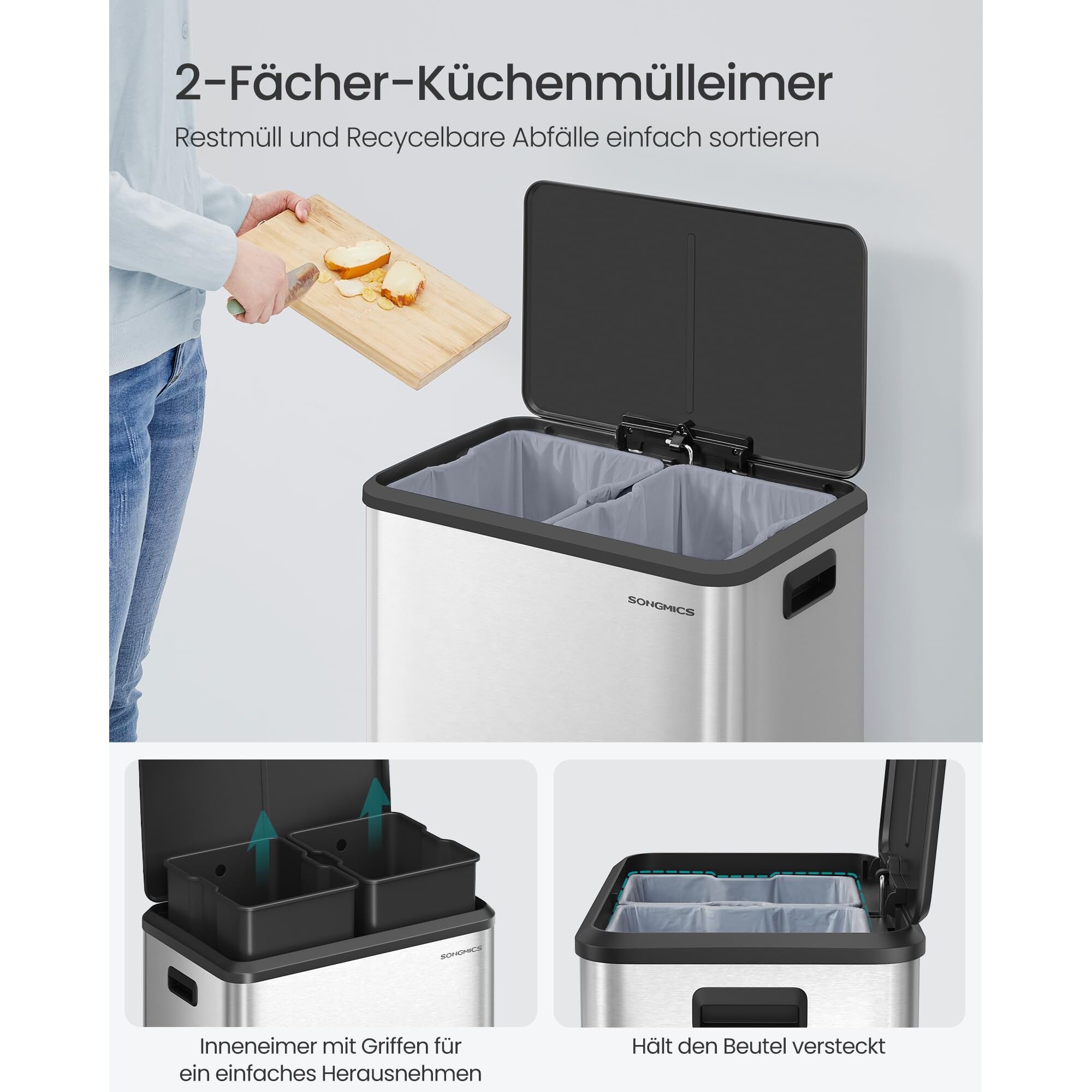 Produktdetails:Farbe: MetallicsilberMaterial: Edelstahl, Inneneimer aus PP-KunststoffGrösse: 52,5 x 37,2 x 65,8 cm (L x B x H)Gesamthöhe (mit geöffnetem Deckel): 98,9 cmGrösse pro Inneneimer: 27,5 x 23 x 61,5 cm (L x B x H)Grösse des Pedals: 18,5 x 2,7 cm (L x B)Kapazität: 2 x 30 LGewicht: 8,4 kgLieferumfang:1 x Mülleimer mit Deckel1 x AnleitungSONGMICS Hinweise:Der Mülleimer ist nur für den Innenbereich geeignet.Wischen Sie den Küchenabfalleimer zur Reinigung bitte mit einem weichen, feuchten Tuch ab und verwenden Sie gegebenenfalls milde Reinigungsmittel.Um eine lange Gebrauchsdauer sicherzustellen, schliessen Sie den Deckel des Treteimers bitte nicht gewaltsam per Hand.