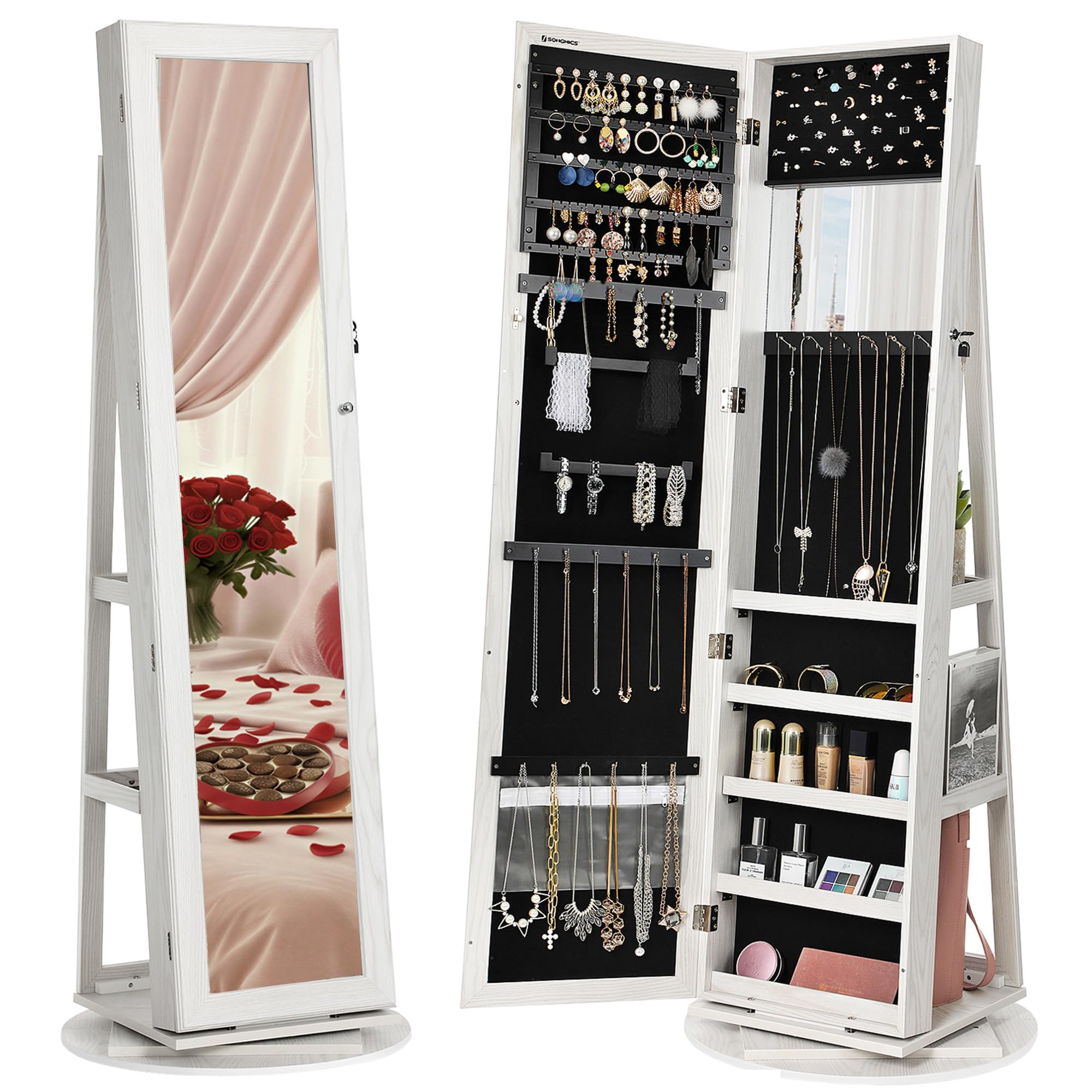 SONGMICS Schmuckschrank, Standspiegel, Spiegelschrank, mit Ganzkörperspiegel, um 360° drehbar, Schmuckaufbewahrung, abschliessbar, mit Schlüsseln, Geschenkidee, weiss mit Grauer Holzmaserung JBC62W