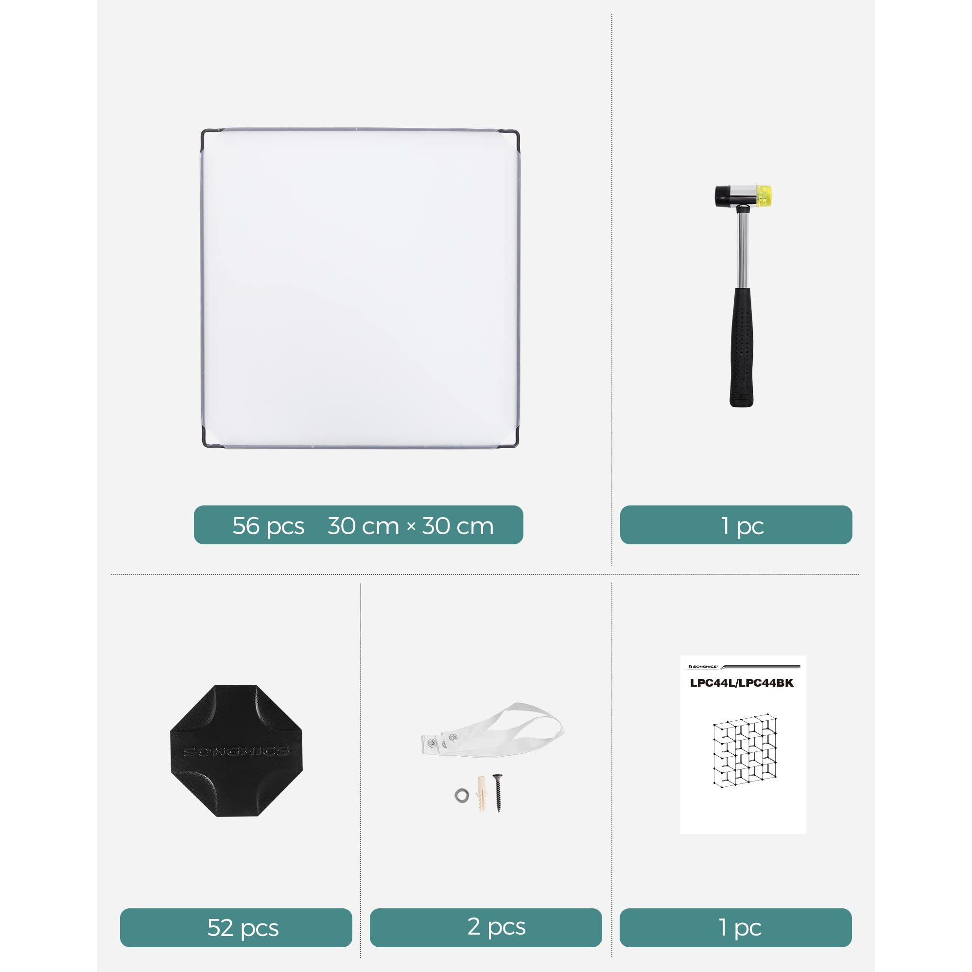 Produktdetails: - Masse: 153 x 153 x 31 cm (B x H x T) - Farbe: halbtransparent - Material: PP-Kunststoff (Platte) + ABS-Kunststoff (Verbindungsstück) + Eisendrähten (Plattenumrandung) - Belastbarkeit jedes Faches: 10 kg - Nettogewicht: 8,3 kg - Bruttogewicht: 8,9 kg Lieferumfang: - 56 x PP-Platte (30 x 30 cm) - 52 x Plastikverbindungsstück - 1 x Holzhämmerchen - 1 x Anleitung (DE, EN, FR, IT, ES) - 1 x Kippschutz Hinweise: - Bitte bewahren Sie den Artikel in geschlossenen Räumen auf, schützen Sie ihn vor Verwitterung. - Beim Anbringen der Verbindungsstücke beachten Sie bitte, dass die runden Flächen mit dem Logo "Songmics" alle nach aussen zeigen sollten. - Die Songmics Aufbewahrungsboxen aus Vliesstoff passenn nicht in dieses Produkt hinein.