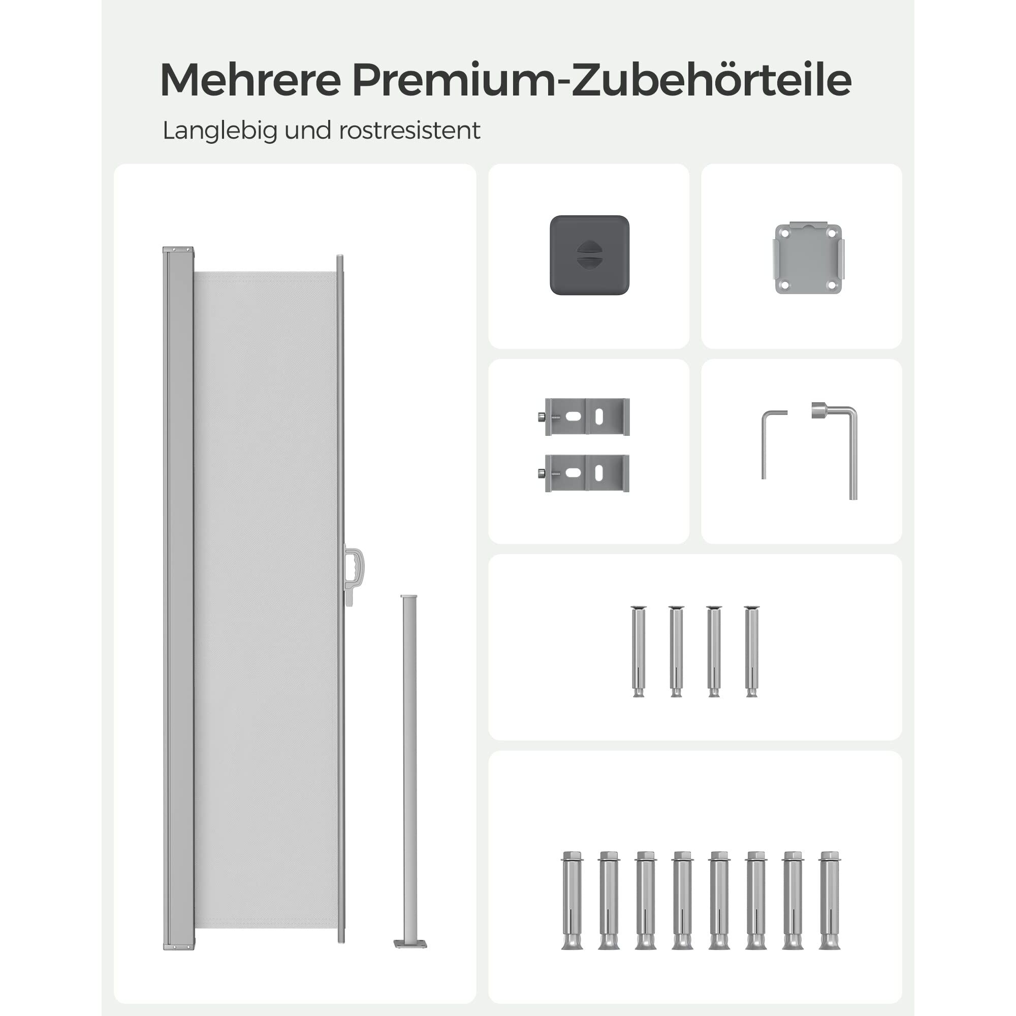 SONGMICS Seitenmarkise mit Stahl-Kasten, rostbeständig, ausziehbar, 200 x 400 cm, Windschutz, Sonnenschutz, Blickdicht, Seitenrollo, für Balkon, Terrasse, Garten, hellgrau GSA504G03