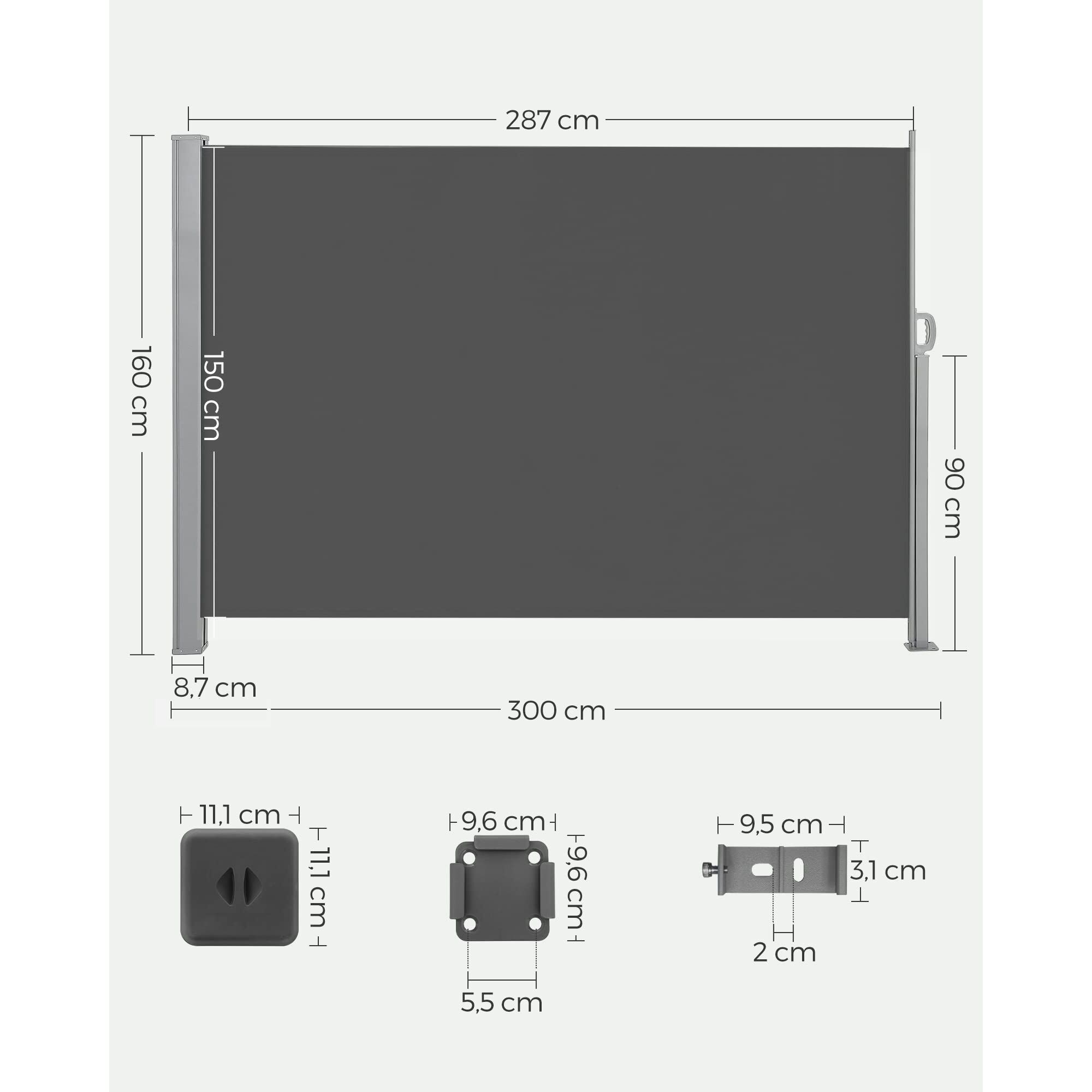 SONGMICS Seitenmarkise mit Stahl-Kasten, rostbeständig, ausziehbar, 160 x 300 cm, Windschutz, Sonnenschutz, blickdicht, Seitenrollo, für Balkon, Terrasse, Garten, anthrazit GSA160TG