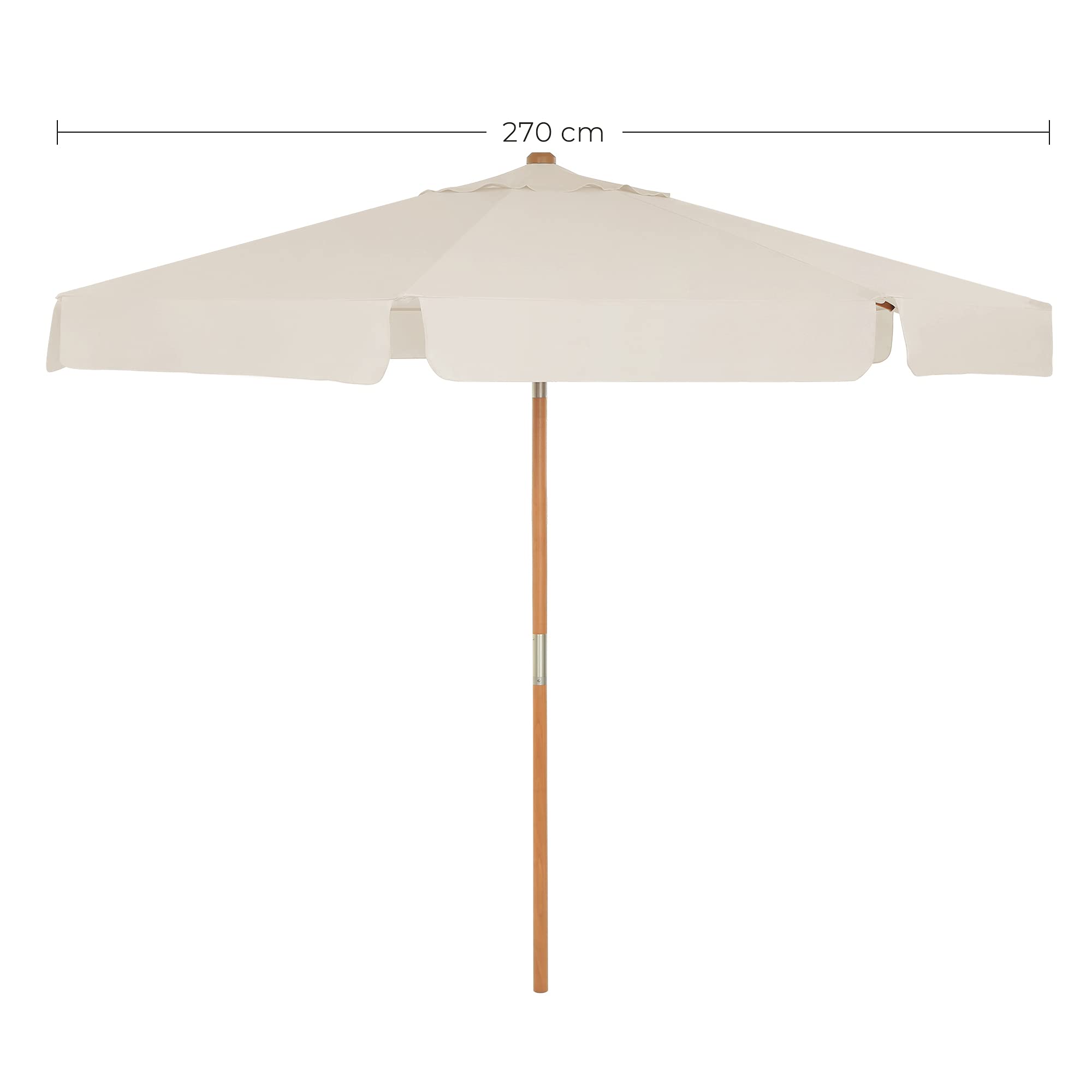 Warme Sonne, blauer Himmel, frische Luft, schöne Natur... Worauf warten Sie noch? Zeit zum Entspannen im Garten! Angst vor starken Sonnenstrahlen? Keine Sorge. Öffnen Sie einfach diesen Sonnenschirm von SONGMICS und geniessen Sie das schöne Wetter im Schatten!Die Highlights dieses Sonnenschirms:- Unter diesem Ø 2,7 m Sonnenschirm finden 4 bis 6 Personen Platz- Bietet einen hervorragenden UV-Schutz- Die Knickfunktion ermöglicht es Ihnen, den Gartenschirm so zu neigen, dass er immer an der richtigen Stelle Schatten wirft- Der Schirmmast besteht aus stabilem Buchenholz- Die 8 Schirmrippen sind aus hochwertigem und robustem Hartholz gefertigt- Das Sonnentuch aus 180 g/m² Polyestergewebe verspricht eine lange Gebrauchsdauer- Der Schirm lässt sich durch das praktische Seil einfach öffnen sowie schliessen- Der Schirmmast besteht aus 2 Stangen, welche einfach zusammengeschraubt werden können- Die Holzstruktur verleiht Ihrem Garten eine warme NoteProduktdetails:- Farbe: Beige- Material: Schirmmast aus Buchenholz, Schirmrippen aus Hartholz, 180 g/m² Polyestergewebe- Ø Schirm: 2,7 m- Gewicht: 8 kgLieferumfang:- 1 x Sonnenschirm- 1 x AnleitungSONGMICS Hinweise:- Ein Schirmständer wird nicht mitgeliefert.- Öffnen Sie den Sonnenschirm bitte nicht mit Gewalt, sondern sanft und langsam.- Schliessen Sie den Sonnenschirm an windigen Tagen, um Beschädigungen zu vermeiden.- Schützen Sie das Produkt bitte mit einer Abdeckung (nicht im Lieferumfang enthalten), um eine längere Gebrauchsdauer zu gewährleisten.- Seien Sie bitte vorsichtig bei der Bedienung des Knickmechanismus des Sonnenschirms, damit Sie ein Einklemmen Ihrer Finger vermeiden.