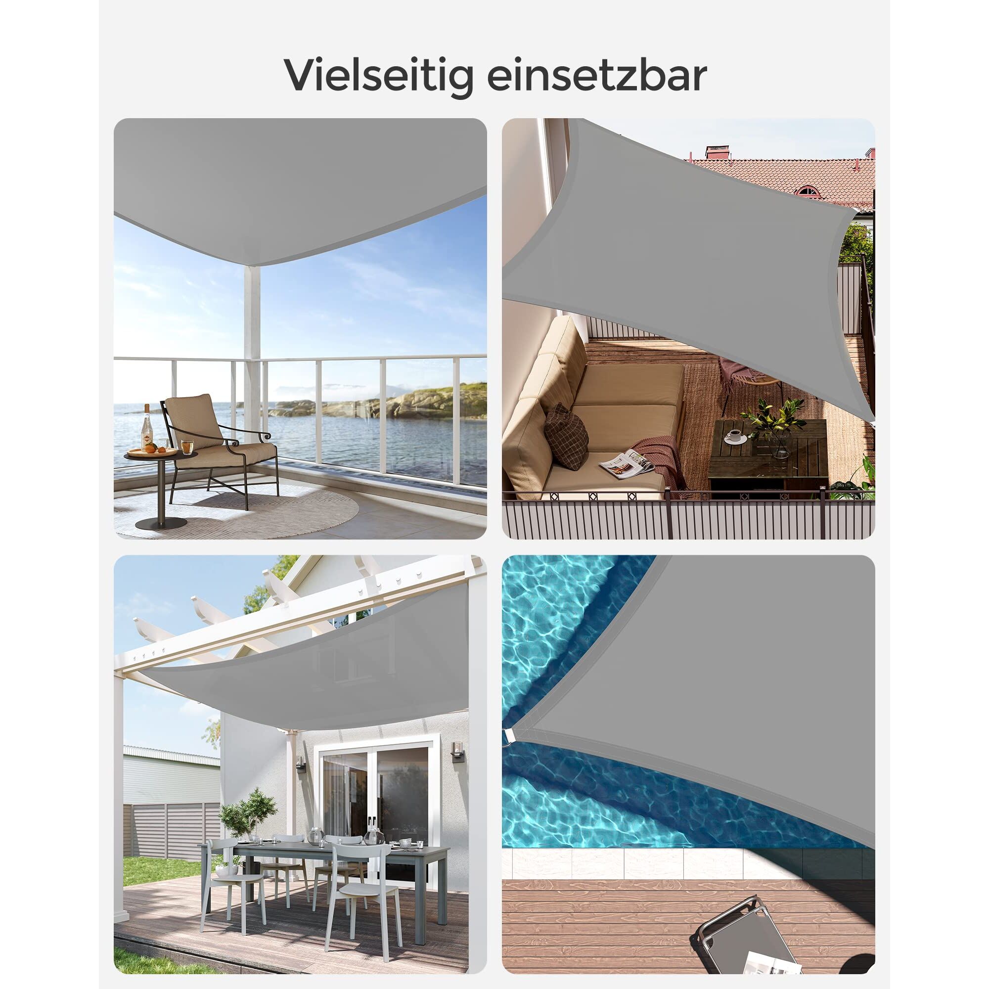 Für die Montage ist kein Werkzeug nötig! Legen Sie das Sonnensegel ausgebreitet an die Stelle, an welcher Sie den Sonnenschutz benötigen. Suchen Sie sich dann 4 Fixpunkte, an welchen Sie die beiliegenden Seile befestigen möchten. Diese sind 2 m lang, finden Sie also Bäume, Pfähle oder andere standfeste Gegenstände in diesem Radius. Sodann werden die Seile an den Befestigungspunkten sowie an den robusten Schlaufen und Edelstahl-Ringen des Sonnensegels befestigt, sodass die Plane stramm und mit einem Neigungswinkel von mindestens 25 Grad gespannt werden kann. So läuft Regenwasser perfekt ab.Für welche Orte eignet sich dieser Sonnenschutz?