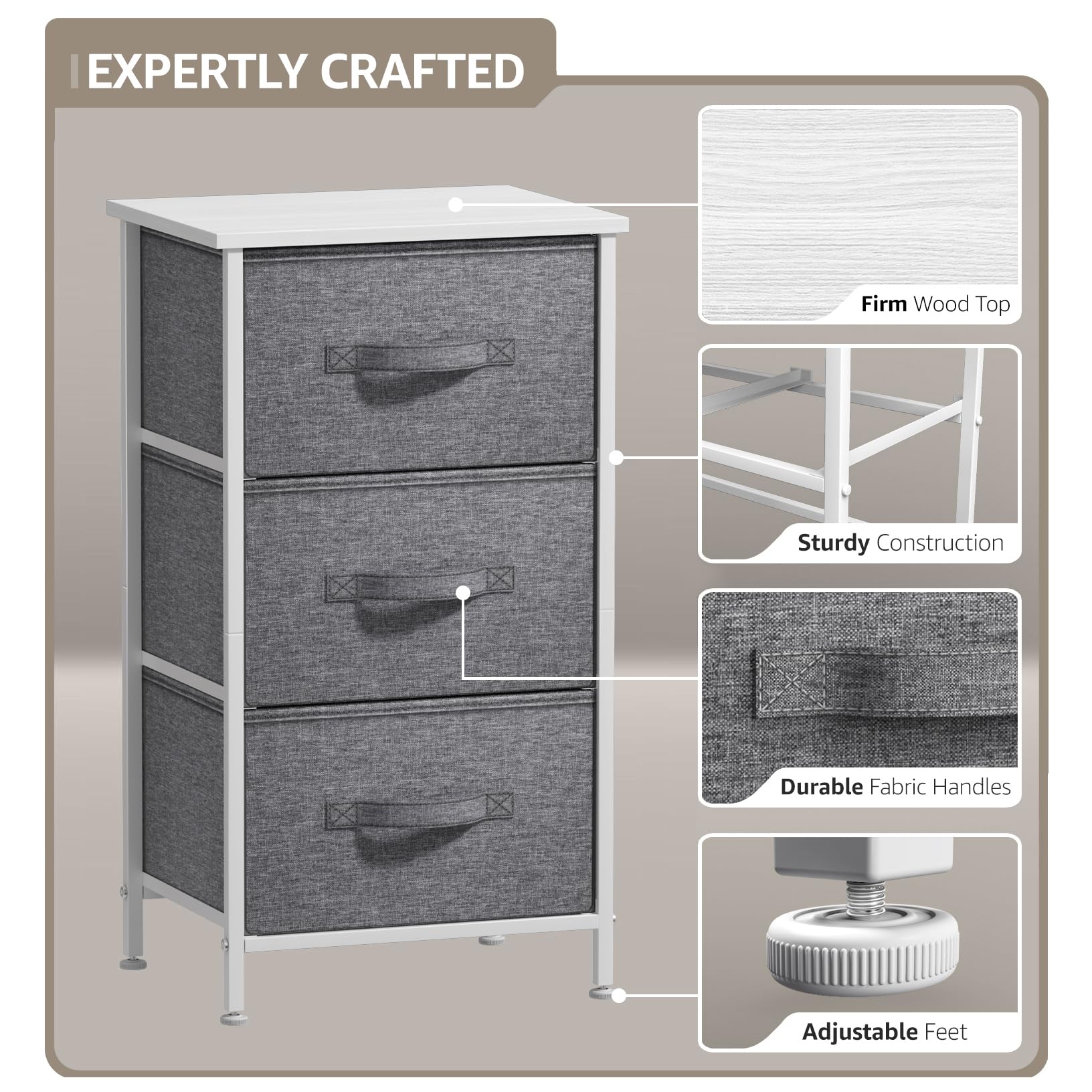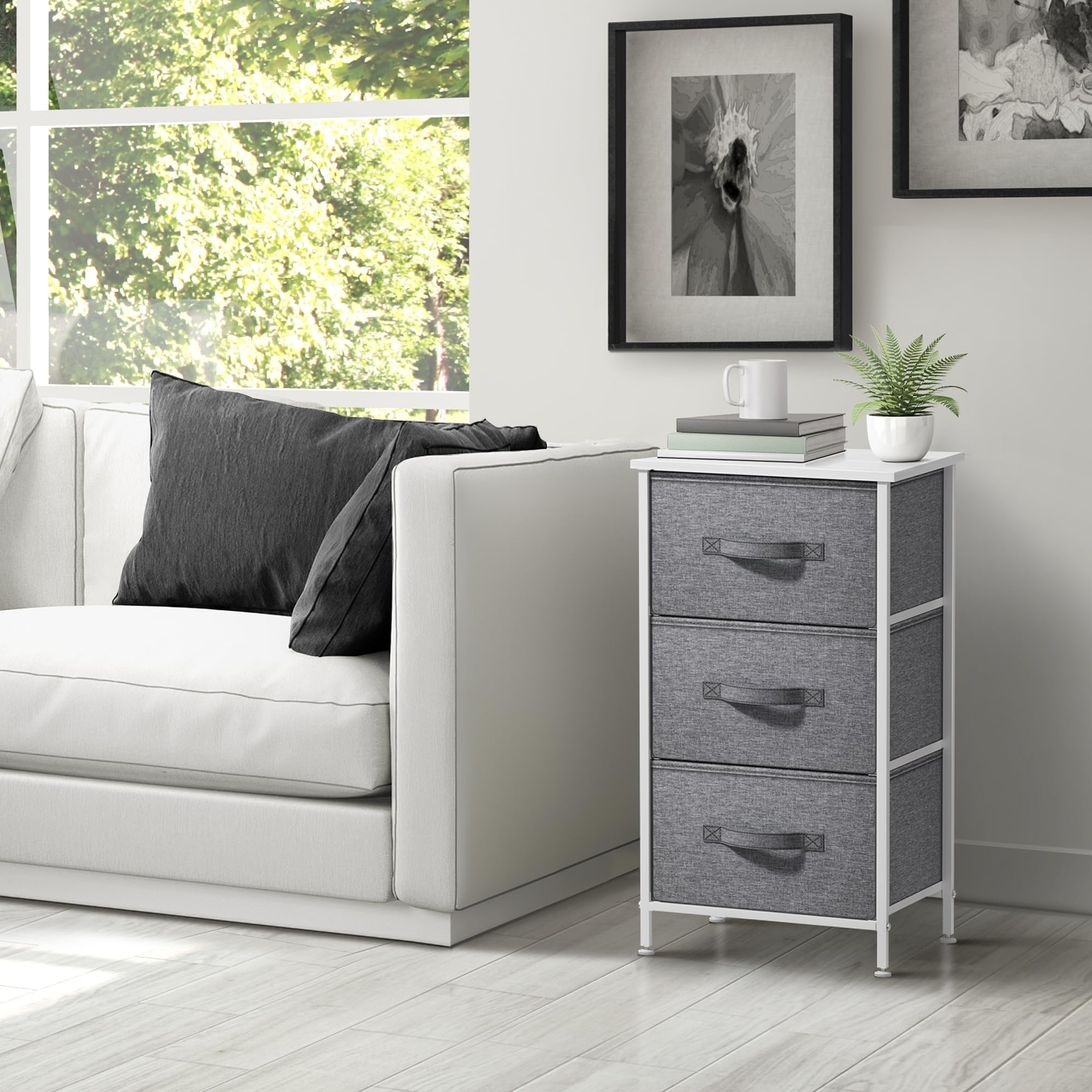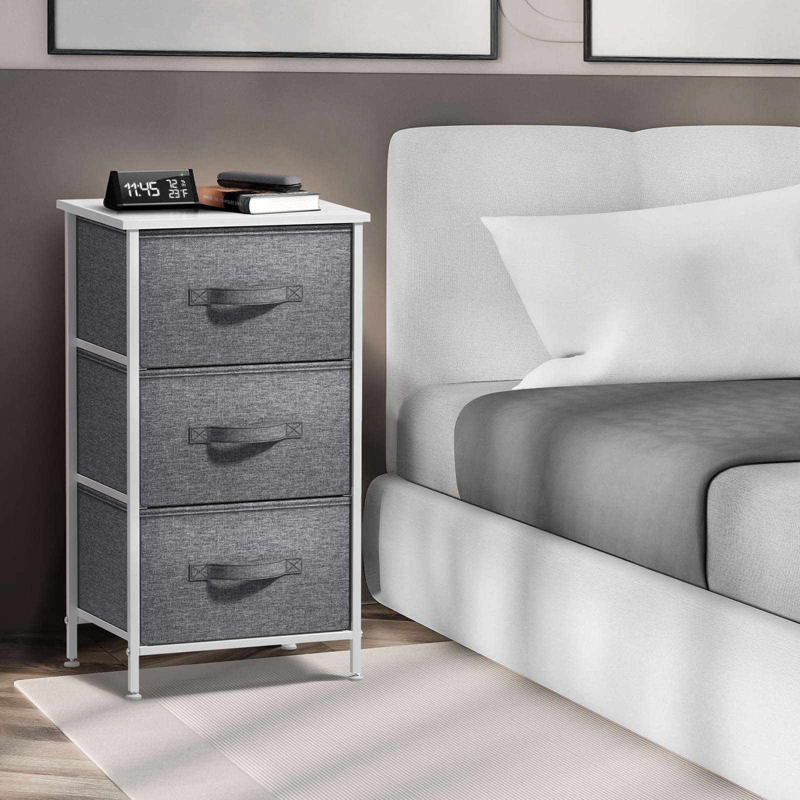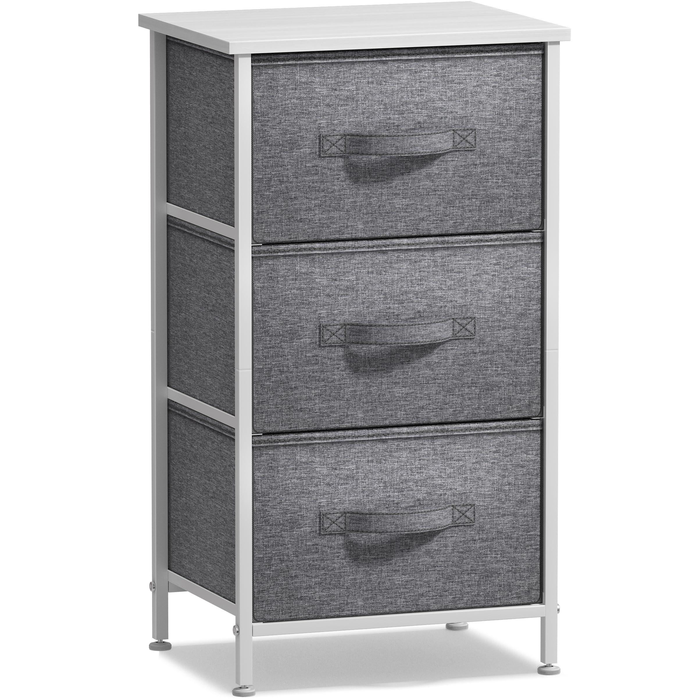 Sorbus Nachttisch mit 3 Schubladen – Nachttischmöbel & Akzentbeistelltisch Aufbewahrungsturm für Zuhause, Schlafzimmerzubehör, Büro, Holzplatte, leicht zu ziehende Stoffkörbe (weiss/grau)