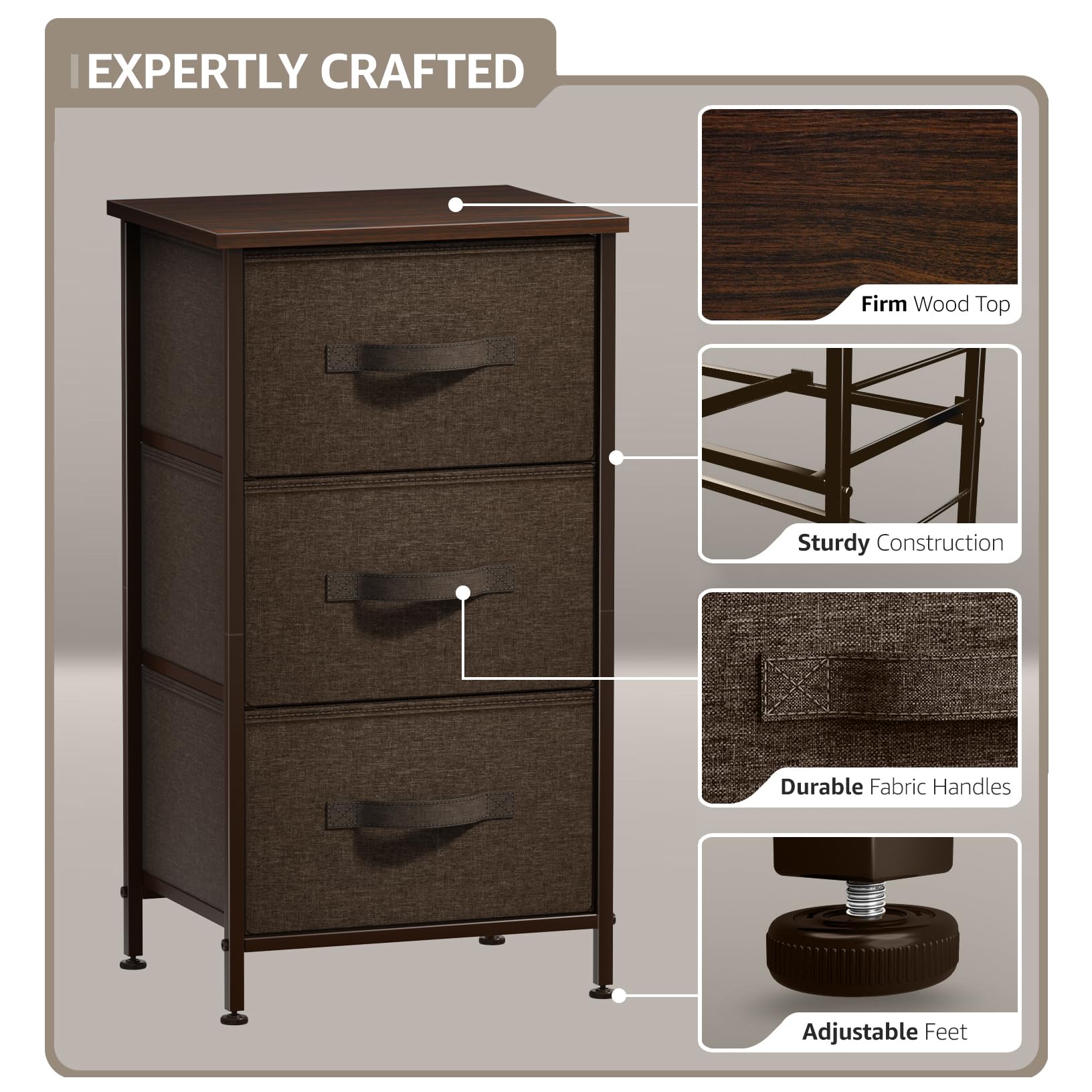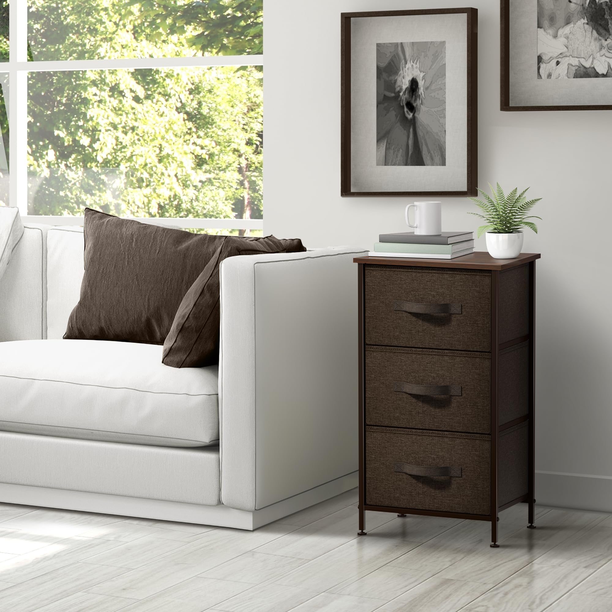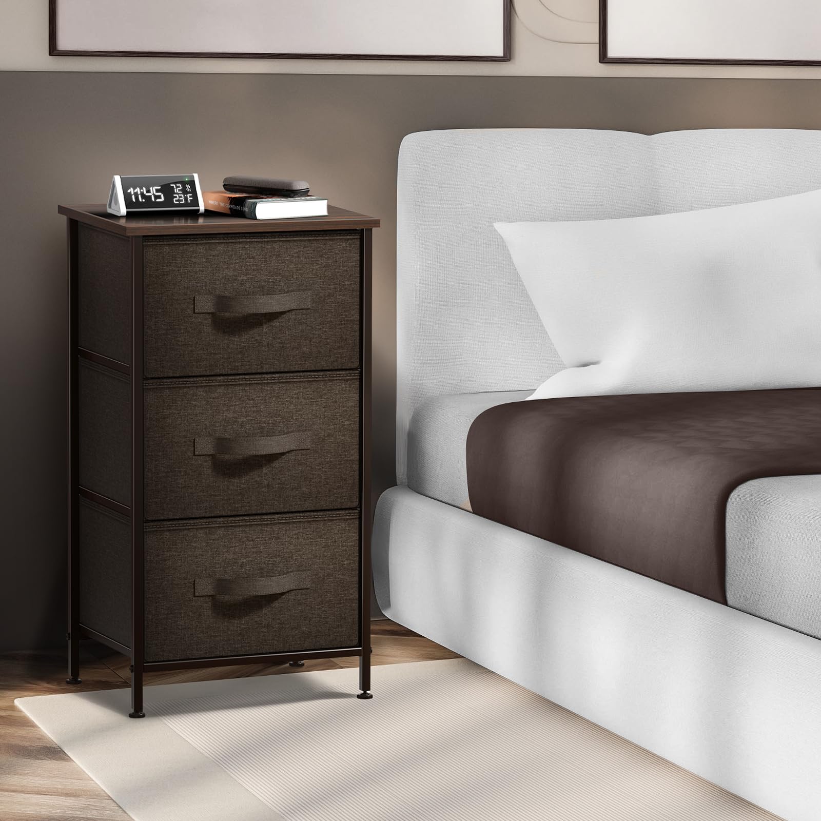 Sorbus Nachttisch mit 3 Schubladen – Nachttischmöbel & Akzentbeistelltisch Aufbewahrungsturm für Zuhause, Schlafzimmerzubehör, Büro, Holzplatte, leicht zu ziehende Stoffkörbe (braun)