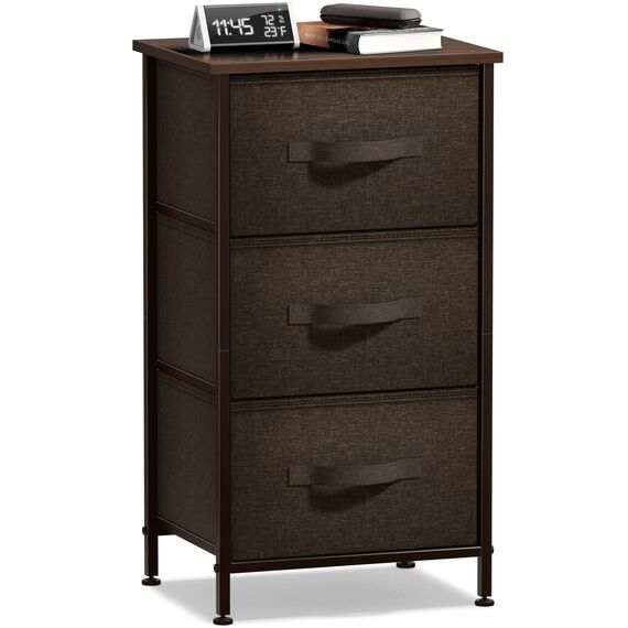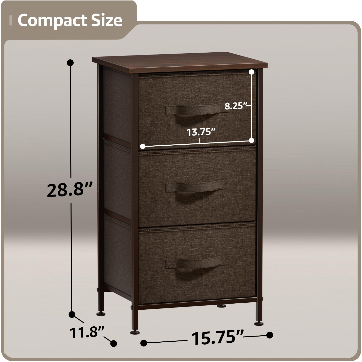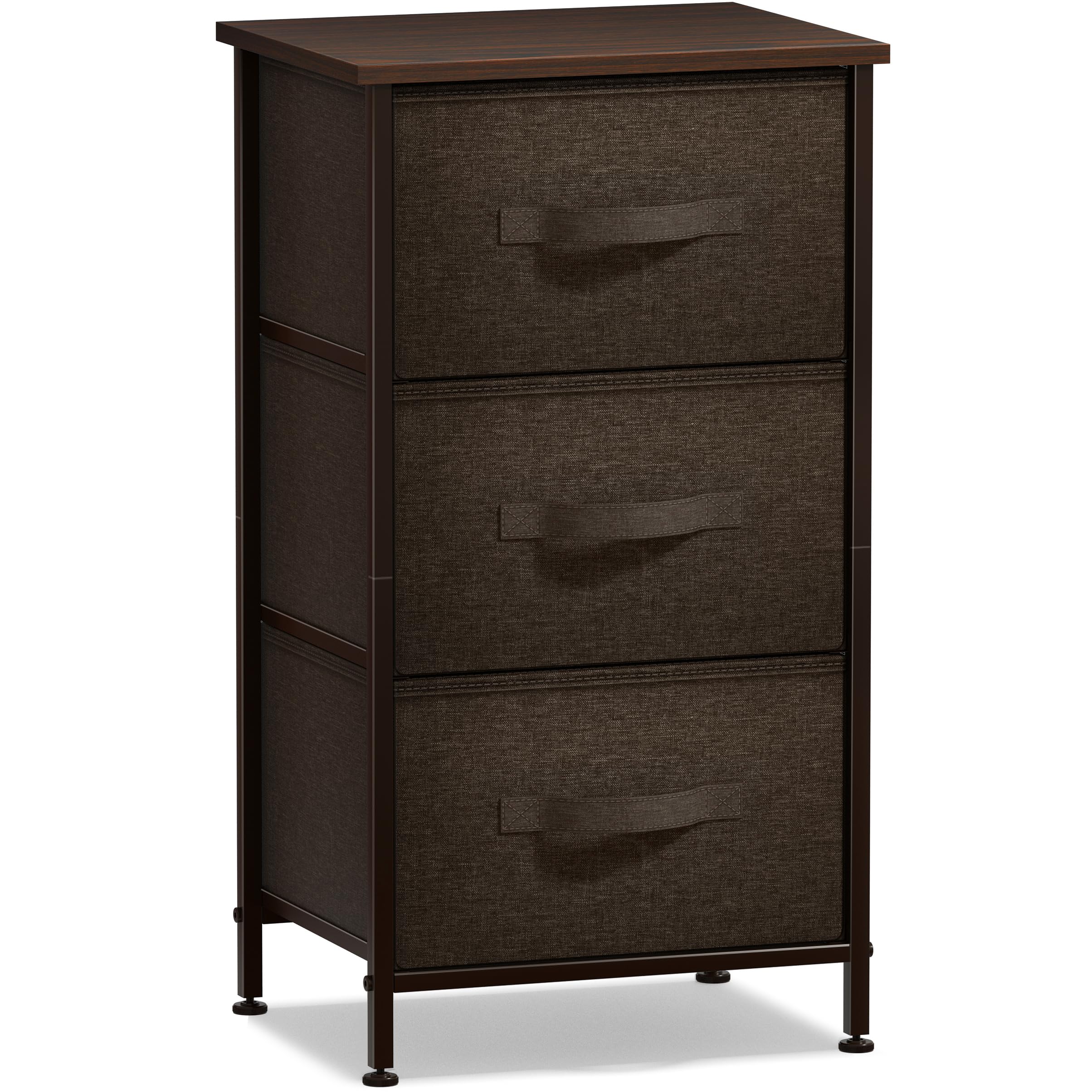 Sorbus Nachttisch mit 3 Schubladen – Nachttischmöbel & Akzentbeistelltisch Aufbewahrungsturm für Zuhause, Schlafzimmerzubehör, Büro, Holzplatte, leicht zu ziehende Stoffkörbe (braun)