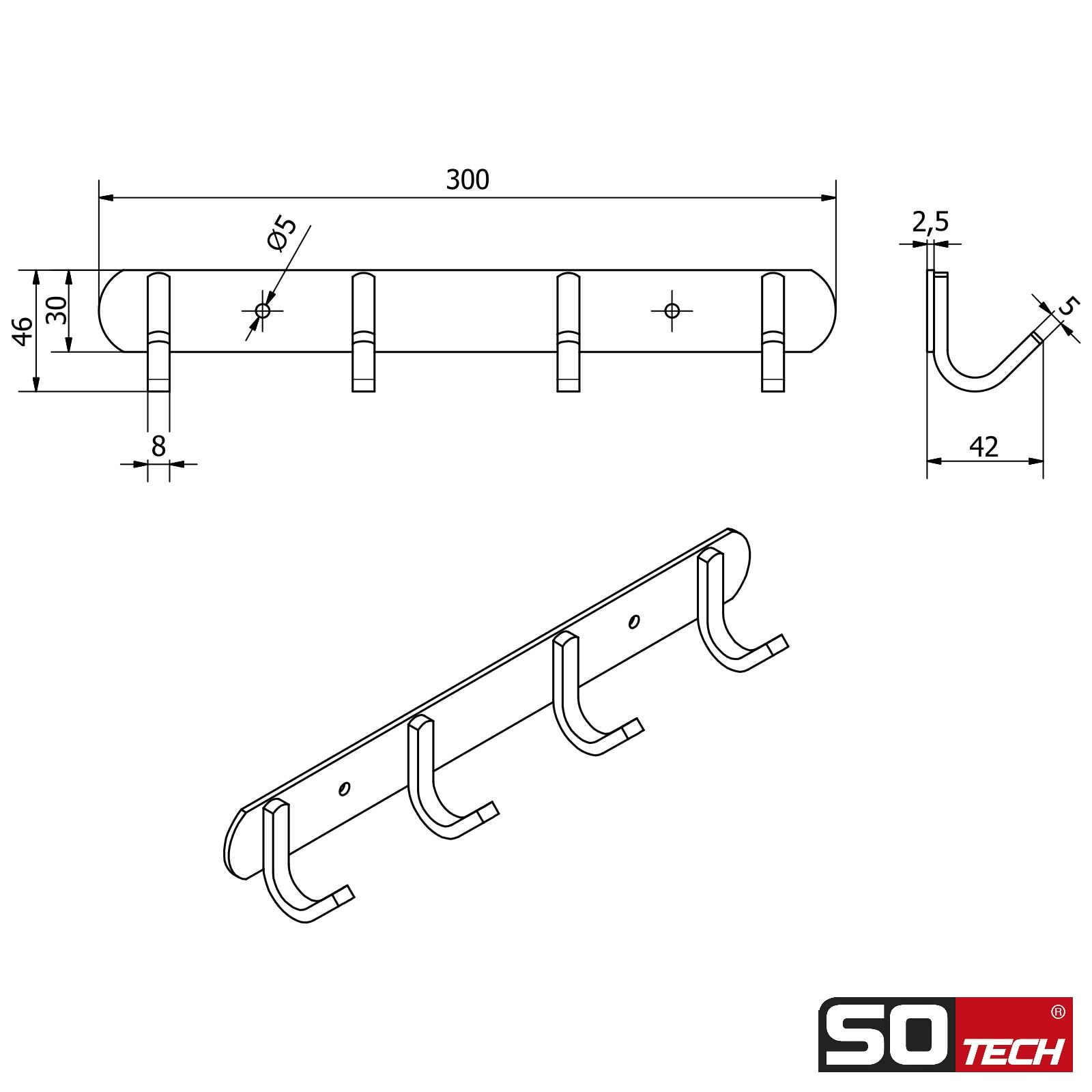 SOTECH 4er Hakenleiste Samu für Kleidung und Schlüssel