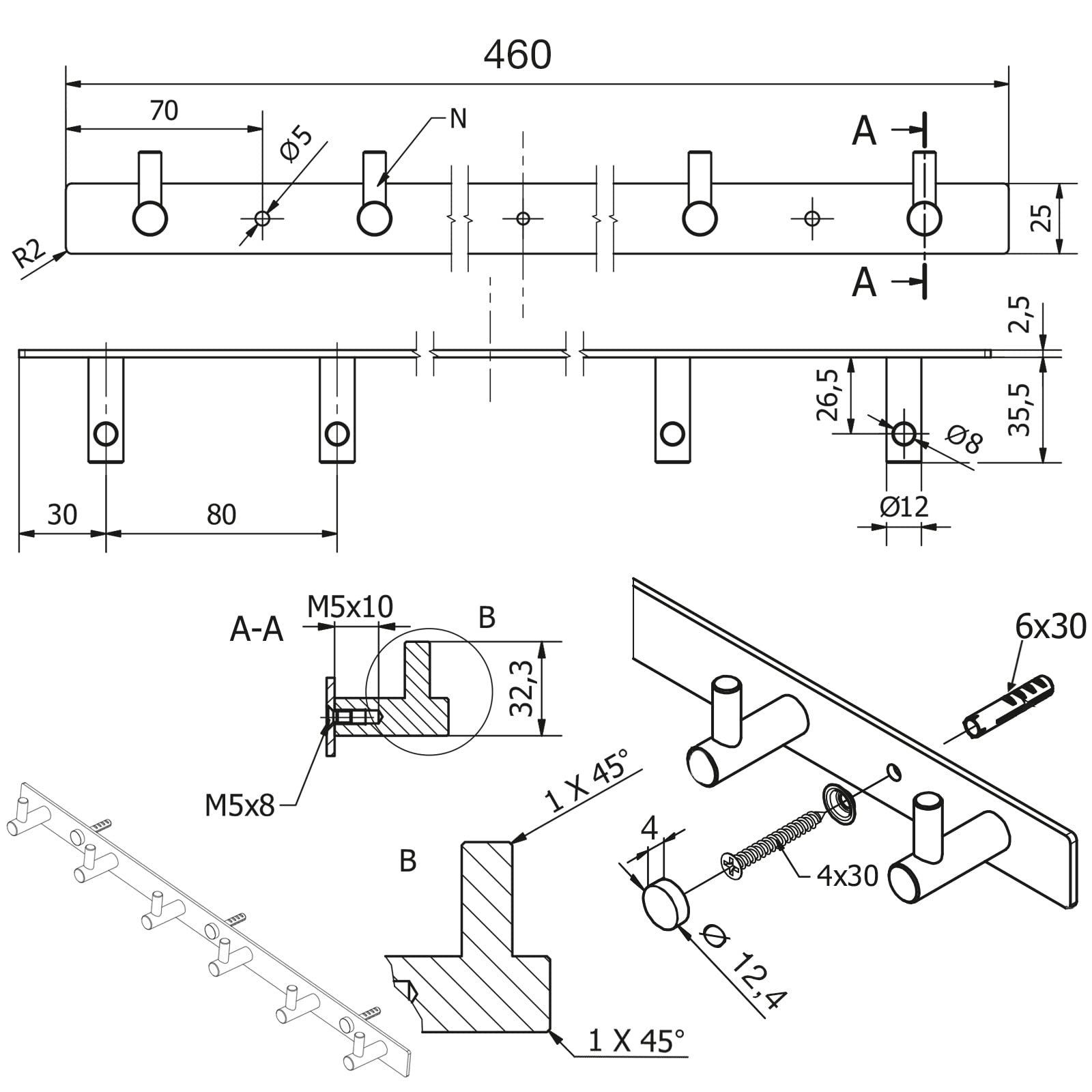 Hakenleiste mit 6 Haken inkl. Befestigungsset mit Fischer-Dübel