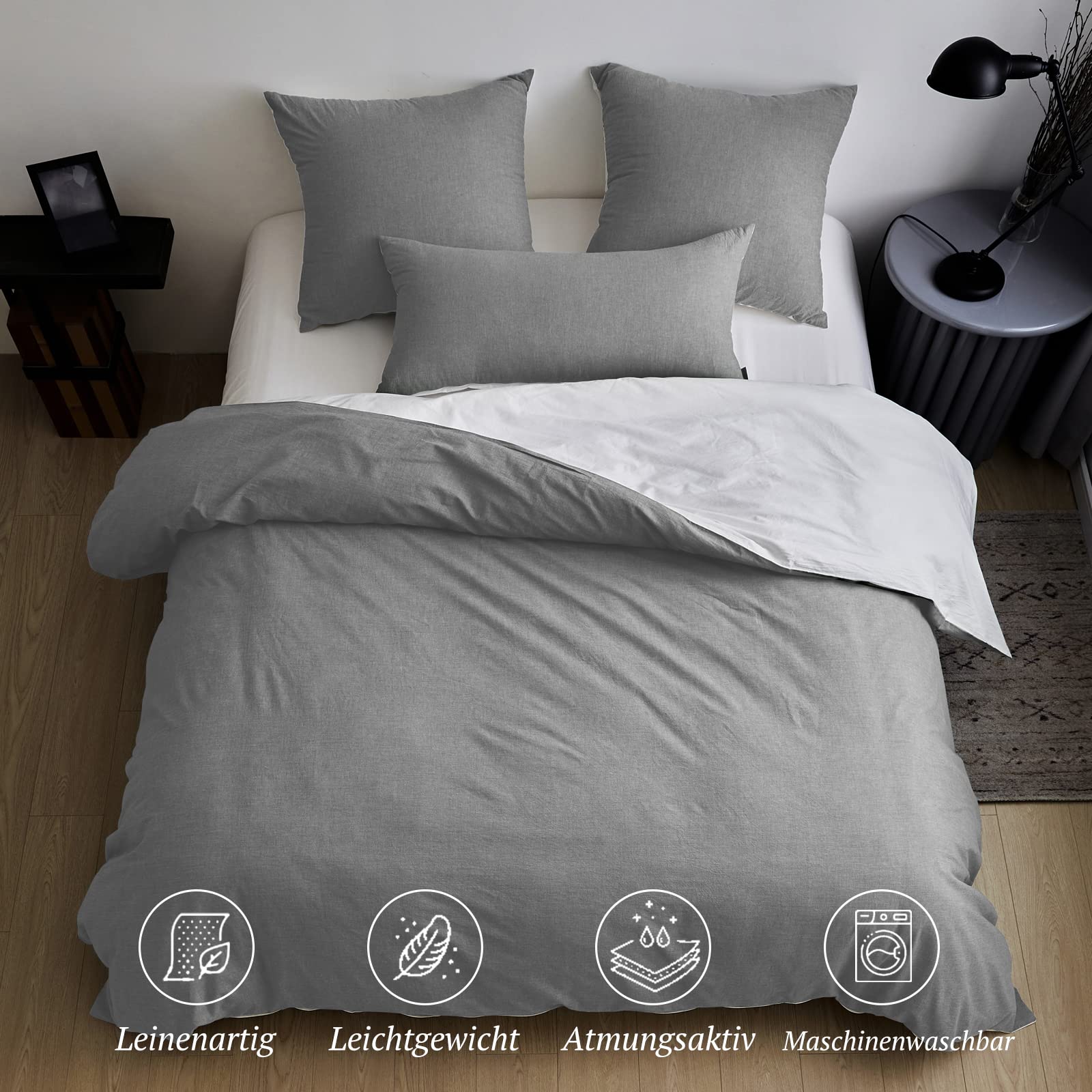 SOULFUL Bettwäsche-Sets aus gewaschener Baumwolle, SOULFUL Bettwäsche 220 x 240 cm, 3-teilige Bettwäsche-Sets aus Baumwolle, rauchgrau mit Reissverschluss, ähnliche Textur wie steingewaschenes Leinen, inklusive 1 Bettbezug 220 x 240 cm und 2 Kissenbezügen 80 x 80 cm, 100 % gewaschen Baumwolle: Das SOULFUL-Bettbezug-Set besteht aus 100 % Baumwolle und ist für zusätzlichen Komfort und Haltbarkeit vorgeschrumpft. Ein unabhängiges Zertifizierungssystem stellt sicher, dass die Textilien in einer Öko-Tex Standard 100-Fabrik hergestellt werden und hohen Sicherheits- und Umweltstandards entsprechen. Natürliches Design: Dieser Bettbezug besteht aus 100 % gewaschener Baumwolle, der Stoff wurde in einem speziellen Verfahren verarbeitet und die Oberfläche des Stoffes fühlt sich leicht natürlich knitterig an. Das Crinkle-Finish sorgt für einen lässigen Vintage-Look. Behält die Faltenstruktur ohne Bügeln bei. Verdeckter Reissverschluss und 4 Eckbänder: Mit dem Reissverschluss können Sie die Bettdecke einfach anbringen und abnehmen. Knopfabdeckungen aus Holz sind haltbarer und weicher. Vier Eckbänder sichern Ihre Bettdecke unter der Tagesdecke. Tolles Hautgefühl: Dieses Bettwäscheset ist Stone-washed“, was ihm ein ähnliches Gefühl wie Leinenbettwäsche verleiht. Ebenso atmungsaktiv wie saugfähig bietet es zu jeder Jahreszeit, selbst in heissen Sommernächten, ein besonders angenehmes Hautgefühl. 100 % Nachverkaufs