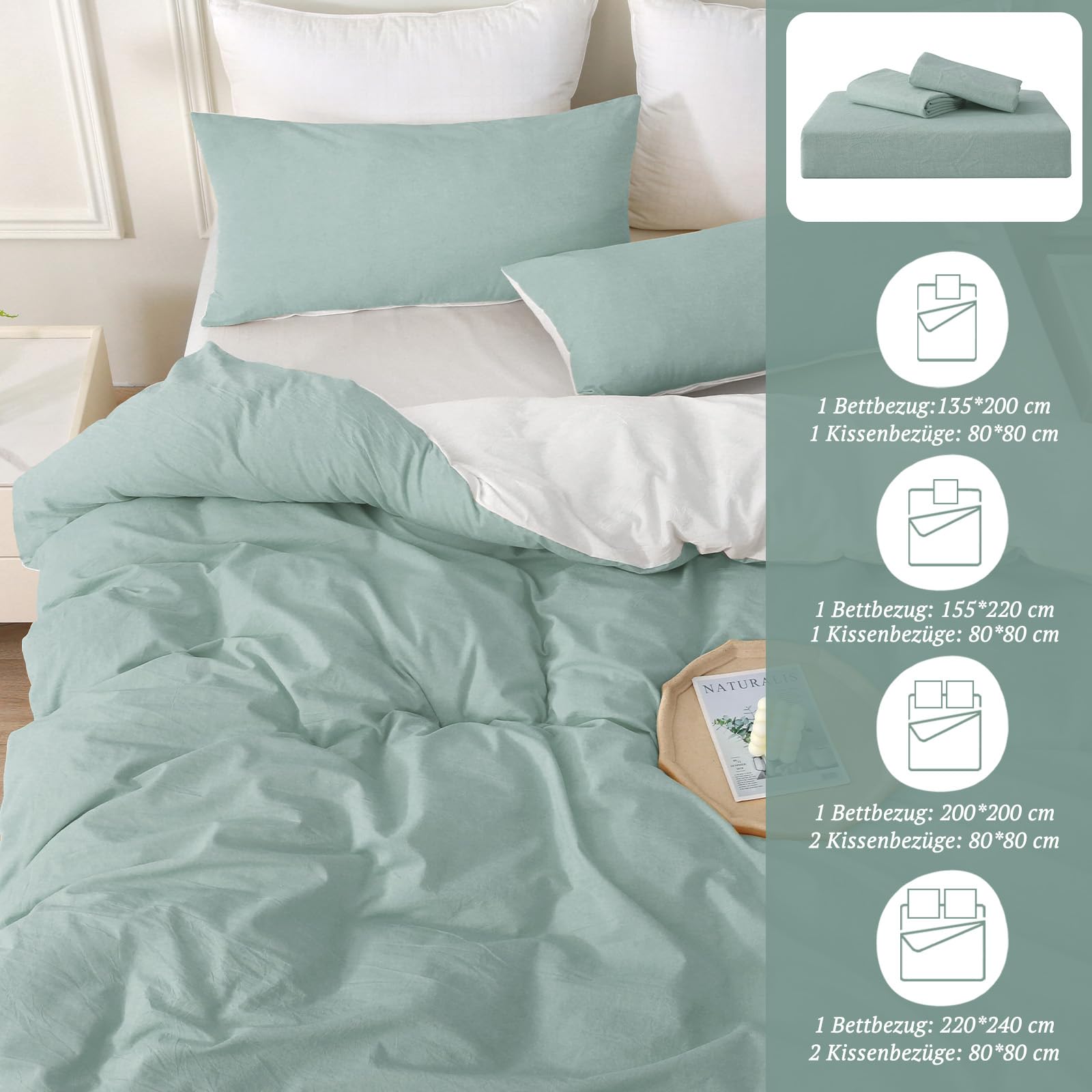 SOULFUL Bettwäsche 220x240 Baumwolle 3 Teilig, Bettwäsche-Sets Aquagrün mit Reissverschluss, Ähnliche Textur wie Stone Washed Leinen, Enthält 1 Bettbezug 220x240 und 2 Kissenbezug 80x80