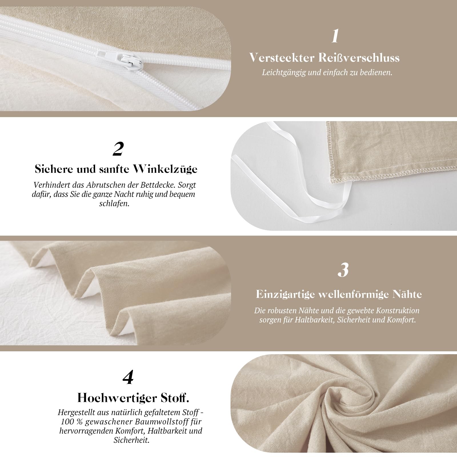 SOULFUL BettwäscheSets aus gewaschener Baumwolle, SOULFUL Bettwäsche 155 x 220 cm, 2teilige BettwäscheSets aus Baumwolle, Kamelbeige mit Reissverschluss, ähnliche Textur wie steingewaschenes Leinen, inklusive 1 Bettbezug 155 x 220 cm und 1 Kissenbezug 80 x 80 cm, 100 % gewaschen Baumwolle: Das SOULFULBettbezugSet besteht aus 100 % Baumwolle und ist für zusätzlichen Komfort und Haltbarkeit vorgeschrumpft. Ein unabhängiges Zertifizierungssystem stellt sicher, dass die Textilien in einer ÖkoTex Standard 100Fabrik hergestellt werden und hohen Sicherheitsund Umweltstandards entsprechen. Natürliches Design: Dieser Bettbezug besteht aus 100 % gewaschener Baumwolle, der Stoff wurde in einem speziellen Verfahren verarbeitet und die Oberfläche des Stoffes fühlt sich leicht natürlich knitterig an. Das CrinkleFinish sorgt für einen lässigen VintageLook. Behält die Faltenstruktur ohne Bügeln bei. Verdeckter Reissverschluss und 4 Eckbänder: Mit dem Reissverschluss können Sie die Bettdecke einfach anbringen und abnehmen. Knopfabdeckungen aus Holz sind haltbarer und weicher. Vier Eckbänder sichern Ihre Bettdecke unter der Tagesdecke. Tolles Hautgefühl: Dieses Bettwäscheset ist Stonewashed, was ihm ein ähnliches Gefühl wie Leinenbettwäsche verleiht. Ebenso atmungsaktiv wie saugfähig bietet es zu jeder Jahreszeit, selbst in heissen Sommernächten, ein besonders angenehmes Hautgefühl. 100 % Nachverkaufs