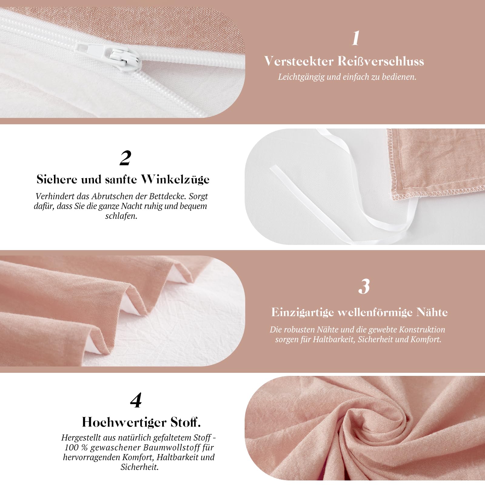 - 【Verdeckter Reissverschluss und 4 Eckbänder】 Mit dem Reissverschluss können Sie die Bettdecke einfach anbringen und entfernen. Knopfbezüge aus Holz sind haltbarer und weicher. Vier Eckbänder sichern Ihre Bettdecke unter der Tagesdecke.