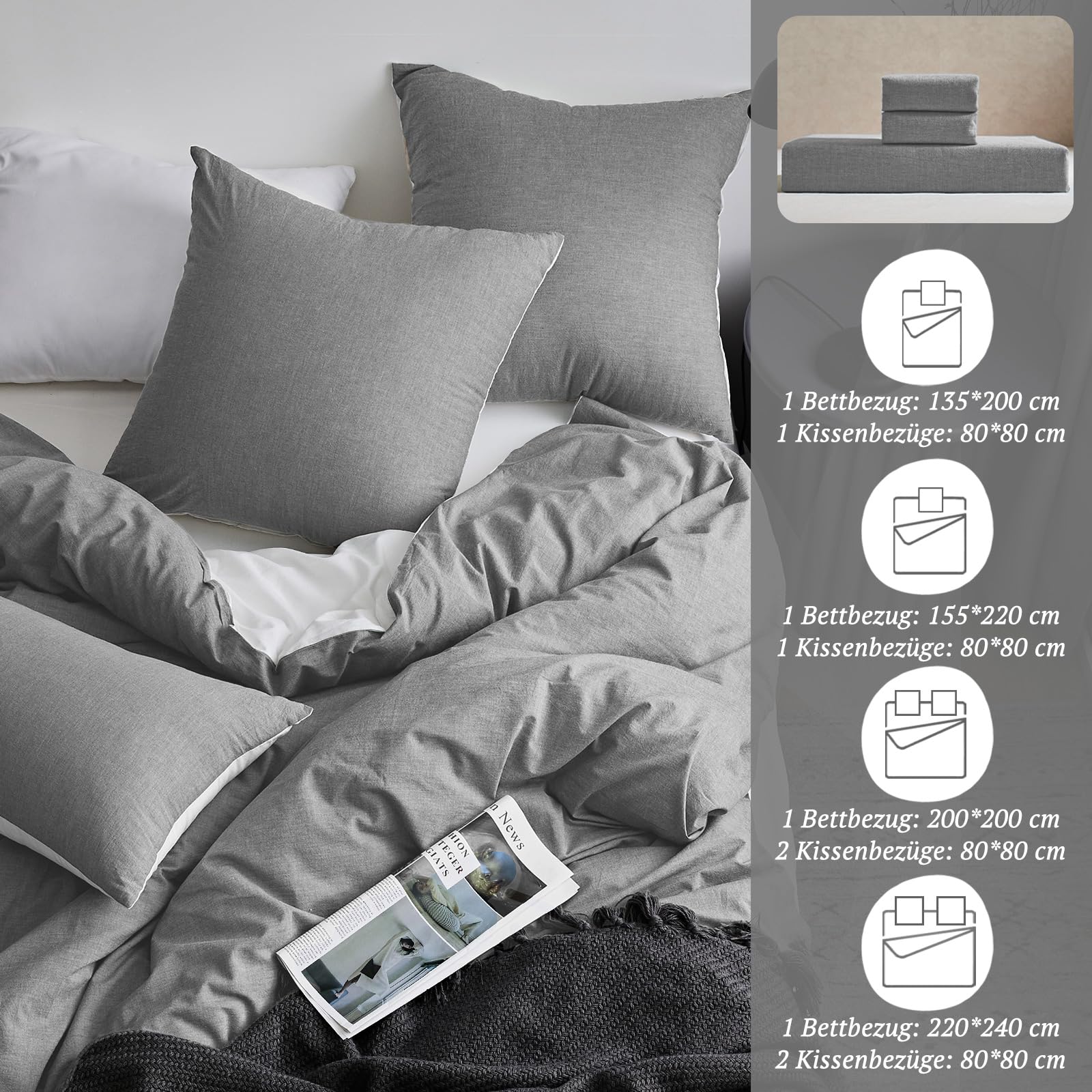 SOULFUL Bettwäsche 135x200 Baumwolle 4 Teilig, Bettwäsche-Sets Rauchgrau mit Reissverschluss, Ähnliche Textur wie Stone Washed Leinen, Enthält 2 Bettbezug 135x200 und 2 Kissenbezug 80x80