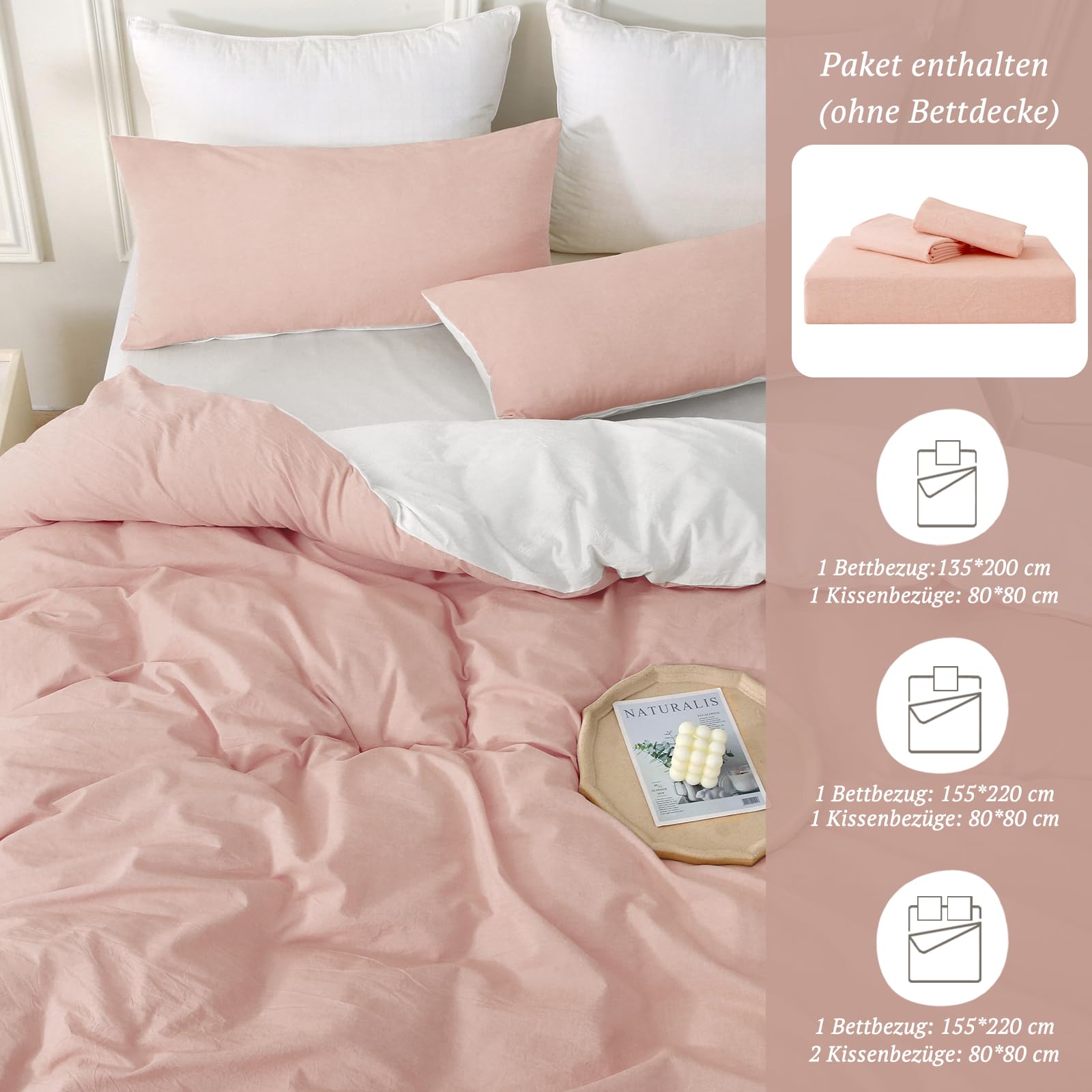 SOULFUL Bettwäsche 220x240 Baumwolle 3 Teilig, Bettwäsche-Sets Altrosa mit Reissverschluss, Ähnliche Textur wie Stone Washed Leinen, Enthält 1 Bettbezug 220x240 und 2 Kissenbezug 80x80