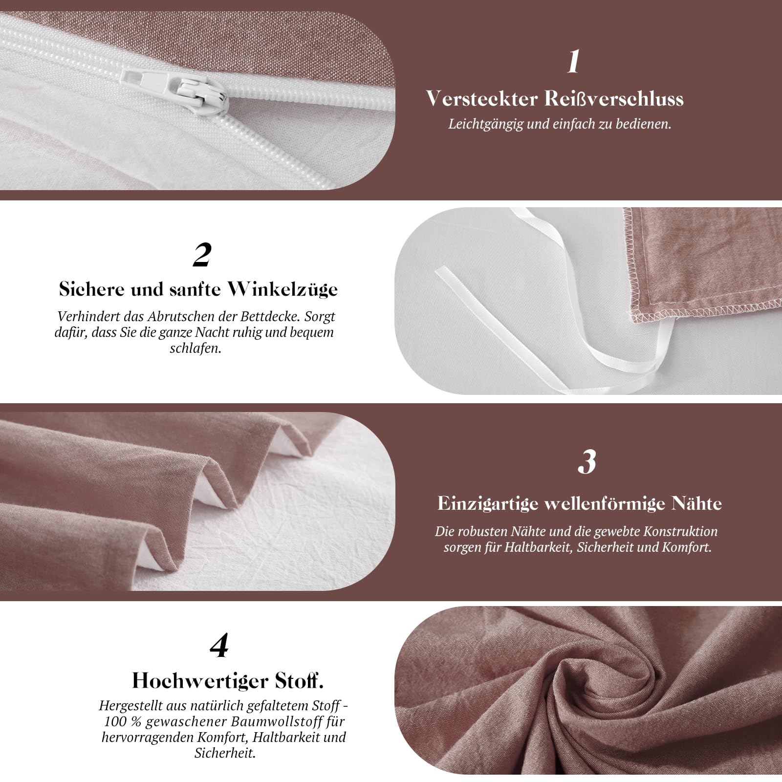 - 【Verdeckter Reissverschluss und 4 Eckbänder】 Mit dem Reissverschluss können Sie die Bettdecke einfach anbringen und entfernen. Knopfbezüge aus Holz sind haltbarer und weicher. Vier Eckbänder sichern Ihre Bettdecke unter der Tagesdecke.