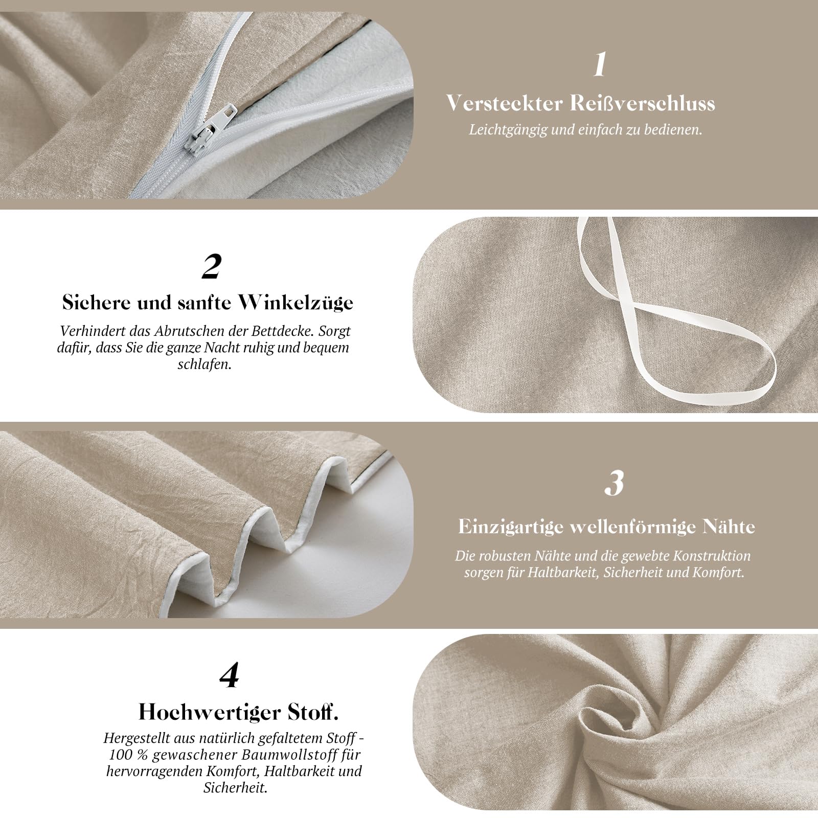- 【Verdeckter Reissverschluss und 4 Eckbänder】 Mit dem Reissverschluss können Sie die Bettdecke einfach anbringen und entfernen. Knopfbezüge aus Holz sind haltbarer und weicher. Vier Eckbänder sichern Ihre Bettdecke unter der Tagesdecke.