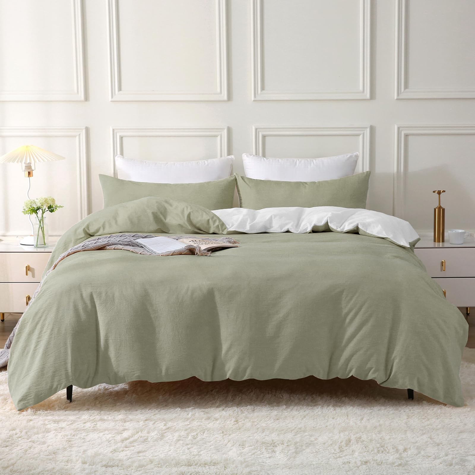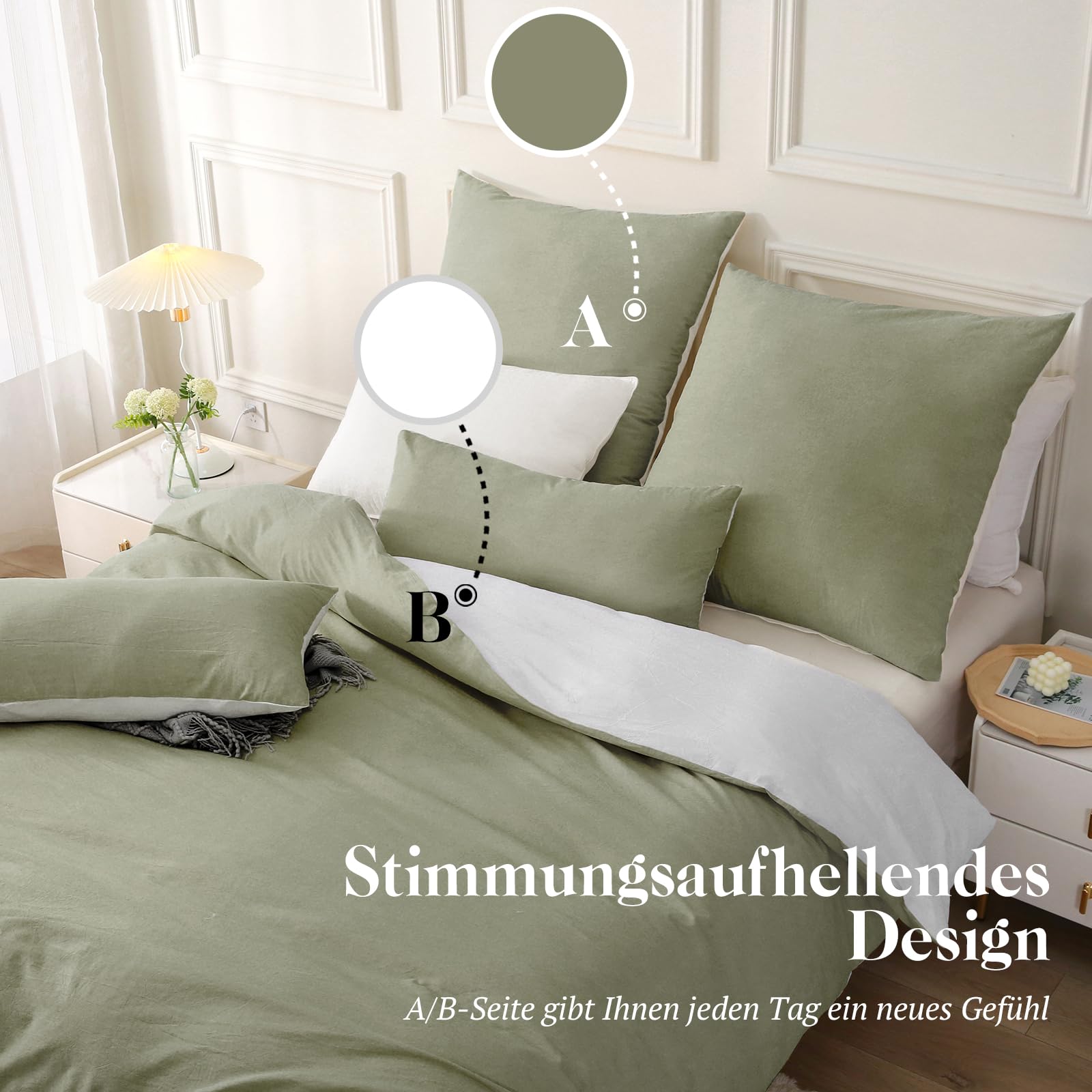 SOULFUL Bettwäsche 200x200 Baumwolle 3 Teilig, Bettwäsche-Sets Vintagegrün mit Reissverschluss, Ähnliche Textur wie Stone Washed Leinen, Enthält 1 Bettbezug 200x200 und 2 Kissenbezug 80x80