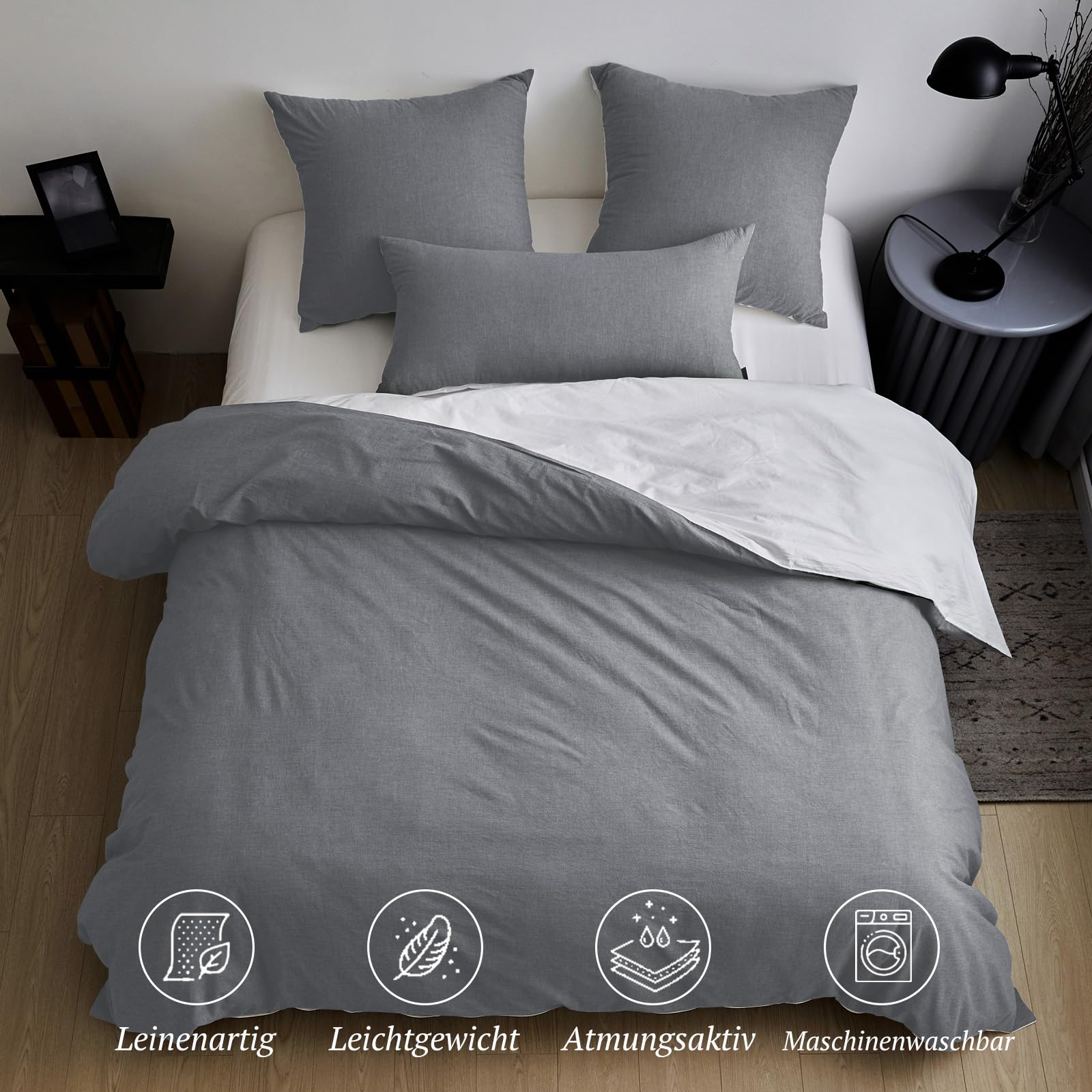 SOULFUL Bettwäsche 200x200 Baumwolle 3 Teilig, Bettwäsche-Sets Dunkelgrau2 mit Reissverschluss, Ähnliche Textur wie Stone Washed Leinen, Enthält 1 Bettbezug 200x200 und 2 Kissenbezug 80x80