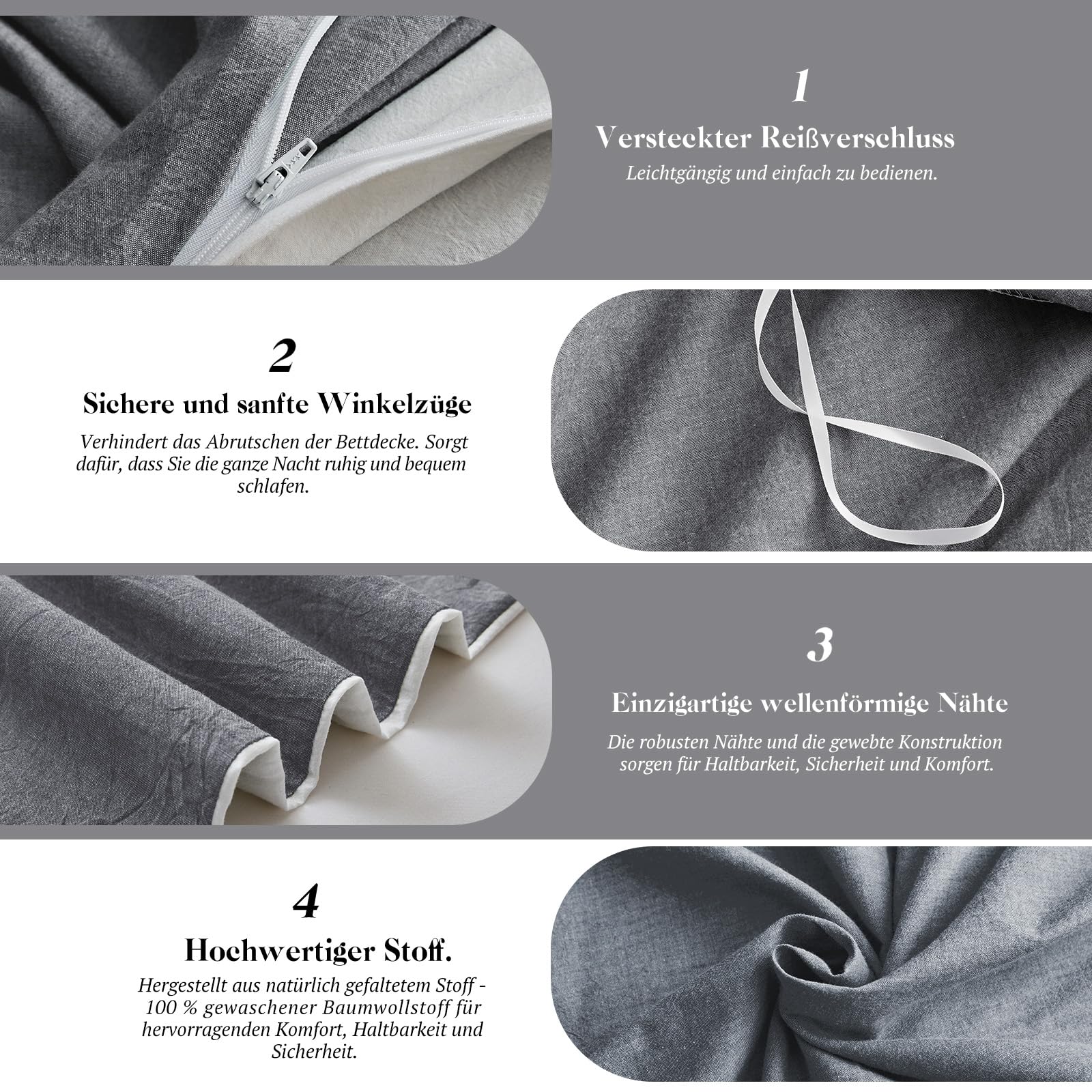 SOULFUL Bettwäsche-Sets aus gewaschener Baumwolle, SOULFUL Bettwäsche 200 x 200 cm, Baumwolle, 3-teiliges Bettwäsche-Set, dunkelgrau, 2 mit Reissverschluss, ähnliche Textur wie Stone Washed Leinen, inklusive 1 Bettbezug 200 x 200 cm und 2 Kissenbezügen 80 x 80 cm, 100 % Gewaschene Baumwolle: Das SOULFUL-Bettbezug-Set besteht aus 100 % Baumwolle und ist für zusätzlichen Komfort und Haltbarkeit vorgeschrumpft. Ein unabhängiges Zertifizierungssystem stellt sicher, dass die Textilien in einer Öko-Tex Standard 100-Fabrik hergestellt werden und hohen Sicherheits- und Umweltstandards entsprechen. Natürliches Design: Dieser Bettbezug besteht aus 100 % gewaschener Baumwolle, der Stoff wurde in einem speziellen Verfahren verarbeitet und die Oberfläche des Stoffes fühlt sich leicht natürlich knitterig an. Das Crinkle-Finish sorgt für einen lässigen Vintage-Look. Behält die Faltenstruktur ohne Bügeln bei. Verdeckter Reissverschluss und 4 Eckbänder: Mit dem Reissverschluss können Sie die Bettdecke einfach anbringen und abnehmen. Knopfabdeckungen aus Holz sind haltbarer und weicher. Vier Eckbänder sichern Ihre Bettdecke unter der Tagesdecke. Tolles Hautgefühl: Dieses Bettwäscheset ist Stone-washed“, was ihm ein ähnliches Gefühl wie Leinenbettwäsche verleiht. Ebenso atmungsaktiv wie saugfähig bietet es zu jeder Jahreszeit, selbst in heissen Sommernächten, ein besonders angenehmes Hautgefühl. 100 % Nachverkaufs