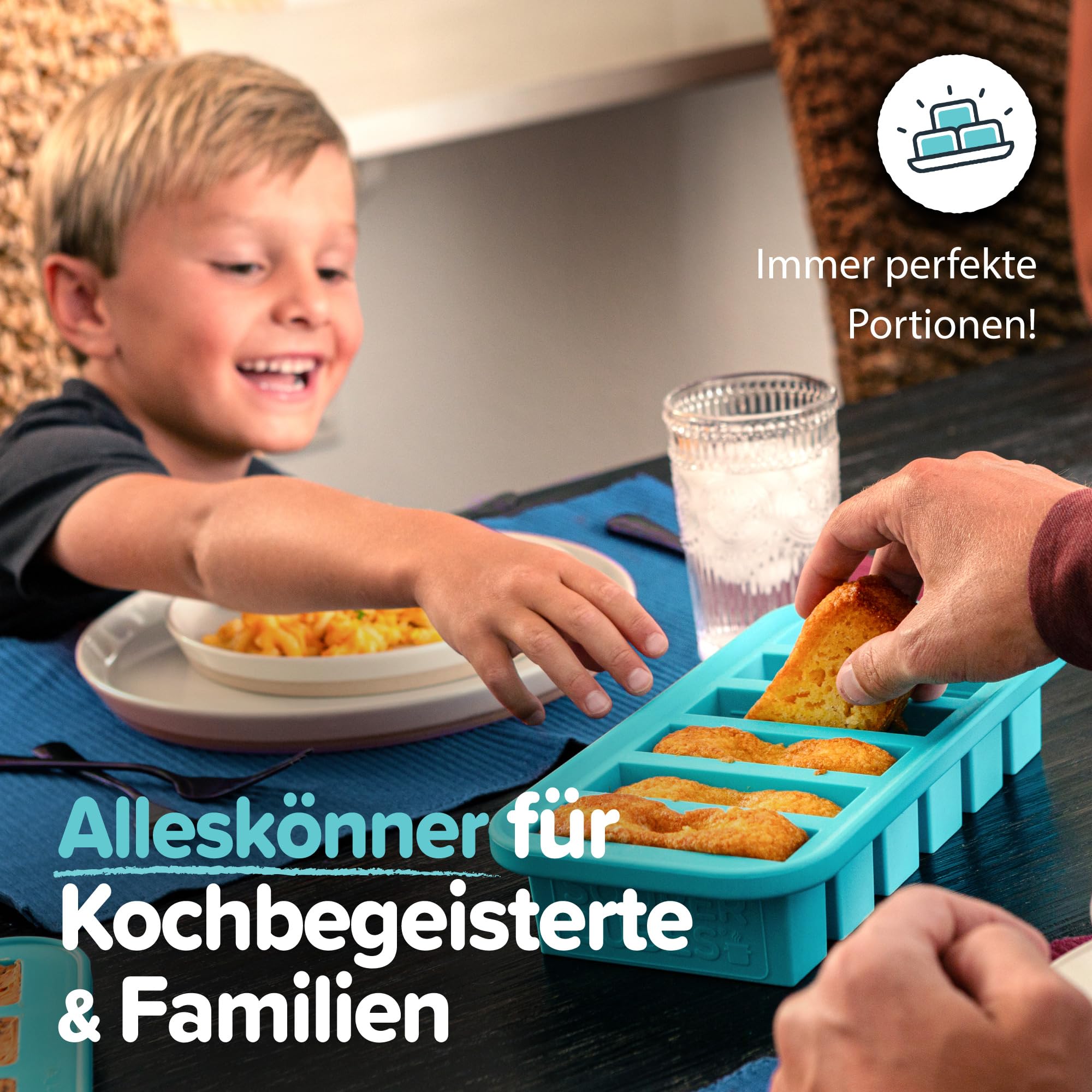 Frieren und lagern Sie komplette Mahlzeiten, Desserts und alle Lebensmittel in 2-Tassen-Portionen. Entfernen, aufwärmen und genau die Menge verwenden, die Sie benötigen. Souper Cubes Tabletts sind mit dicken Silikonwänden und einem Stahlrand ausgestattet, um das Tablett besonders stabil zu machen. Der transparente BPA-freie Kunststoffdeckel passt eng an, um Verschütten zu verhindern, Gerüche im Gefrierschrank fernzuhalten und ein einfaches Stapeln zu ermöglichen. Gehen Sie mit Vertrauen und Leichtigkeit zum Gefrierschrank. Hergestellt aus 100 % FDA-lebensmittelechtem Silikon. Fülllinien: 1 Tasse / 2 Tassen und 250 ml / 500 ml. Kein BPA, Blei, PVC oder Phthalate. Spülmaschinenfest. 4 2-Tassen-Würfel passen in einen Beutel. Ofenfest bis 250 °C (nur Tabletts). Masse der Tablett: 29,2 x 14 x 6,3 cm. Frozen "Cube" Masse: 10,5 x 10,8 x 5,7 cm. Shepherd's Pie Lasagne Erdbeer-Rhabarber Crisp Pozole Rojo Huhn Tikka Masala + Reisschalen Aqua