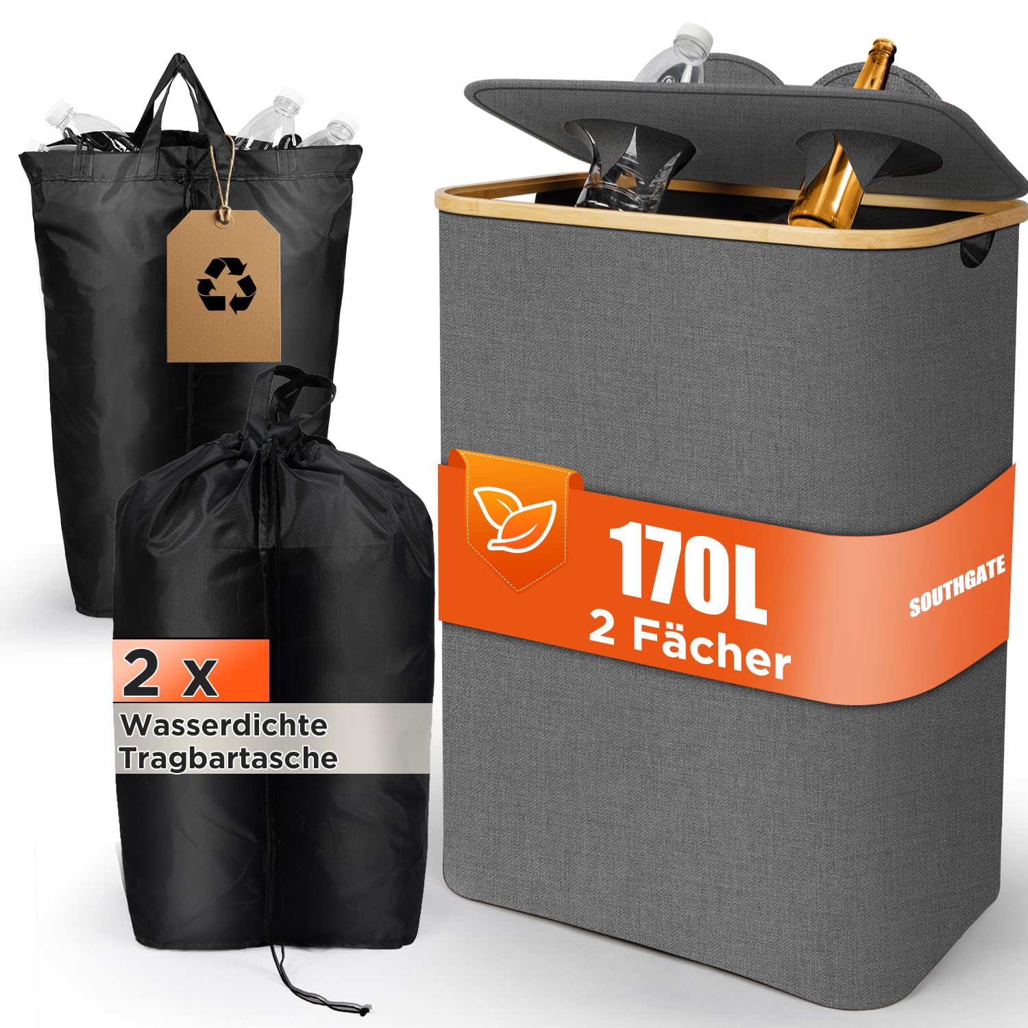 SOUTHGATE pfandflaschen sammelbehälter 2 Fächer, 170L Leergut-Organizer gross, Klappdeckel mit Silikon-Dichtung, 2 waschbare Taschen mit Kordelzug, faltbar 4 cm, für Keller & Abstellraum, Grau