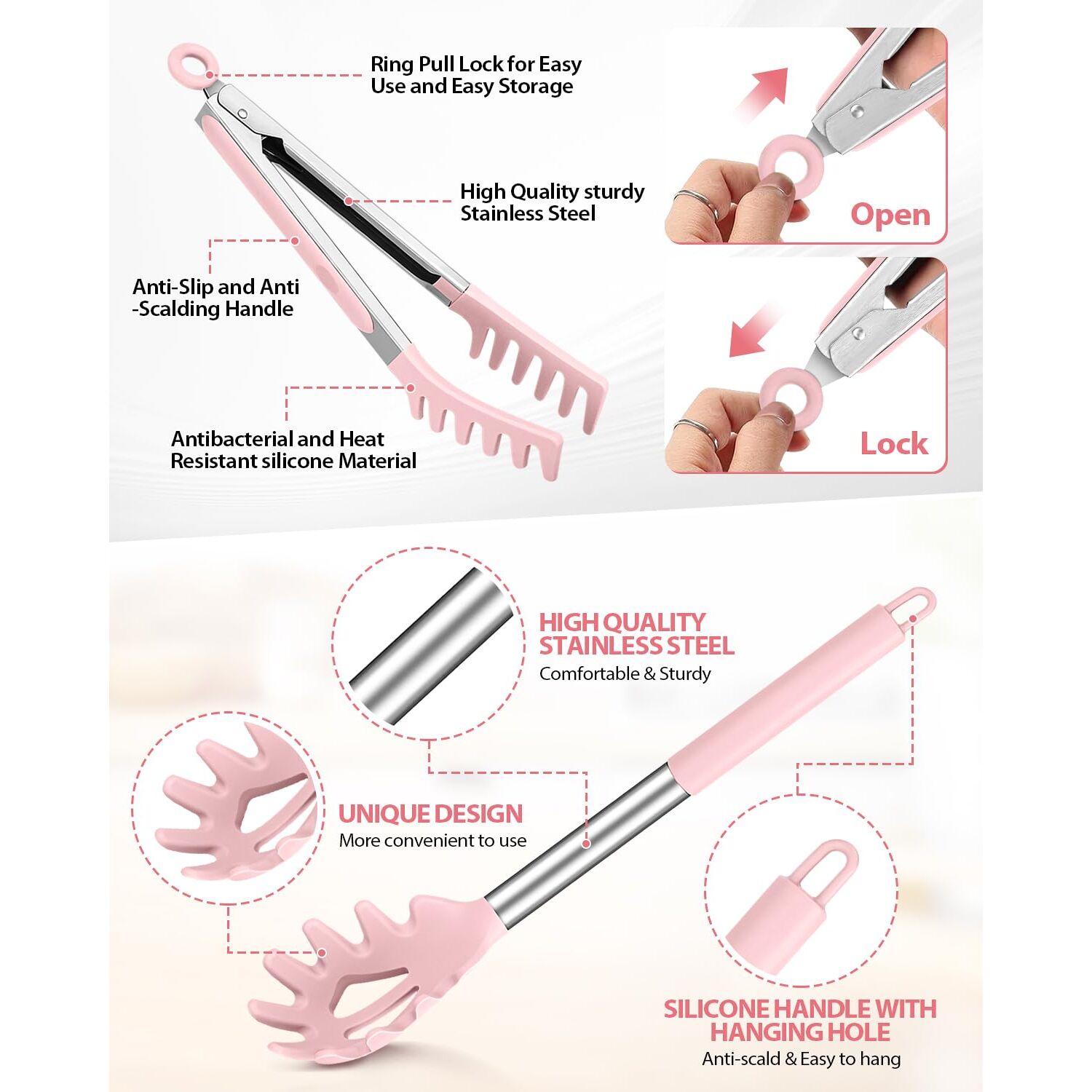 Spaghetti-Löffel und Nudelzange, Antihaft-Silikonlöffel, Serviergabel mit Zähnen und Edelstahlgriff, Lebensmittelclip für Nudeln, Rosa