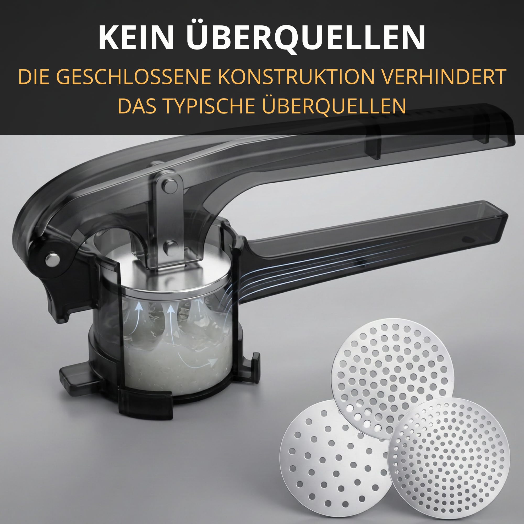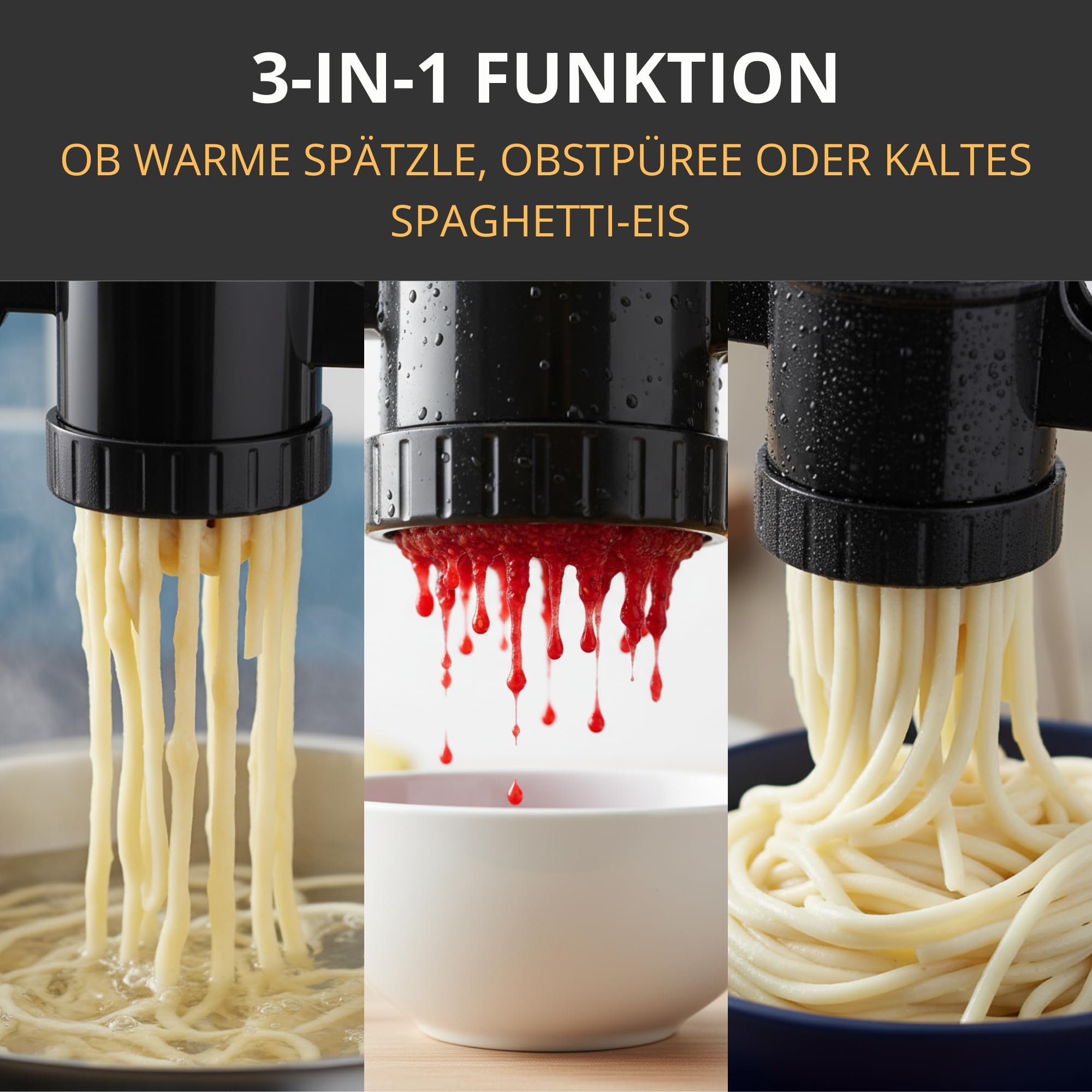 • 3IN1 Funktion - Ob Spätzlepresse, Kartoffelpresse oder Saftpresser, dieses Gerät kann alles. Ideal für kreative Köche, die Wert auf Vielseitigkeit legen.