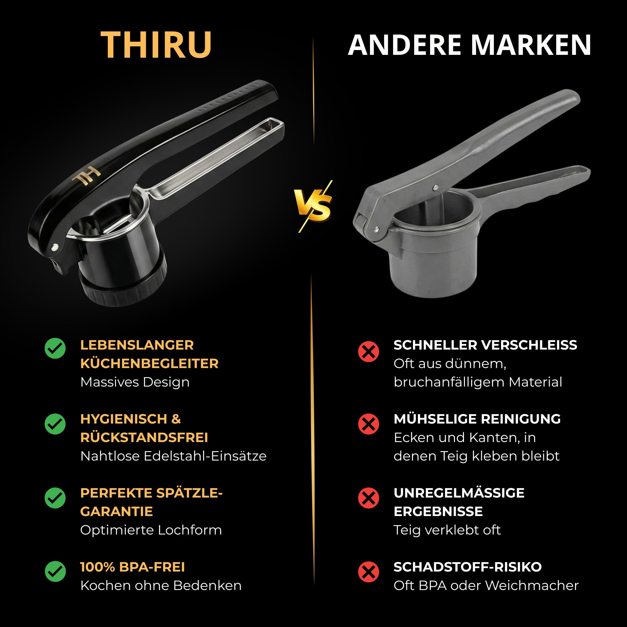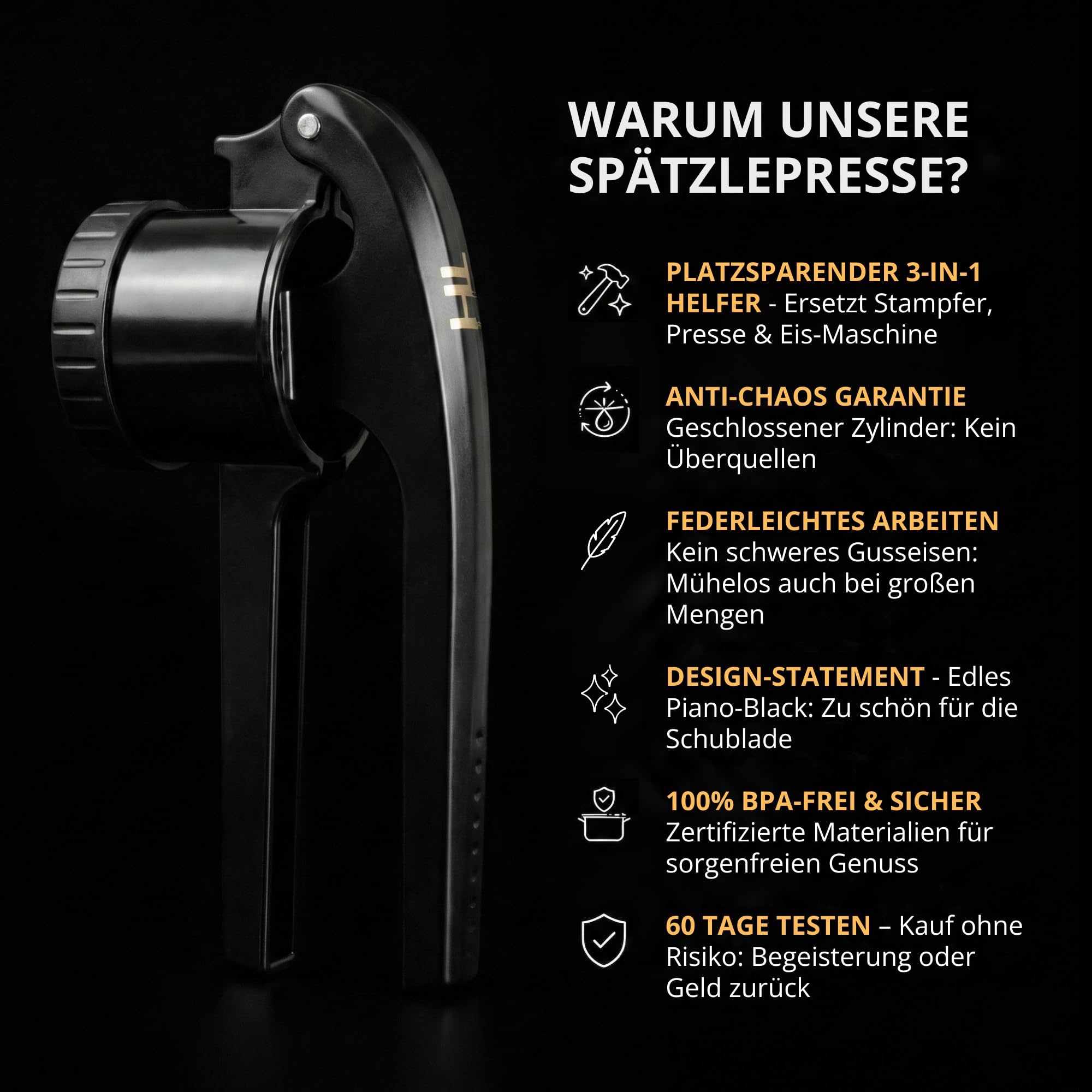 • LANGZEITGARANTIE & TESTPHASE – Teste die Spätzlepresse 60 Tage lang risikofrei und profitiere von 5 Jahren Garantie bei Material- oder Herstellungsfehlern.