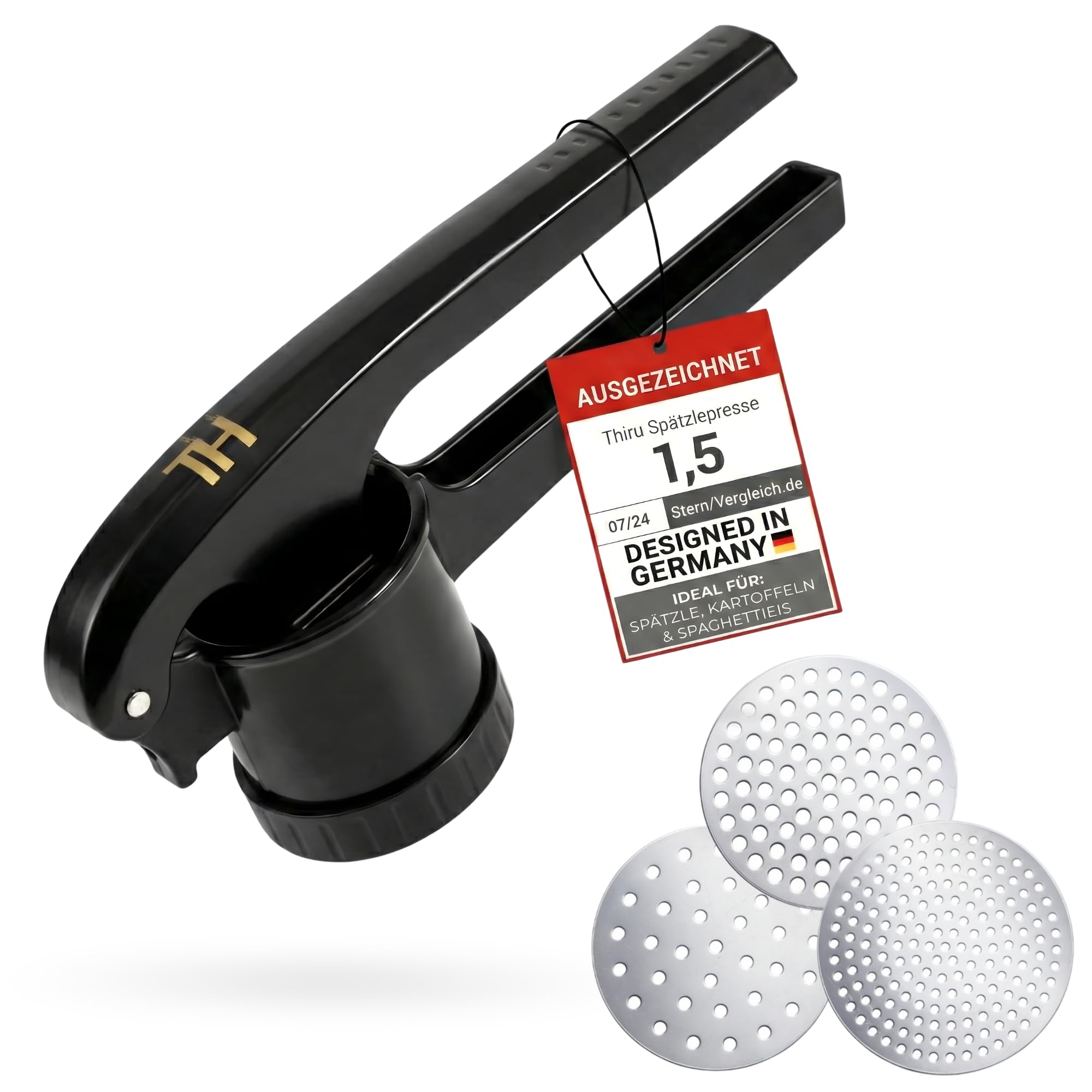 Thiru Spätzlepresse & Kartoffelpresse aus Kunststoff – 3 Edelstahl-Einsätze für Spätzle, Spaghetti-Eis, Kartoffelpüree 60 Tage risikofrei testen – sicherer Topf-Halt – spülmaschinengeeignet