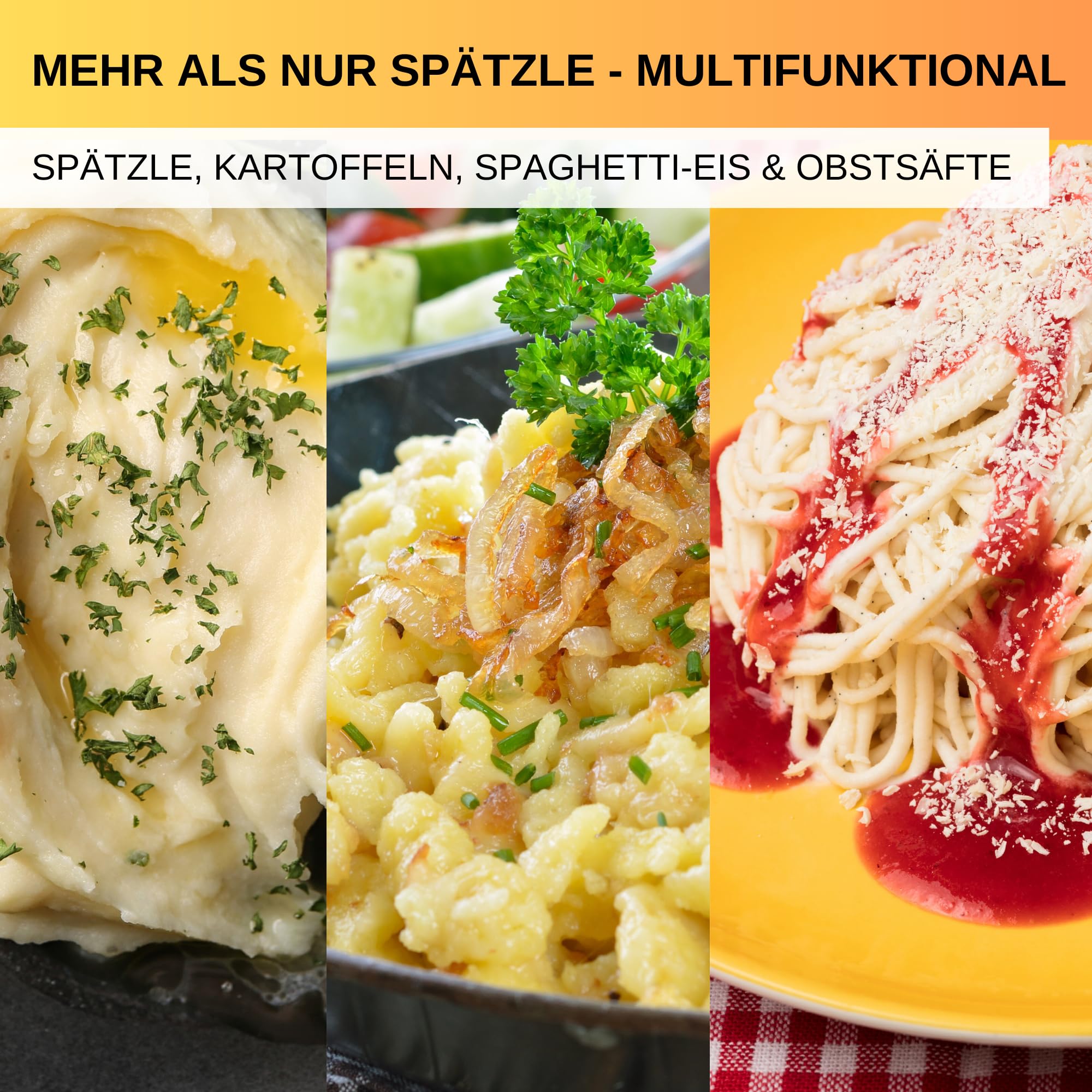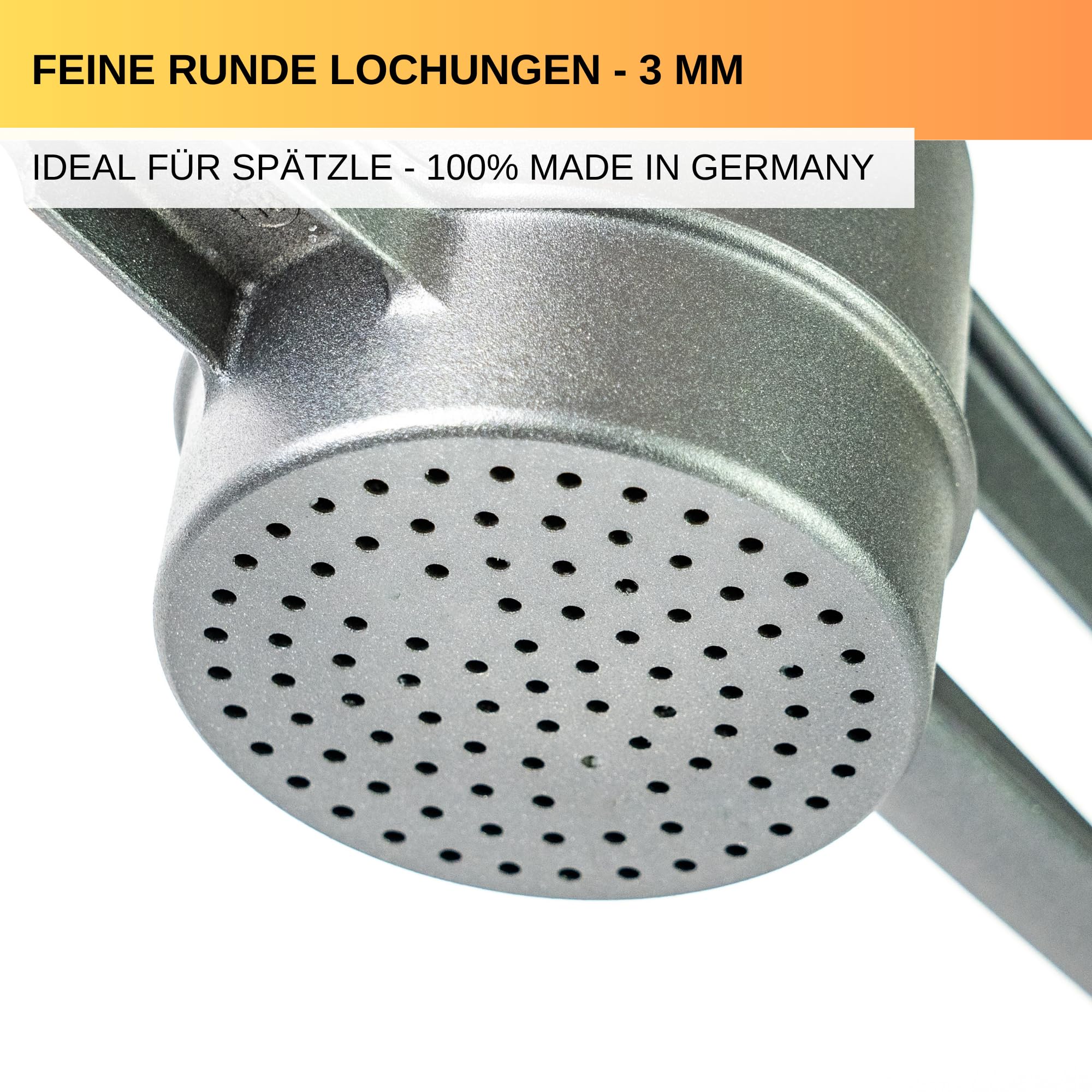 Thiru Spätzlepresse Kombipack - Klassische Spätlze & Knöpfle (Rundloch) - Testsieger 2024-60 Tage risikofrei testen - Kartoffelpresse mit Auflagerasten & Schaumlöffel - Made in Germany