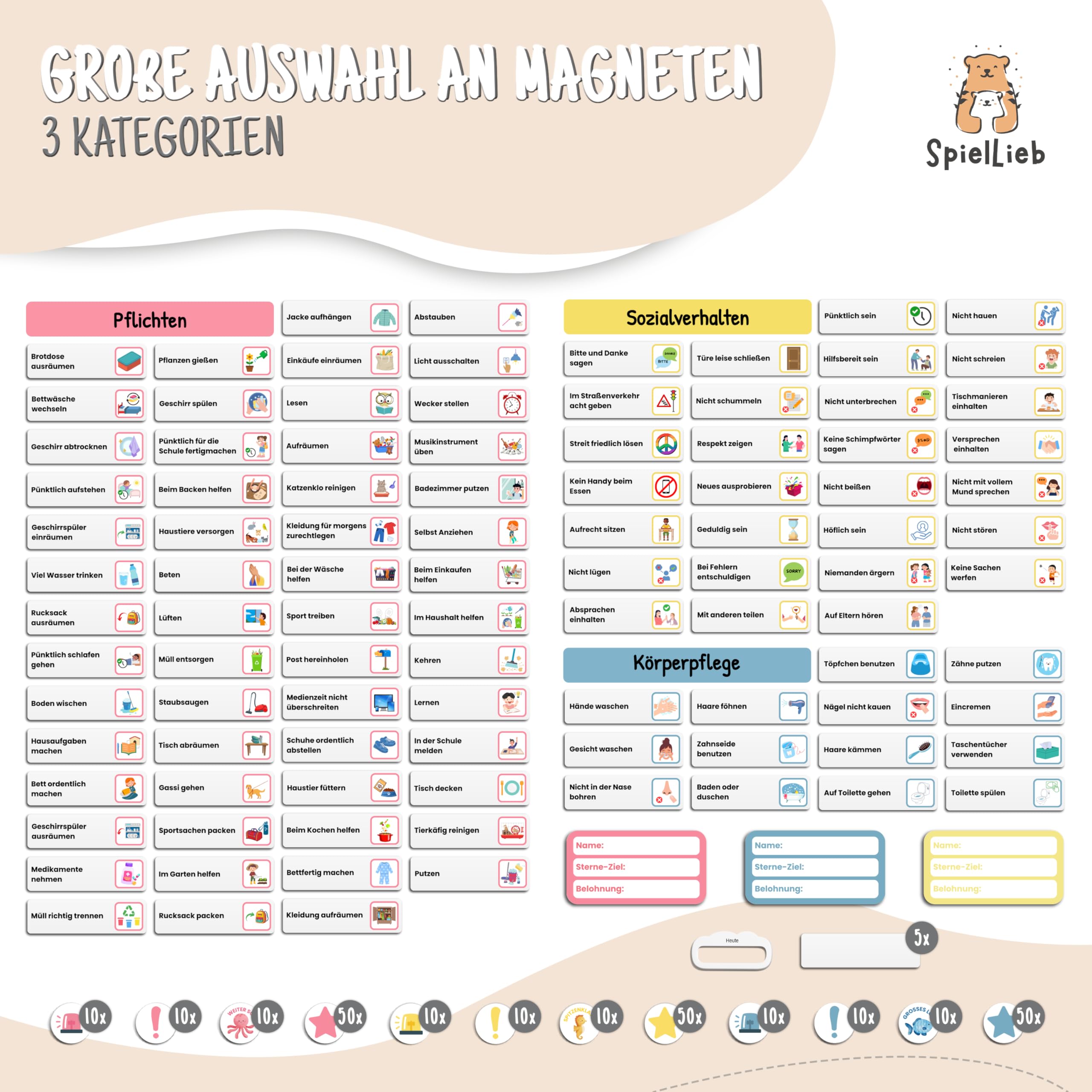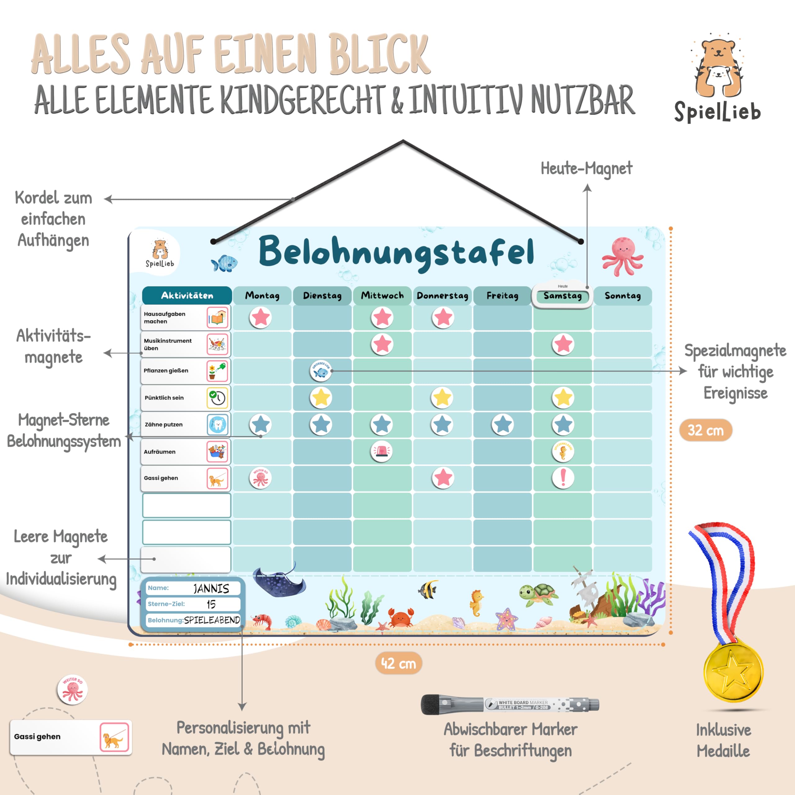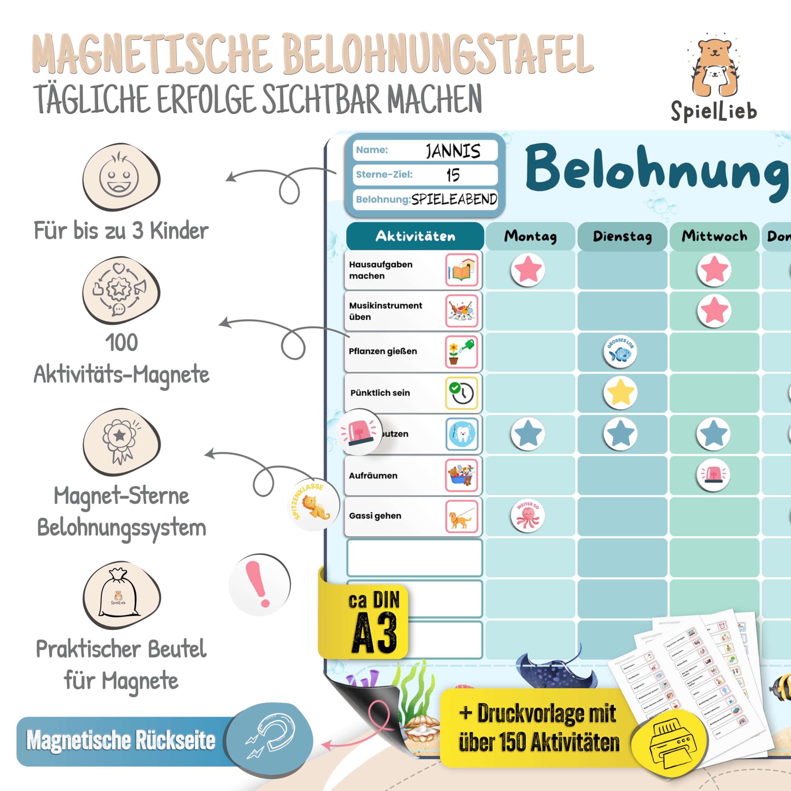 SpielLieb® Montessori Belohnungstafel Kinder magnetisch – Ideales Belohnungssystem Kinder [200 Aufgaben + Stern- & Spezialmagnete für 1-3 Spieler] - für mehr Selbstständigkeit (Ozean)