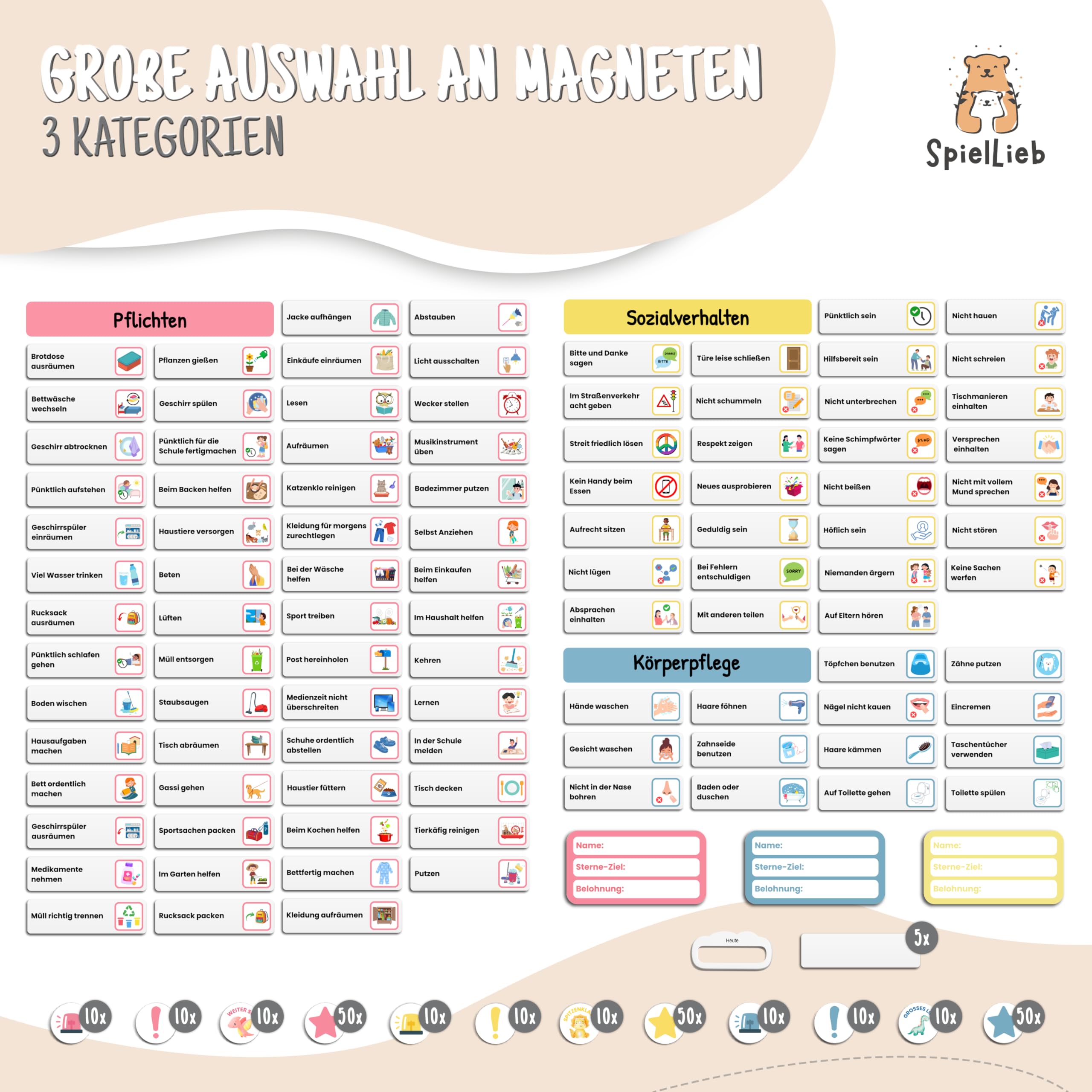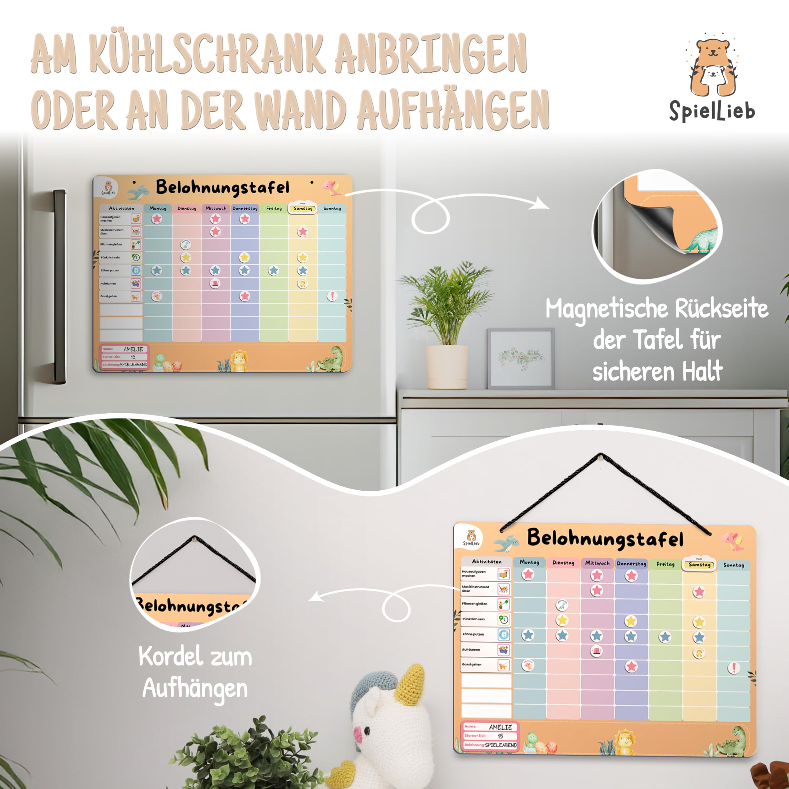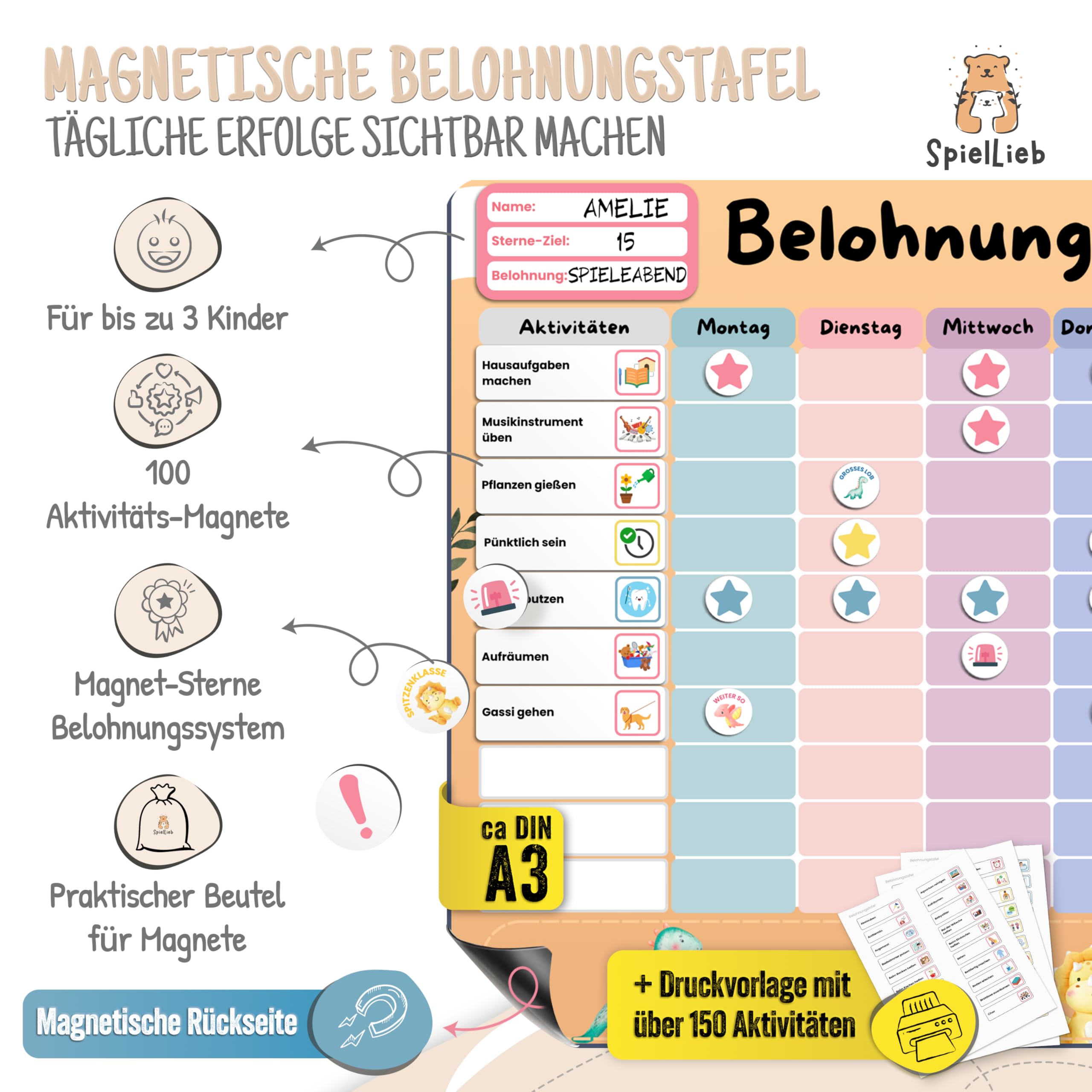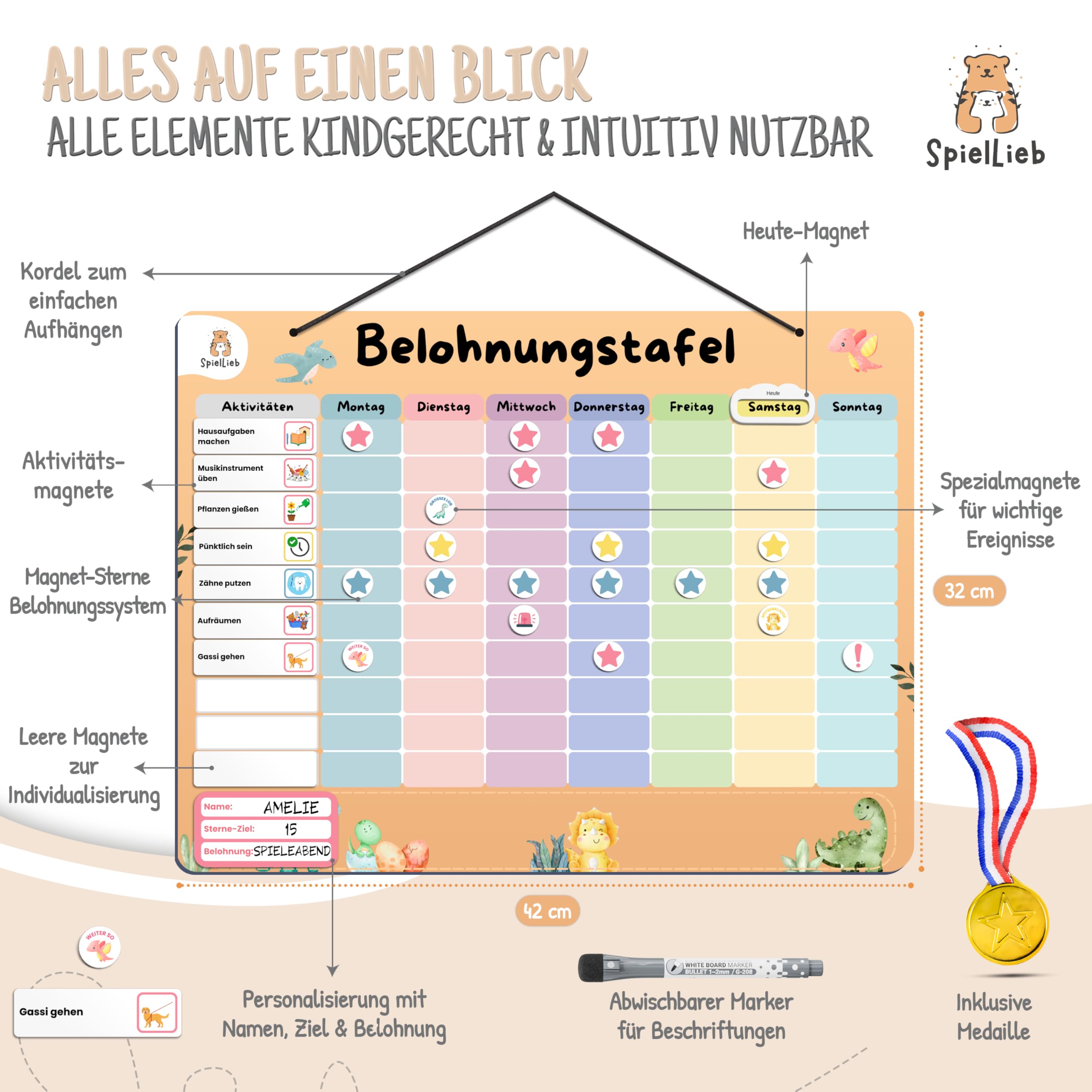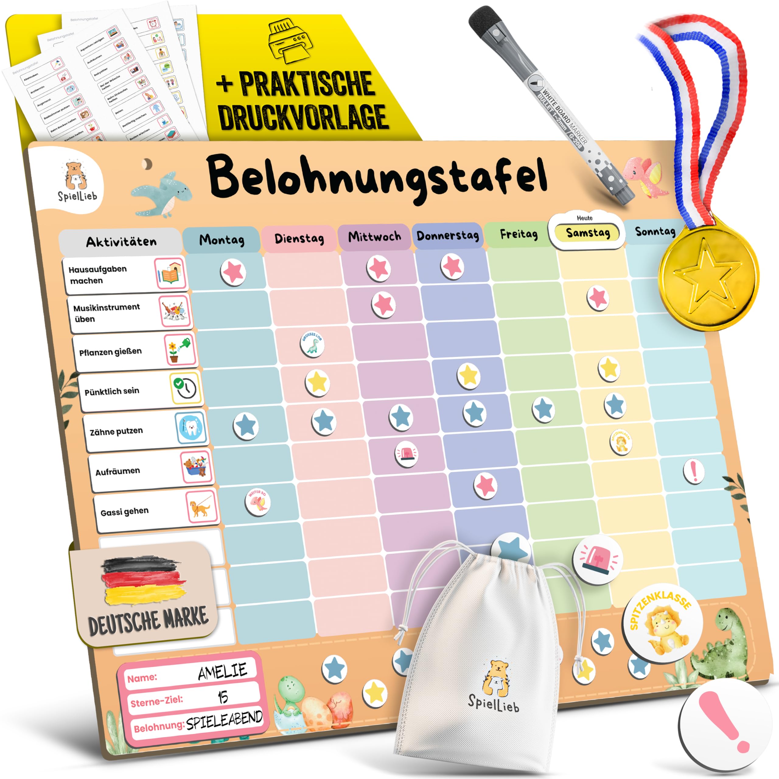 SpielLieb® Montessori Belohnungstafel Kinder magnetisch – Ideales Belohnungssystem Kinder [200 Aufgaben + Stern- & Spezialmagnete für 1-3 Spieler] - für mehr Selbstständigkeit (Dino)