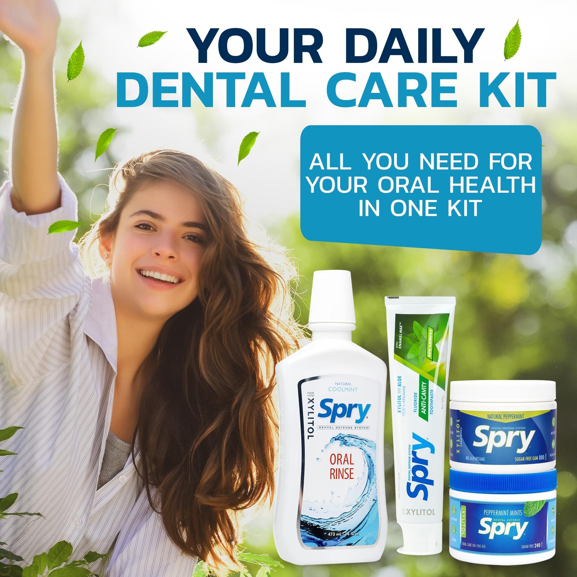 Spry Total Dental Health Kit – Rundum Mundpflege & Zahngesundheit: Inklusive Xylit-zuckerfreiem Kaugummi, zuckerfreien Bonbons/Mints, Mundspülung und Spearmint-Zahnpasta für den ganzen Tag.