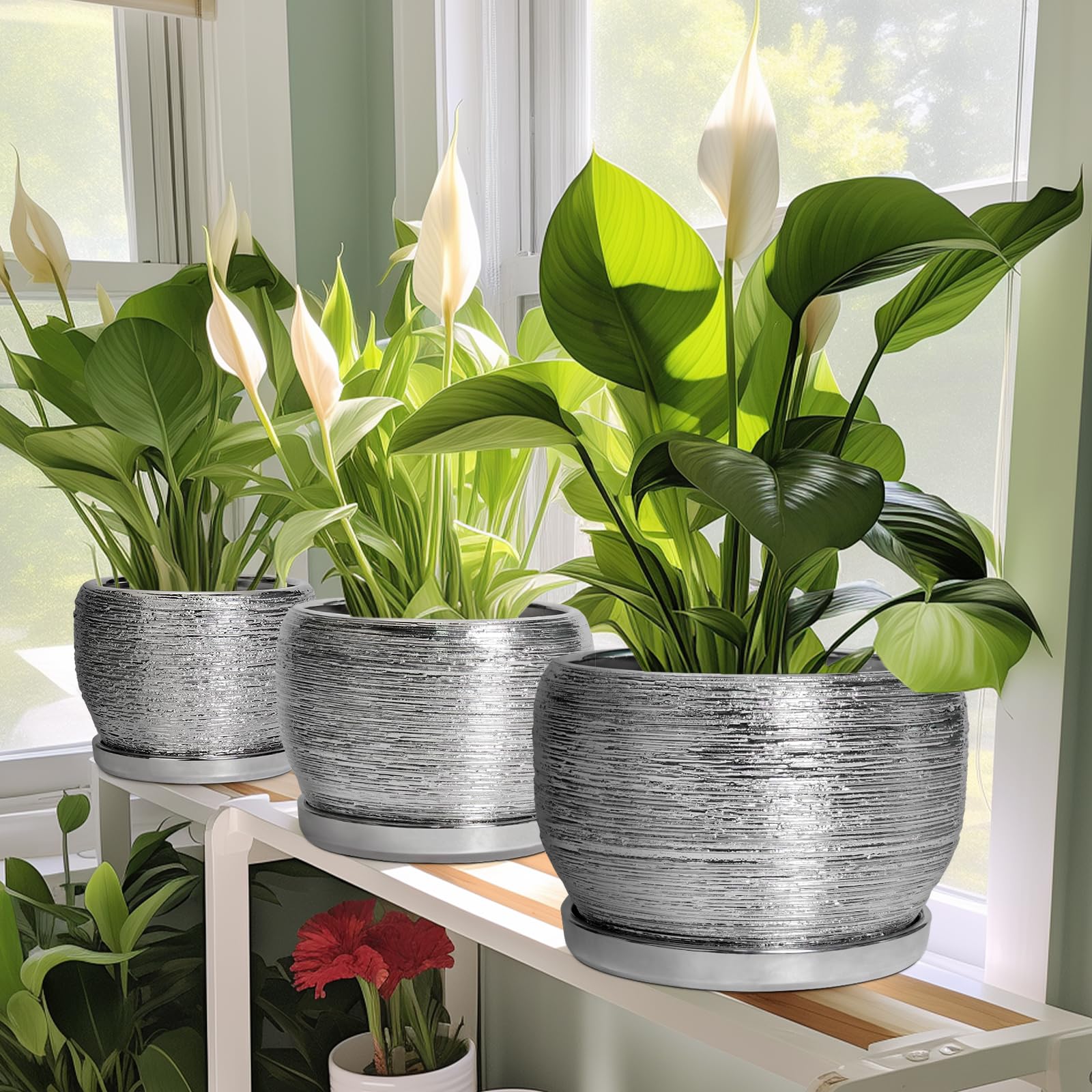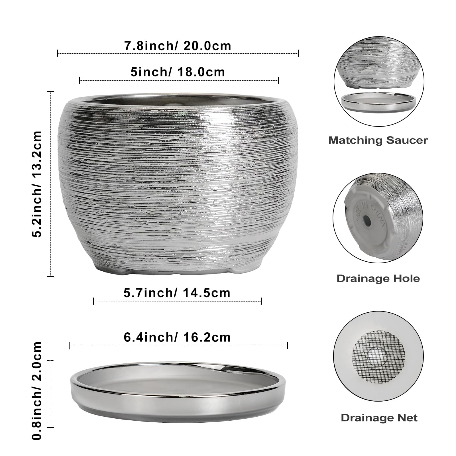Ideale Grösse dieses runden Blumentopfs: 20,3 cm D x 14 cm H, 20,3 cm silberfarbener Übertopf mit Keramikschale, Ablaufloch und Netzpolster, Pflanzen nicht im Lieferumfang enthalten. Keramik dieses 20,3 cm grossen Pflanzgefässes: Die Blumentöpfe im Innenbereich werden bei hohen Temperaturen ofengebrannt, wodurch sie weniger anfällig für Risse, Verwitterung und allgemeine Abnutzung sind, um eine lange und langfristige Nutzung im Innen- und Aussenbereich zu gewährleisten. 20,3 cm grosser Topf. für Pflanzen mit Drainage 【Loch und Untersetzer】 Drainageloch von Keramik-Pflanzgefässen für Zimmerpflanzen entfernt effizient überschüssiges Wasser und hilft Ihren Pflanzen zu gedeihen. Das Keramiktablett fängt jeden Überlauf auf, so dass Sie den Topf überall mit Vertrauen platzieren können. Modernes Design dieses silbernen Blumentopfs: Unser moderner Blumentopf verfügt über ein schönes und glattes Pfau-Silberglasur-Design, geeignet für die Dekoration Ihres Hauses, Gartens, Terrasse, Balkon, Wohnzimmer, Büro und mehr. Dieser vielseitige Silbertopf für Pflanzen ist eine wesentliche Ergänzung für jede Sammlung von kleinen Blumentöpfen und kleinen Blumentöpfen. Ideal als kleine Pflanzgefässe für Zimmerpflanzen und Gartentöpfe, sein integriertes Ablaufloch hebt ihn von anderen Blumentöpfen im Innenbereich mit Drainage ab und sorgt für die Gesundheit der Pflanzen. Das moderne Pflanzgefäss-Design des Pflanzgefässes mit Pfauen-Silberglasur macht ihn ideal als runder Übertopf und eignet sich für verschiedene Dekore, einschliesslich geriffelter Pflanzgefässe und Pflanzgefässe aus der Mitte des Jahrhunderts. Es verleiht dem Pflanzgefäss mit Untersetzer einen Hauch von Eleganz und funktioniert gut als dekorative Blumentöpfe und 7-Zoll-Blumentöpfe. Dieser silberne Blumentopf ist weit verbreitet: Der 17,8 cm grosse Pflanztopf mit Drainageloch und Untersetzer ist geeignet für Sukkulenten, Geldbaum, Monstera, Palme, Fiddle Leaf Feige, ZZ Pflanze, Paradiesvogel, Kräuter, Kakteen, Orchideenpflanze. Ideal für dekorative Töpfe für Pflanzen im Innenbereich, 17,8 cm grosser Blumentopf ist ein wunderbares Geschenk für Pflanzenliebhaber und ideal als Geschenk für Pflanzenliebhaber. Seine Vielseitigkeit bietet Platz für eine Reihe von Pflanzen, wodurch er als Orchideentopf, Geldbaumtopf, Pothos-Topf, Aloe-Blumentopf, Pflanztopf, afrikanischer Veilchen-Topf und Kaktus-Topf geeignet ist. Damit ist er ein wertvoller Bestandteil jeder Zimmerpflanzentopf-Kollektion. Für Outdoor-Enthusiasten dient dieser Pflanzkasten gut als Outdoor-Pflanzgefässe für Terrasse und Outdoor-Pflanzgefässe für Veranda. Er wertet jeden Raum auf und passt hervorragend in Bürodekorationen, Schreibtischdekorationen und sogar als Fenster-Pflanzgefäss oder Bücherregaldekoration. Seine Grösse und sein Stil machen ihn auch ideal für Tischdekoration. Wenn Sie auf der Suche nach durchdachten Weihnachtsgeschenken oder Lehrergeschenken sind, ist dieser Übertopf eine praktische und stilvolle Wahl. Haben Sie Probleme mit Ihrem Pflanzgefäss? Lassen Sie es uns wissen, und wir kümmern uns für Sie darum. 【Nach Erhalt dieses Keramik-Blumentopfes】 Wenn Sie nach Erhalt des runden Pflanztopfs Schäden oder andere Probleme haben, teilen Sie uns dies bitte mit und wir werden unser Bestes tun, um es für Sie zu lösen