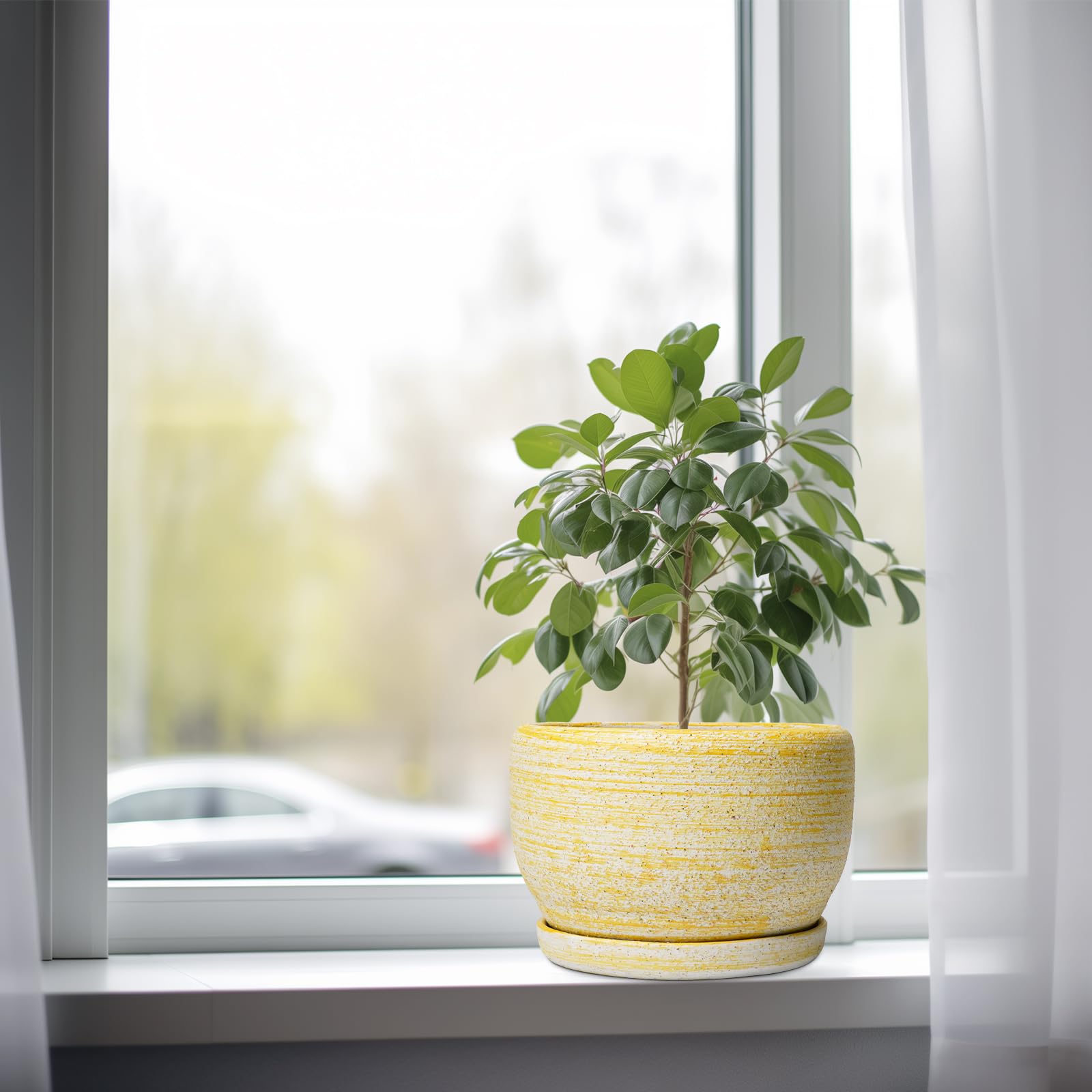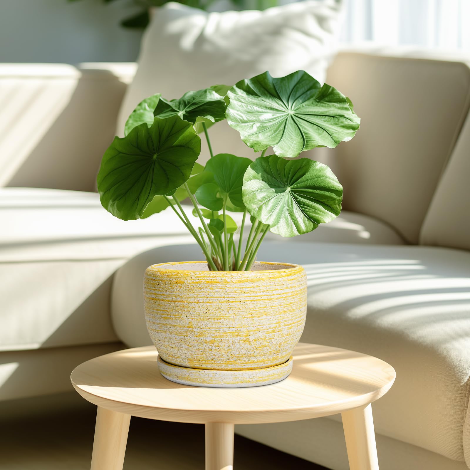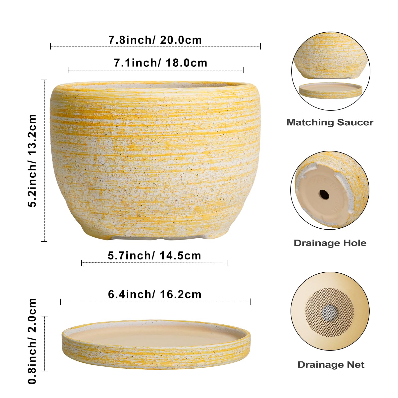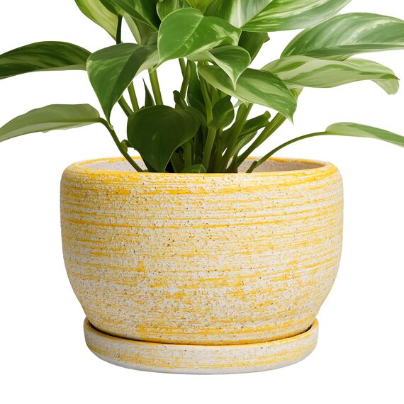 Ideale Grösse dieses mittelgrossen Blumentopfs: 20 cm D x 14 cm H, gelber Übertopf mit Keramikschale, Ablaufloch und Netzpolster, Pflanzen nicht im Lieferumfang enthalten. Langlebige Keramik dieses 20,3 cm grossen Blumentopfs: Die 17,8 cm grossen Blumentöpfe im Innenbereich werden bei hohen Temperaturen ofengebrannt, wodurch sie weniger anfällig für Risse, Verwitterung und allgemeine Abnutzung sind, was eine dauerhafte und langfristige Nutzung im Innen- und Aussenbereich gewährleistet. Untertasse: Ablaufloch 20,3 cm grosse Keramik-Pflanzgefässe für Zimmerpflanzen entfernen effizient überschüssiges Wasser und helfen Ihren Pflanzen zu gedeihen. Das Keramiktablett fängt jeden Überlauf auf, so dass Sie den Topf überall mit Vertrauen platzieren können. Modernes Design dieses gelben Blumentopfs: Unser moderner Blumentopf verfügt über eine schöne und glatte gelbe Oberfläche, geeignet für die Dekoration Ihres Hauses, Gartens, Terrasse, Balkon, Wohnzimmer, Büro und mehr. Dieser vielseitige gelbe Pflanztopf ist eine wesentliche Ergänzung für jede Sammlung von runden Blumentöpfen und kleinen Blumentöpfen. Ideal als kleine Pflanzgefässe für Zimmerpflanzen und Gartentöpfe, sein integriertes Ablaufloch hebt ihn von anderen Indoor-Blumentöpfen mit Drainage ab. Das moderne Pflanzgefäss-Design des Pflanzgefässes mit gelber Glasur macht ihn ideal als runder Übertopf und eignet sich für verschiedene Dekore, einschliesslich dekorativer Pflanzgefässe und Pflanzgefässe aus der Mitte des Jahrhunderts. Es verleiht dem Pflanzgefäss mit Untersetzer einen Hauch von Eleganz und funktioniert gut als dekorative Blumentöpfe und 20,3 cm grosse Blumentöpfe. 【Dieser gelbe Blumentopf ist weit verbreitet】 Der 17,8 cm grosse Pflanztopf mit Drainageloch und Untersetzer eignet sich für Sukkulenten, Pothos, Monstera, afrikanische Veilchen, Kräuter, Kakteen, Orchideen, Aloe Vera, Pothos-Pflanze, Geldbaum, Friedenslilienpflanze, ZZ-Pflanzen und mehr grossartig für dekorative Töpfe für Pflanzen im Innenbereich, dieser Übertopf ist ein wunderbares Geschenk für Pflanzenliebhaber und ideal als Geschenk für Pflanzenliebhaber für Frauen. Seine Vielseitigkeit bietet Platz für eine Reihe von Pflanzen, wodurch er als Orchideentopf, Geldbaumtopf, Pothos-Topf, Aloe-Blumentopf, Pothos-Blumentopf, afrikanischer Veilchen-Topf und Kaktus-Topf geeignet ist. Damit ist er ein wertvoller Bestandteil jeder Zimmerpflanzentopf-Kollektion. Für Outdoor-Enthusiasten dient dieser Pflanzkasten gut als Outdoor-Pflanzgefässe für Terrasse und Outdoor-Pflanzgefässe für Veranda. Er wertet jeden Raum auf und passt hervorragend in Bürodekorationen, Schreibtischdekorationen und sogar als Fenster-Pflanzgefäss oder Bücherregaldekoration. Seine Grösse und sein Stil machen ihn auch ideal für Tischdekoration. Wenn Sie auf der Suche nach durchdachten Weihnachtsgeschenken oder Lehrergeschenken sind, ist dieser Übertopf eine praktische und stilvolle Wahl. Haben Sie Probleme mit Ihrem Pflanzgefäss? Lassen Sie es uns wissen, und wir kümmern uns für Sie darum. Nach Erhalt dieses Keramik-Blumentopfs: Wenn Sie nach Erhalt des runden Pflanztopfs Schäden oder andere Probleme haben, lassen Sie es uns bitte wissen und wir werden grosse Anstrengungen unternehmen, um Ihnen zu helfen, ihn für Sie zu lösen