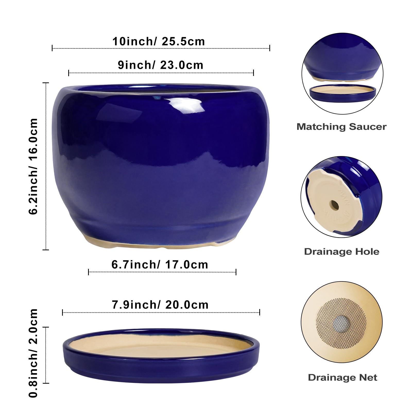 Ideale Grösse dieses Monstera-Topfs: 25,4 cm D x 16,5 cm H. Der Topf für Pflanzen wird mit einem Keramiktablett, einem Drainageloch und einem Netzpolster geliefert, Pflanzen nicht im Lieferumfang enthalten und ist ein schönes Geschenk für Pflanzenliebhaber, Mutter, Lehrer, Familie und Freunde. Langlebige Keramik. Die Pflanztöpfe im Innenbereich werden bei hohen Temperaturen ofengebrannt, wodurch sie weniger anfällig für Risse, Verwitterung und allgemeine Abnutzung sind. Topf mit Ablaufloch Und Untersetzer: Drainageloch von Keramik-Pflanzgefässen für Zimmerpflanzen entfernt effizient überschüssiges Wasser und hilft Ihren Pflanzen zu gedeihen. Das Keramiktablett fängt jeden Überlauf auf, so dass Sie den Topf überall mit Vertrauen platzieren können. Modernes Design dieses blauen Blumentopfs: Unser moderner Blumentopf verfügt über ein schönes und glattes pfauenblaues Glasur-Design, geeignet für die Dekoration Ihres Hauses, Gartens, Terrasse, Balkon, Wohnzimmer, Büro und mehr. Dieser vielseitige blaue Topf für Pflanzen ist eine wesentliche Ergänzung für jede Sammlung von grossen Blumentöpfen und grossen Blumentöpfen. Ideal als grosse Pflanzgefässe für Zimmerpflanzen und Gartentöpfe, sein integriertes Ablaufloch hebt ihn von anderen Blumentöpfen im Innenbereich mit Drainage ab und sorgt für die Gesundheit der Pflanzen. Das moderne Pflanzgefäss-Design des Pflanzgefässes mit einer pfauenblauen Glasur macht ihn ideal als runder Übertopf und eignet sich für verschiedene Dekore, einschliesslich Pflanztöpfe für Zimmerpflanzen und Pflanzgefässe aus der Mitte des Jahrhunderts. Es verleiht dem Pflanzgefäss mit Untersetzer einen Hauch von Eleganz und funktioniert gut als dekorative Blumentöpfe und 22,9 cm grosse Blumentöpfe. 【Dieser blaue Blumentopf ist weit verbreitet】 Der 22,9 cm grosse Pflanztopf mit Drainageloch und Untersetzer eignet sich für Sukkulenten, Bonsai, Kräuter, Kakteen, Orchideen, Aloe Vera, Pflanze, Geldbaum, und ist ein schönes Geschenk für Pflanzenliebhaber, Mutter, Lehrer, Familie und Freund, ideal für dekorative Töpfe für Pflanzen im Innenbereich, 22,9 cm grosser Blumentopf ist ein wunderbares Geschenk für Pflanzenliebhaber und ideal als Geschenk für Pflanzenliebhaber. Seine Vielseitigkeit bietet Platz für eine Reihe von Pflanzen, wodurch er als Orchideentopf, Geldbaumtopf, Pothos-Topf, Aloe-Blumentopf, Pflanztopf, afrikanischer Veilchen-Topf und Kaktus-Topf geeignet ist. Damit ist er ein wertvoller Bestandteil jeder Zimmerpflanzentopf-Kollektion. Für Outdoor-Enthusiasten dient dieser Pflanzkasten gut als Outdoor-Pflanzgefässe für Terrasse und Outdoor-Pflanzgefässe für Veranda. Er wertet jeden Raum auf und passt hervorragend in Bürodekorationen, Schreibtischdekorationen und sogar als Fenster-Pflanzgefäss oder Bücherregaldekoration. Seine Grösse und sein Stil machen ihn auch ideal für Tischdekoration. Wenn Sie auf der Suche nach durchdachten Weihnachtsgeschenken oder Lehrergeschenken sind, ist dieser Übertopf eine praktische und stilvolle Wahl. Haben Sie Probleme mit Ihrem Pflanzgefäss? Lassen Sie es uns wissen, und wir kümmern uns für Sie darum. 【Nach Erhalt dieses Keramik-Blumentopfes】 Wenn Sie nach Erhalt des runden Pflanztopfs Schäden oder andere Probleme haben, teilen Sie uns dies bitte mit und wir werden unser Bestes tun, um es für Sie zu lösen