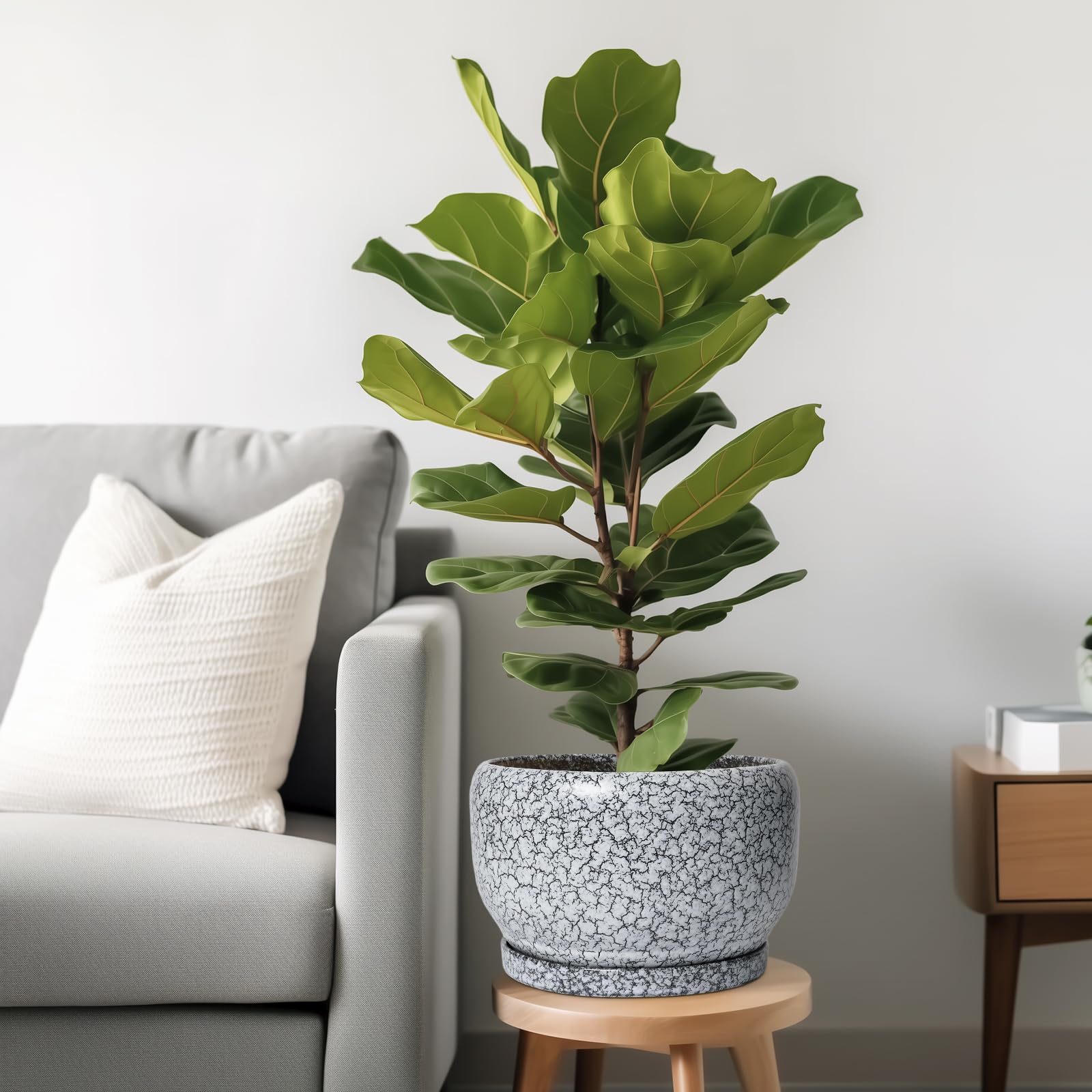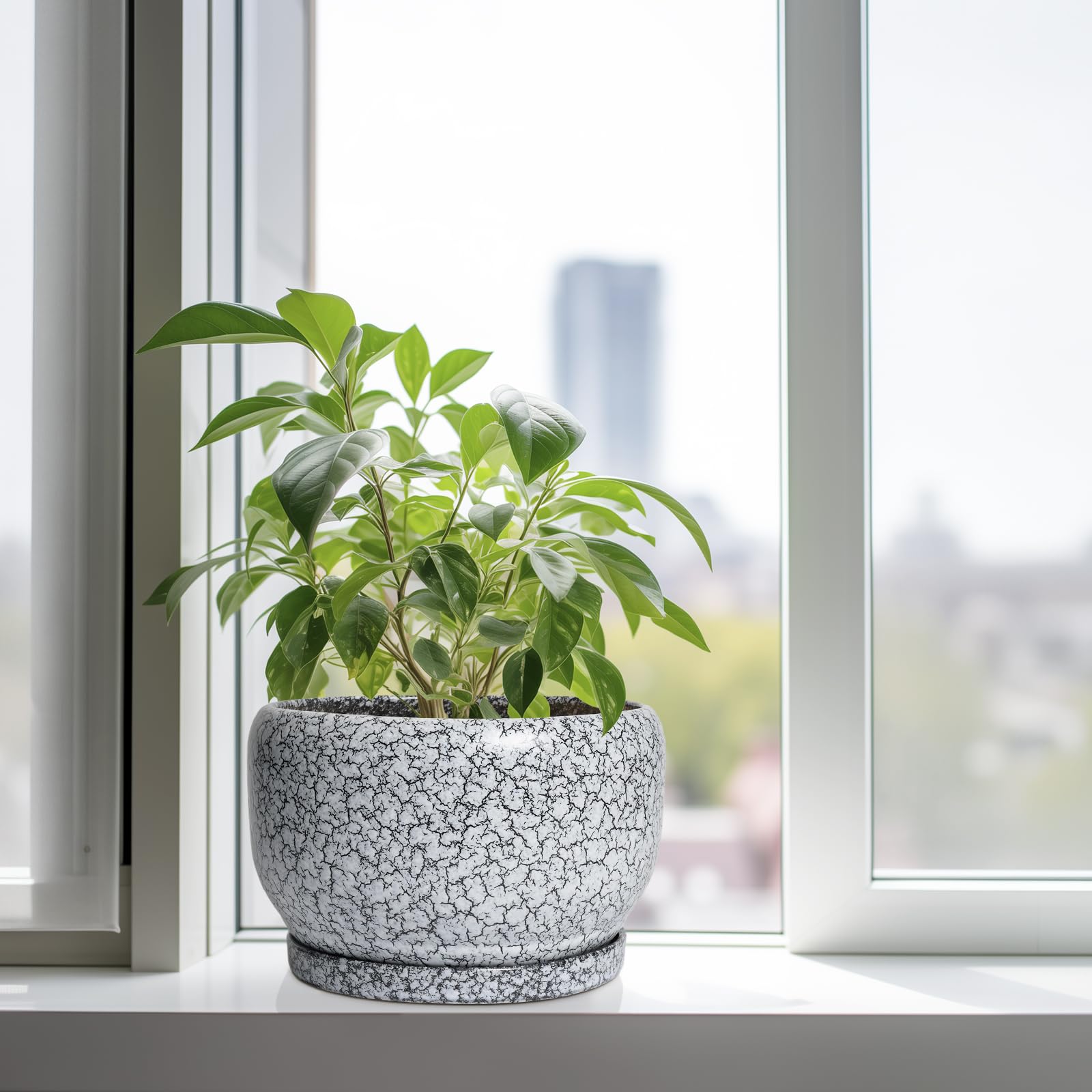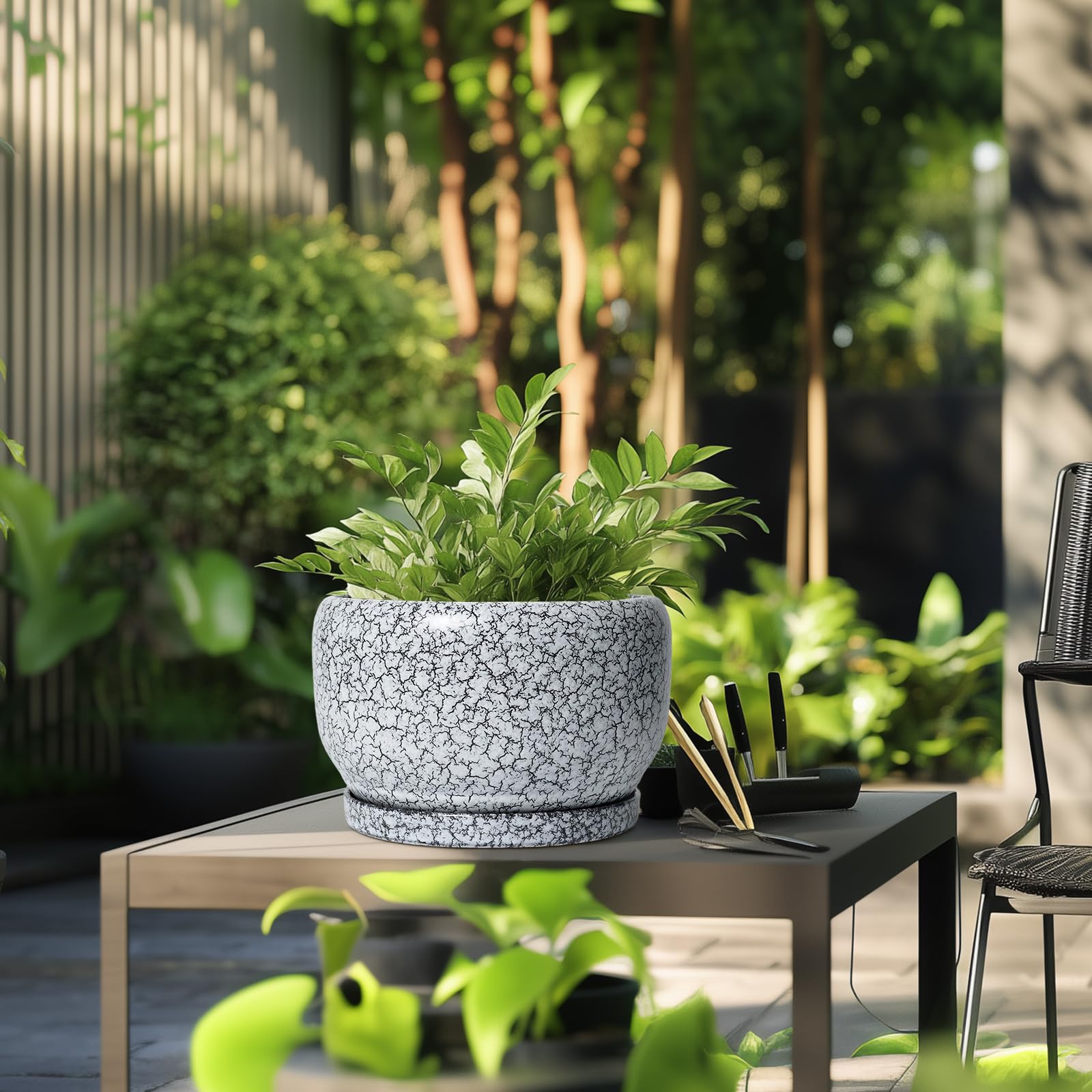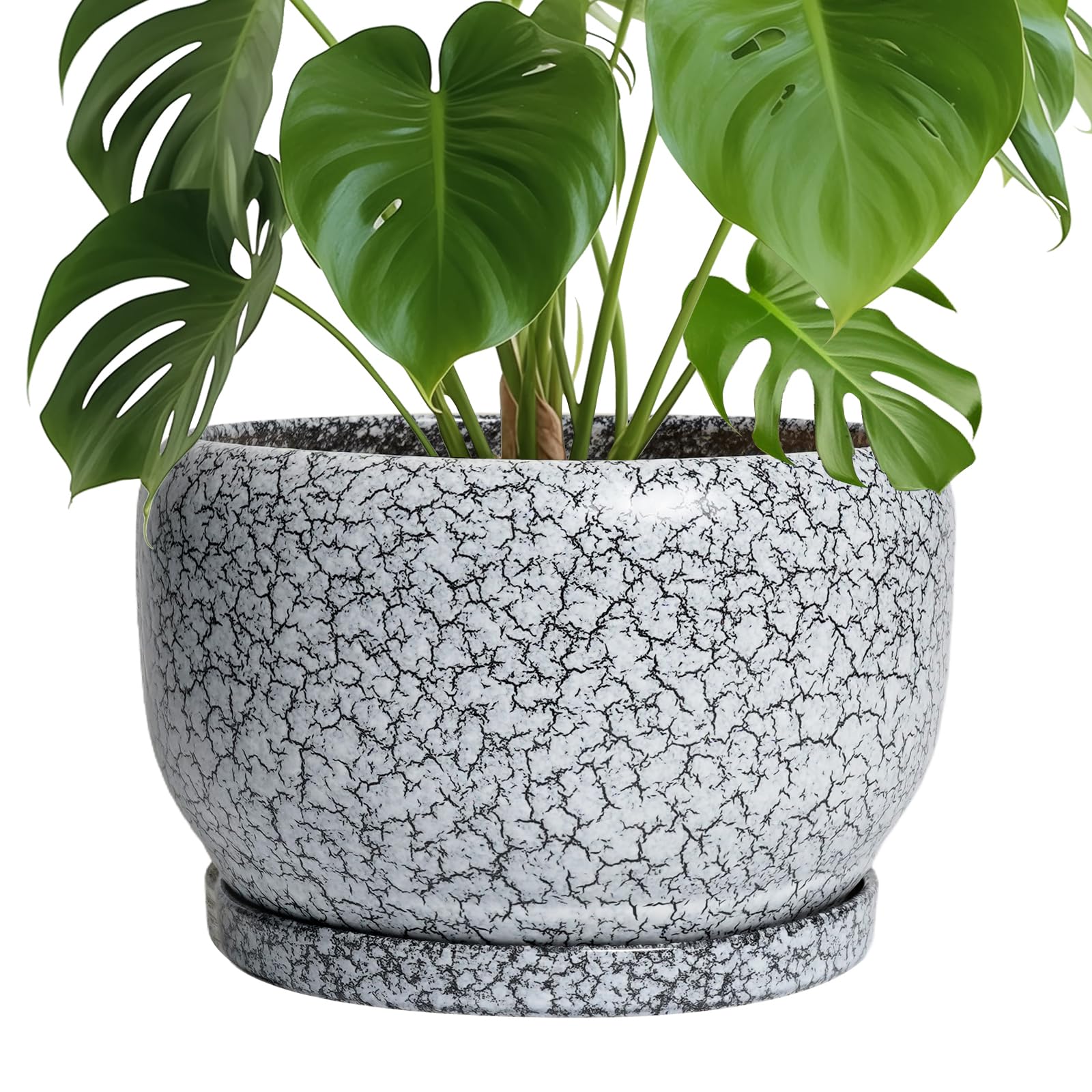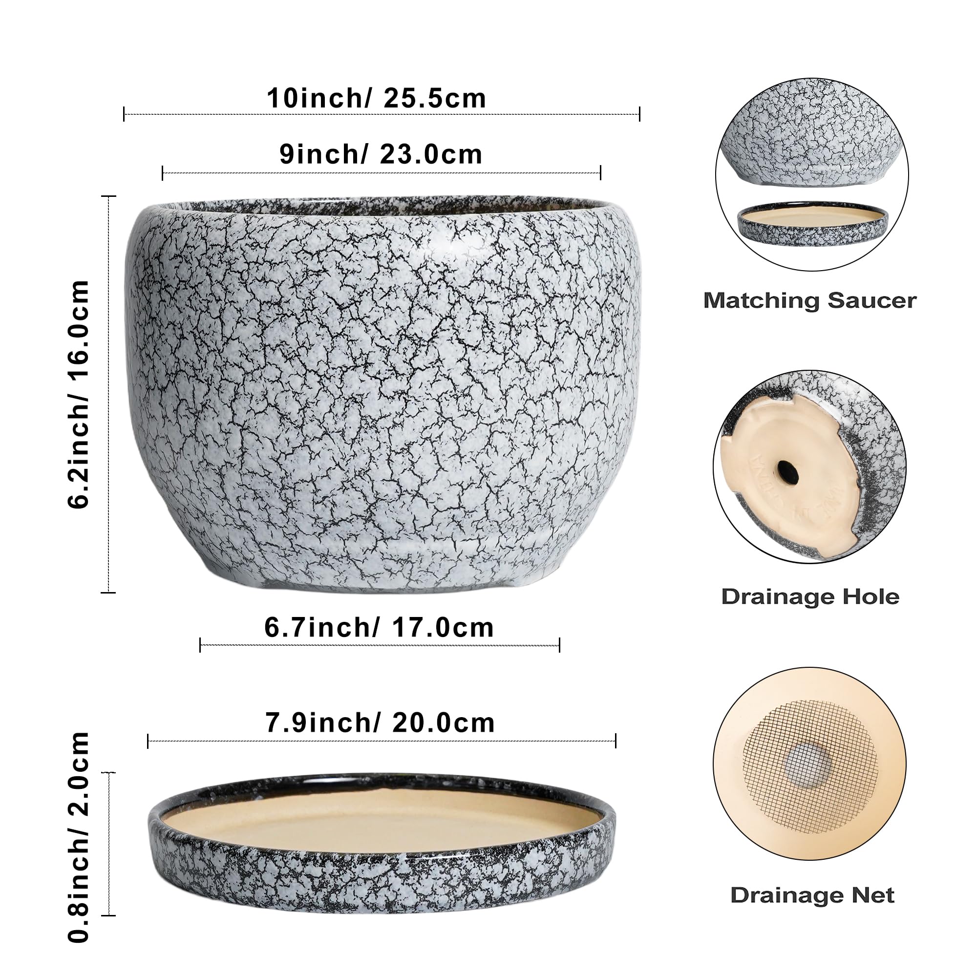 Ideale Grösse dieses mittelgrossen Blumentopfs: 25,4 cm D x 16,5 cm H, schwarz-weisser Übertopf mit Keramikschale, Ablaufloch und Netzpolster, Pflanzen nicht im Lieferumfang enthalten. Langlebige Keramik dieses 25,4 cm grossen Blumentopfs: Die 22,9 cm grossen Blumentöpfe im Innenbereich werden bei hohen Temperaturen ofengebrannt, wodurch sie weniger anfällig für Risse, Verwitterung und allgemeine Abnutzung sind, um eine dauerhafte und langfristige Nutzung im Innen- und Aussenbereich zu gewährleisten. Blumentopf mit Drainage. Alter Loch und Untertasse: Entwässerungsloch von 25,4 cm Keramik-Pflanzgefässen für Zimmerpflanzen entfernt effizient überschüssiges Wasser und hilft Ihren Pflanzen zu gedeihen. Das Keramiktablett fängt jeden Überlauf auf, so dass Sie den Topf überall mit Vertrauen platzieren können. Modernes Design dieses schwarzen Blumentopfs: Unser moderner Blumentopf verfügt über eine schöne und glatte weiss glasierte Oberfläche, geeignet für die Dekoration Ihres Hauses, Gartens, Terrasse, Balkon, Wohnzimmer, Büro und mehr. Dieser vielseitige weisse Topf für Pflanzen ist eine wesentliche Ergänzung für jede Sammlung von runden Blumentöpfen und grossen Blumentöpfen. Ideal als grosse Pflanzgefässe für Zimmerpflanzen und Gartentöpfe, sein integriertes Ablaufloch hebt ihn von anderen Indoor-Blumentöpfen mit Drainage ab. Das moderne Pflanzgefäss-Design des Pflanzgefässes mit schwarzer Glasur macht ihn ideal als runder Übertopf und eignet sich für verschiedene Dekore, einschliesslich dekorativer Pflanzgefässe und Pflanzgefässe aus der Mitte des Jahrhunderts. Es verleiht dem Pflanzgefäss mit Untersetzer einen Hauch von Eleganz und funktioniert gut als dekorative Blumentöpfe und 25,4 cm grosse Blumentöpfe. 【Dieser schwarze Blumentopf ist weit verbreitet】 Der 22,9 cm grosse Pflanztopf mit Drainageloch und Untersetzer eignet sich für Sukkulenten, Pothos, Monstera, afrikanische Veilchen, Kräuter, Kakteen, Orchideen, Aloe Vera, Pothos-Pflanze, Geldbaum, Friedenslilienpflanze, ZZ-Pflanzen und mehr grossartig für dekorative Töpfe für Pflanzen im Innenbereich, dieser Übertopf ist ein wunderbares Geschenk für Pflanzenliebhaber und ideal als Geschenk für Pflanzenliebhaber für Frauen. Seine Vielseitigkeit bietet Platz für eine Reihe von Pflanzen, wodurch er als Orchideentopf, Geldbaumtopf, Pothos-Topf, Aloe-Blumentopf, Pothos-Blumentopf, afrikanischer Veilchen-Topf und Kaktus-Topf geeignet ist. Damit ist er ein wertvoller Bestandteil jeder Zimmerpflanzentopf-Kollektion. Für Outdoor-Enthusiasten dient dieser Pflanzkasten gut als Outdoor-Pflanzgefässe für Terrasse und Outdoor-Pflanzgefässe für Veranda. Er wertet jeden Raum auf und passt hervorragend in Bürodekorationen, Schreibtischdekorationen und sogar als Fenster-Pflanzgefäss oder Bücherregaldekoration. Seine Grösse und sein Stil machen ihn auch ideal für Tischdekoration. Wenn Sie auf der Suche nach durchdachten Weihnachtsgeschenken oder Lehrergeschenken sind, ist dieser Übertopf eine praktische und stilvolle Wahl. Haben Sie Probleme mit Ihrem Pflanzgefäss? Lassen Sie es uns wissen, und wir kümmern uns für Sie darum. Nach Erhalt dieses Keramik-Blumentopfs: Wenn Sie nach Erhalt des runden Pflanztopfs Schäden oder andere Probleme haben, lassen Sie es uns bitte wissen und wir werden grosse Anstrengungen unternehmen, um Ihnen zu helfen, ihn für Sie zu lösen