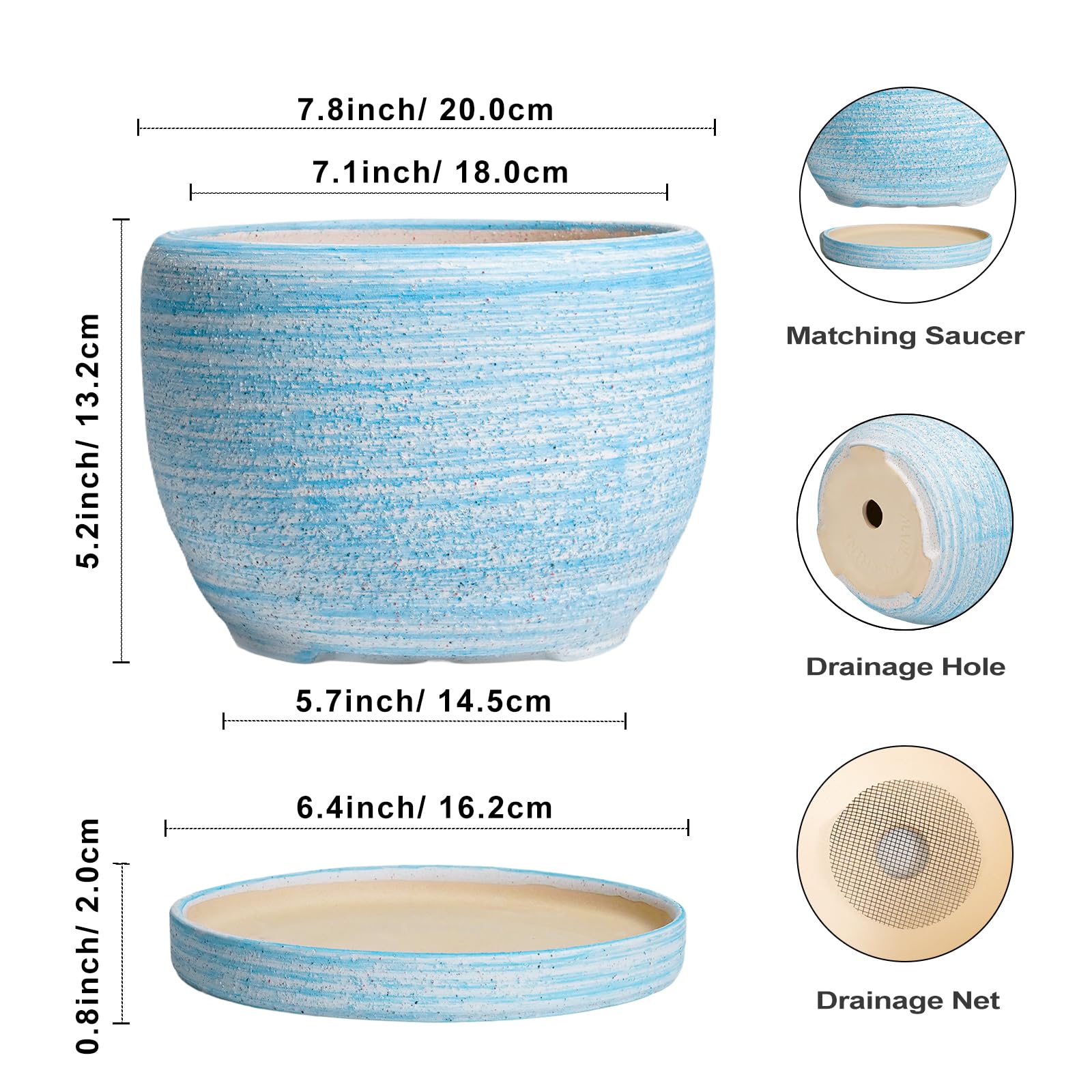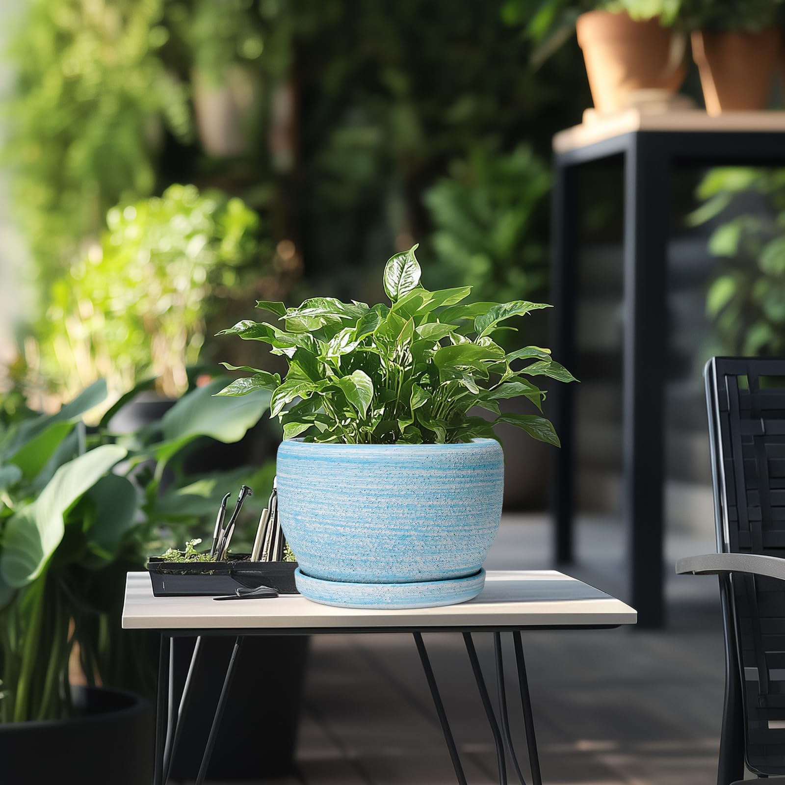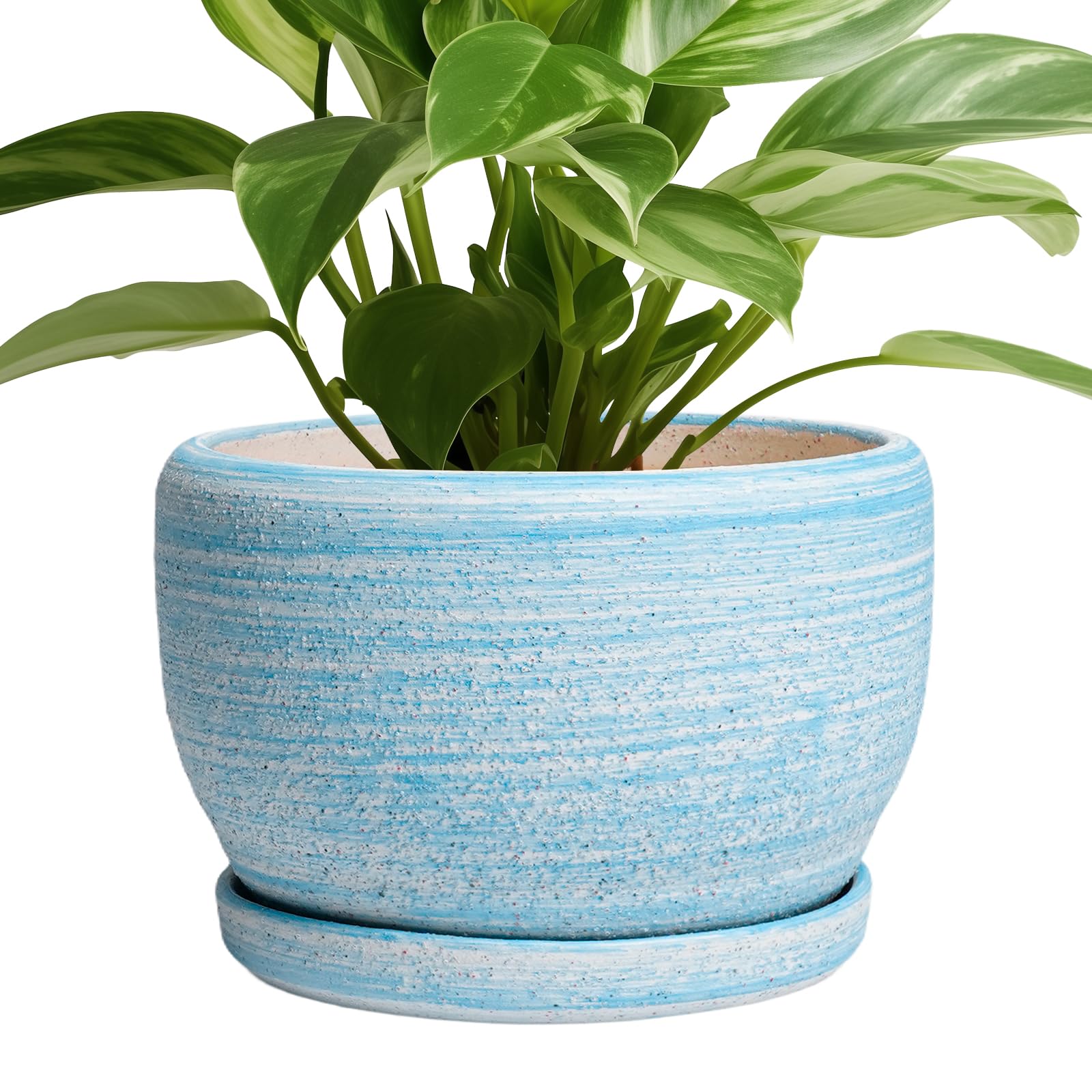 SQOWL Keramik-Pflanzgefäss – 20,3 cm Pflanztopf für Innen- und Aussenbereich, rund, Keramik-Pflanzgefäss mit Ablaufloch und Untersetzer, gebürstetes Blau