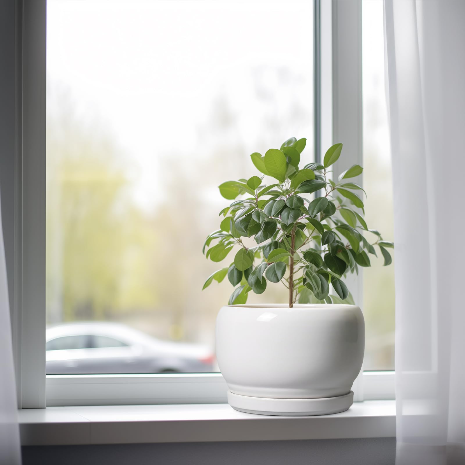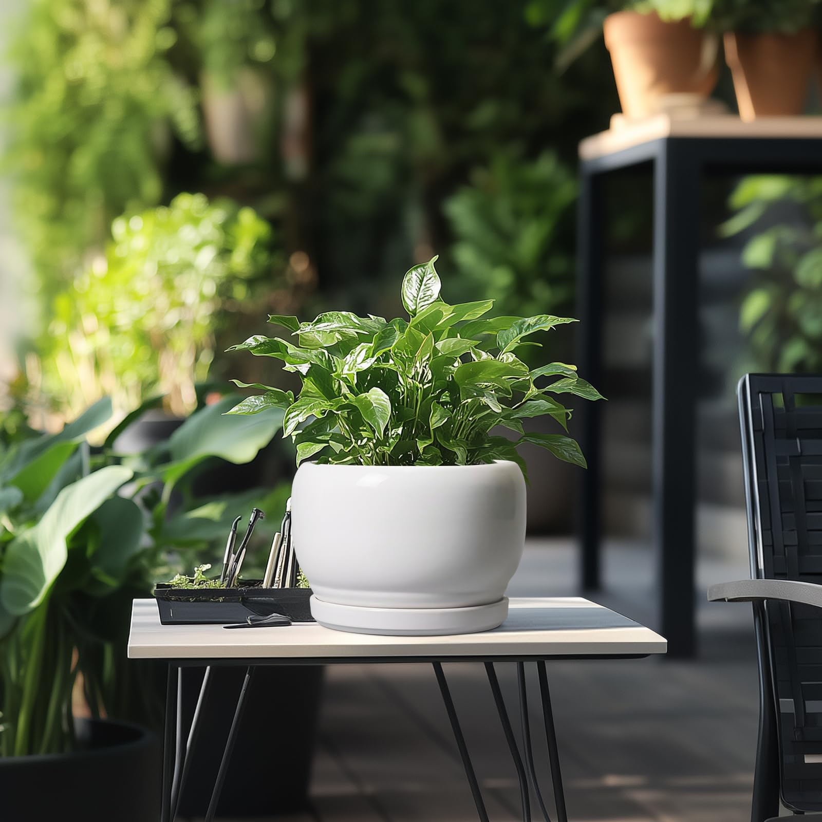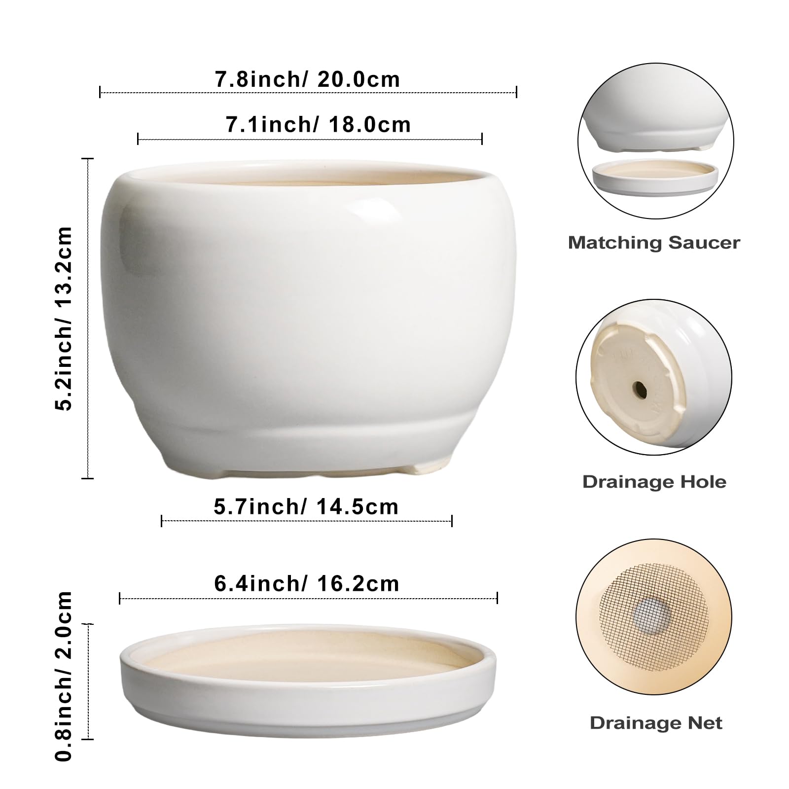 Ideale Grösse dieses runden Blumentopfs: 20,3 cm D x 14 cm H, 20,3 cm weisser Übertopf mit Keramikschale, Ablaufloch und Netzpolster, Pflanzen nicht im Lieferumfang enthalten. Keramik dieses 20,3 cm grossen Pflanzgefässes: Die Blumentöpfe im Innenbereich werden bei hohen Temperaturen ofengebrannt, wodurch sie weniger anfällig für Risse, Verwitterung und allgemeine Abnutzung sind, um eine lange und langfristige Nutzung im Innen- und Aussenbereich zu gewährleisten. 20,3 cm grosser Topf. für Pflanzen mit Drainage 【Loch und Untersetzer】 Drainageloch von Keramik-Pflanzgefässen für Zimmerpflanzen entfernt effizient überschüssiges Wasser und hilft Ihren Pflanzen zu gedeihen. Das Keramiktablett fängt jeden Überlauf auf, so dass Sie den Topf überall mit Vertrauen platzieren können. Modernes Design dieses weissen Blumentopfs: Unser moderner Blumentopf verfügt über ein schönes und glattes pfauenweisses Glasur-Design, geeignet für die Dekoration Ihres Hauses, Gartens, Terrasse, Balkon, Wohnzimmer, Büro und mehr. Dieser vielseitige weisse Topf für Pflanzen ist eine wesentliche Ergänzung für jede Sammlung von kleinen Blumentöpfen und kleinen Blumentöpfen. Ideal als kleine Pflanzgefässe für Zimmerpflanzen und Gartentöpfe, sein integriertes Ablaufloch hebt ihn von anderen Blumentöpfen im Innenbereich mit Drainage ab und sorgt für die Gesundheit der Pflanzen. Das moderne Pflanzgefäss-Design des Pflanzgefässes mit einer pfauenweissen Glasur macht ihn ideal als runder Übertopf und eignet sich für verschiedene Dekorationen, einschliesslich geriffelter Pflanzgefässe und Pflanzgefässe aus der Mitte des Jahrhunderts. Es verleiht dem Pflanzgefäss mit Untersetzer einen Hauch von Eleganz und funktioniert gut als dekorative Blumentöpfe und 7-Zoll-Blumentöpfe. Dieser weisse Blumentopf ist weit verbreitet: Der 17,8 cm grosse Pflanztopf mit Drainageloch und Untersetzer ist geeignet für Sukkulenten, Geldbaum, Monstera, Palme, Fiddle Leaf Feige, ZZ Pflanze, Paradiesvogel, Kräuter, Kakteen, Orchideenpflanze. Ideal für dekorative Töpfe für Pflanzen im Innenbereich, 17,8 cm grosser Blumentopf ist ein wunderbares Geschenk für Pflanzenliebhaber und ideal als Geschenk für Pflanzenliebhaber. Seine Vielseitigkeit bietet Platz für eine Reihe von Pflanzen, wodurch er als Orchideentopf, Geldbaumtopf, Pothos-Topf, Aloe-Blumentopf, Pflanztopf, afrikanischer Veilchen-Topf und Kaktus-Topf geeignet ist. Damit ist er ein wertvoller Bestandteil jeder Zimmerpflanzentopf-Kollektion. Für Outdoor-Enthusiasten dient dieser Pflanzkasten gut als Outdoor-Pflanzgefässe für Terrasse und Outdoor-Pflanzgefässe für Veranda. Er wertet jeden Raum auf und passt hervorragend in Bürodekorationen, Schreibtischdekorationen und sogar als Fenster-Pflanzgefäss oder Bücherregaldekoration. Seine Grösse und sein Stil machen ihn auch ideal für Tischdekoration. Wenn Sie auf der Suche nach durchdachten Weihnachtsgeschenken oder Lehrergeschenken sind, ist dieser Übertopf eine praktische und stilvolle Wahl. Haben Sie Probleme mit Ihrem Pflanzgefäss? Lassen Sie es uns wissen, und wir kümmern uns für Sie darum. 【Nach Erhalt dieses Keramik-Blumentopfes】 Wenn Sie nach Erhalt des runden Pflanztopfs Schäden oder andere Probleme haben, teilen Sie uns dies bitte mit und wir werden unser Bestes tun, um es für Sie zu lösen