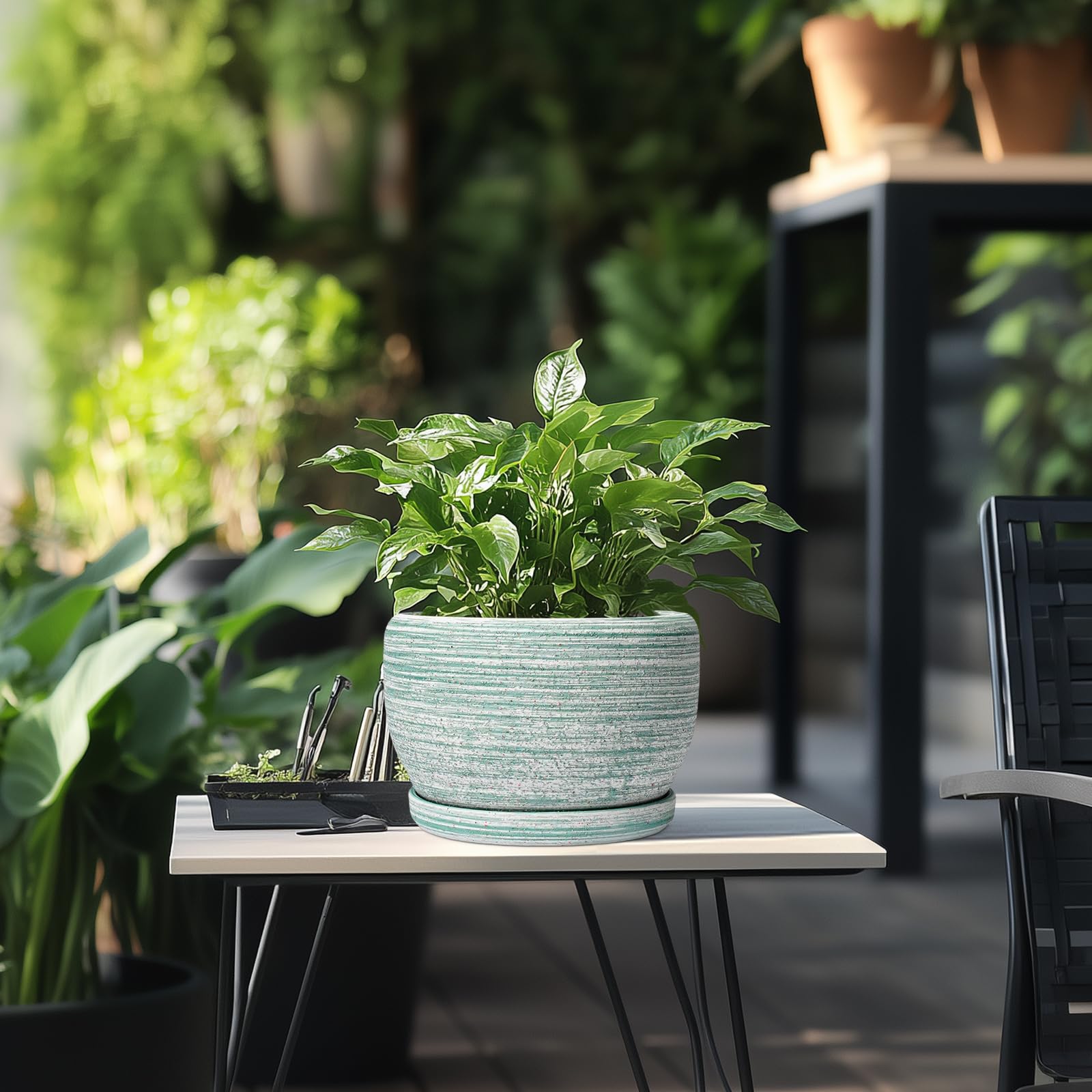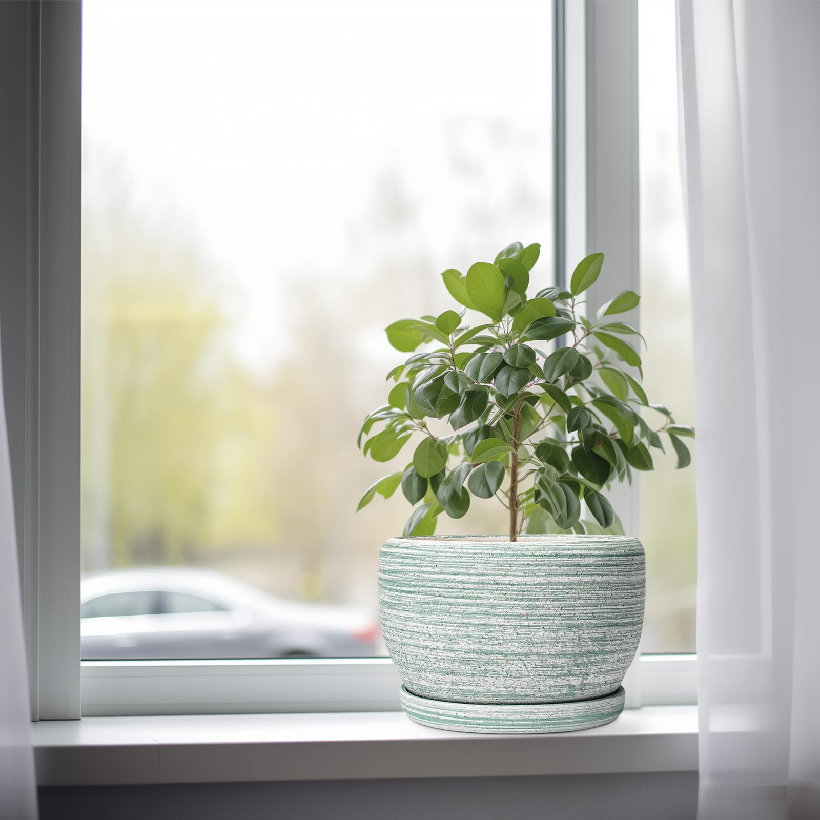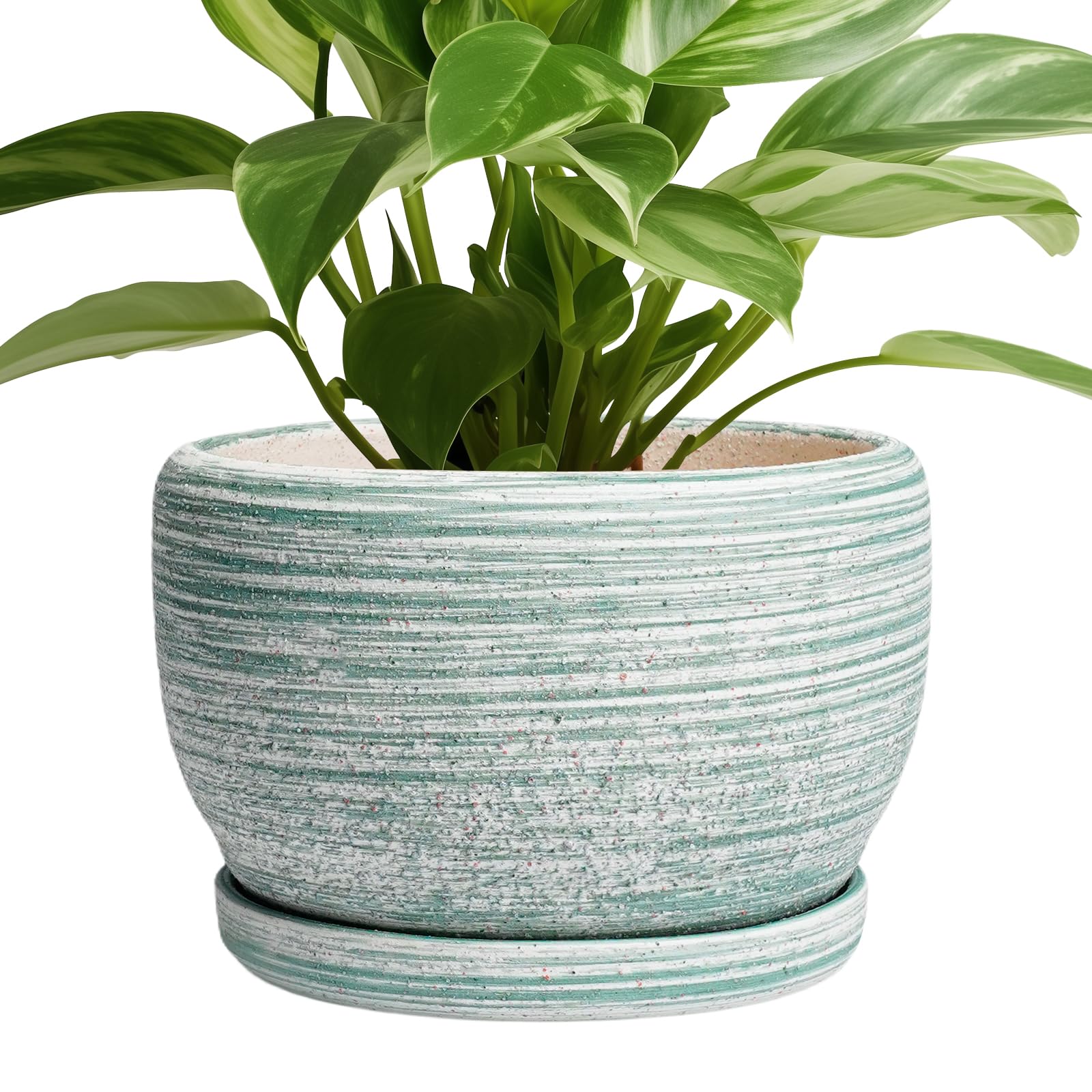 SQOWL Keramik-Pflanzgefäss – 20,3 cm Pflanztopf für Innen- und Aussenbereich, rund, Keramik-Pflanzgefäss mit Ablaufloch und Untersetzer, gebürstetes Grün