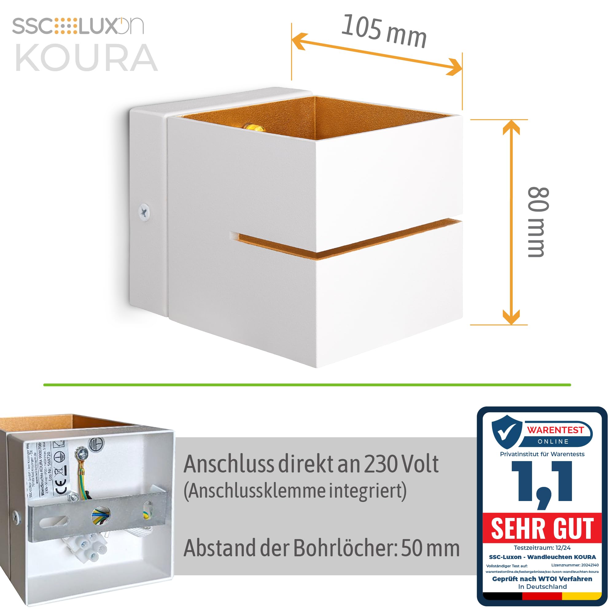 Schwenkbar: neinLieferumfang: 2 Stück KOURA Wandaufbauleuchte weiss innen gold