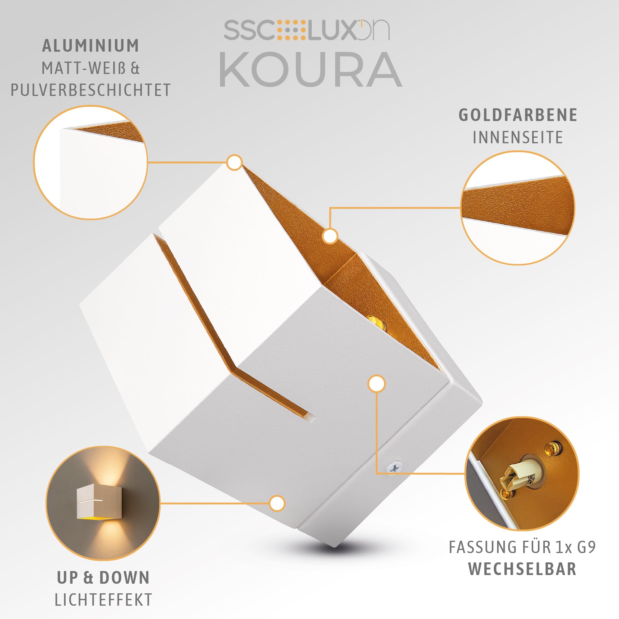 Das elegante Aussehen der Wandleuchte KOURA stellt die zeitlose Kombination von Weiss und Gold in den Mittelpunkt. Das weisse Gehäuse verleiht der Treppenleuchte innen ein modernes Aussehen, der goldene Lampenschirm im Inneren sorgt für das gewisse Etwas. Das Wandlicht weiss mit dem Lampenschirm innen gold verleiht jedem Raum eine besondere Atmosphäre.Wechselbare G9 Leuchtmittel und Up & Down Licht
