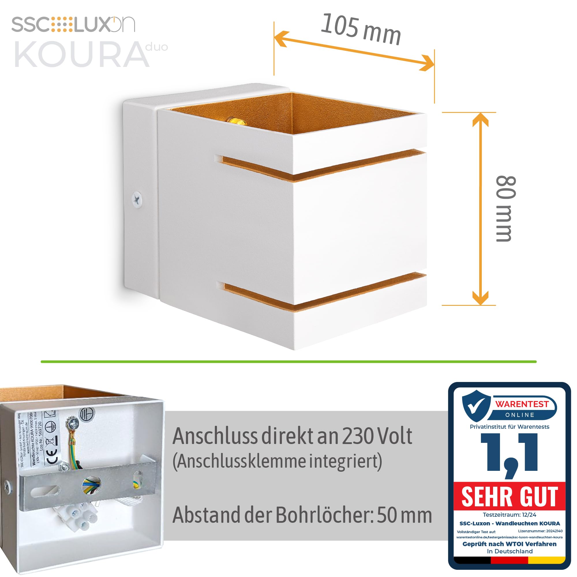 Dank des hellen Weisstons wirkt das Set dezent und passt in verschiedenste Wohnkonzepte. Die goldene Innenfläche unterstreicht den edlen Charakter und setzt warme Akzente an den Wänden. Die KOURA DUO zeigt hier besonders ihre Stärken, da sie diffuses, indirektes Licht ausstrahlt. Ebenso entfaltet das 2er-Set seine Wirkung als uplight & downlight, das Wände nach oben und unten beleuchtet und architektonische Details elegant hervorhebt.
