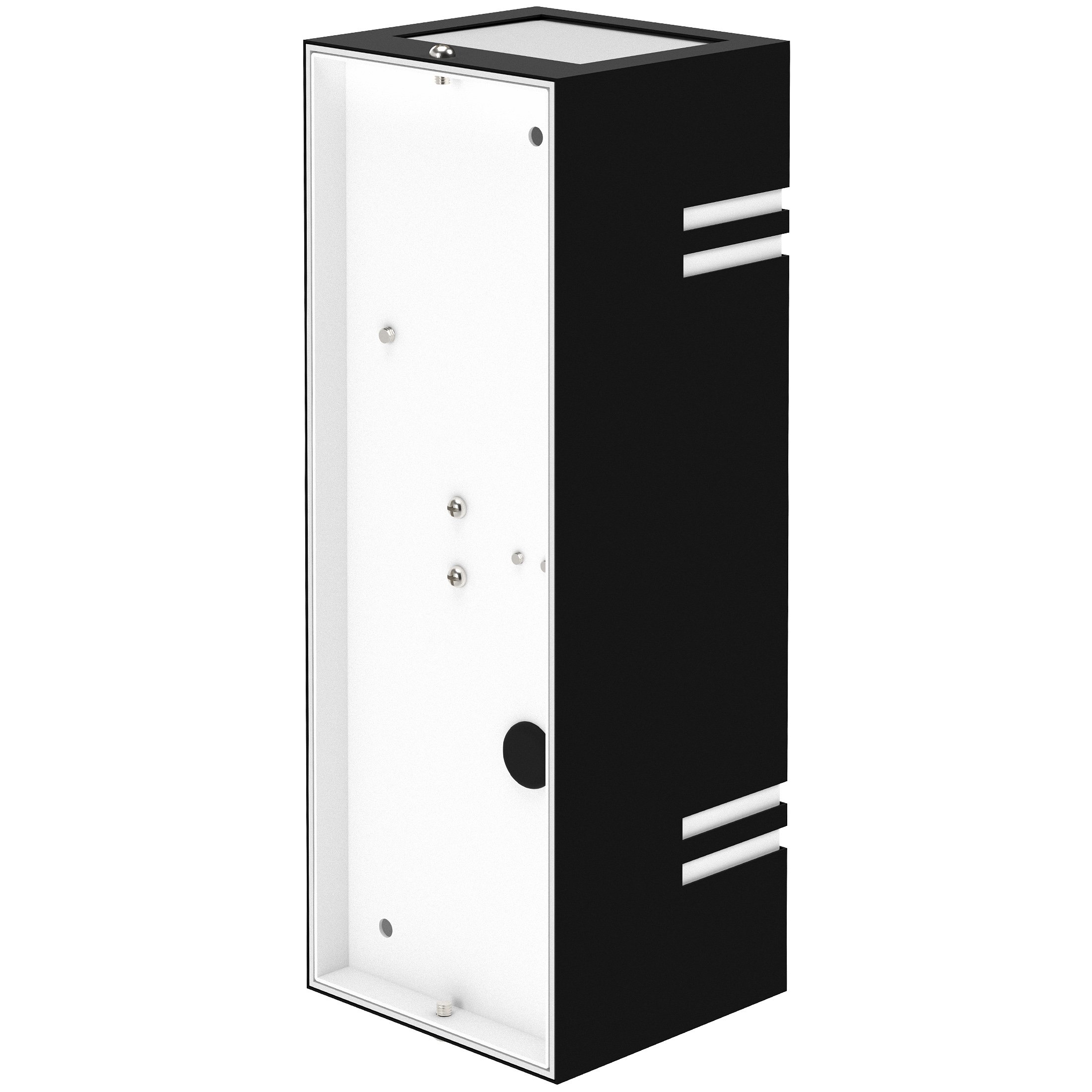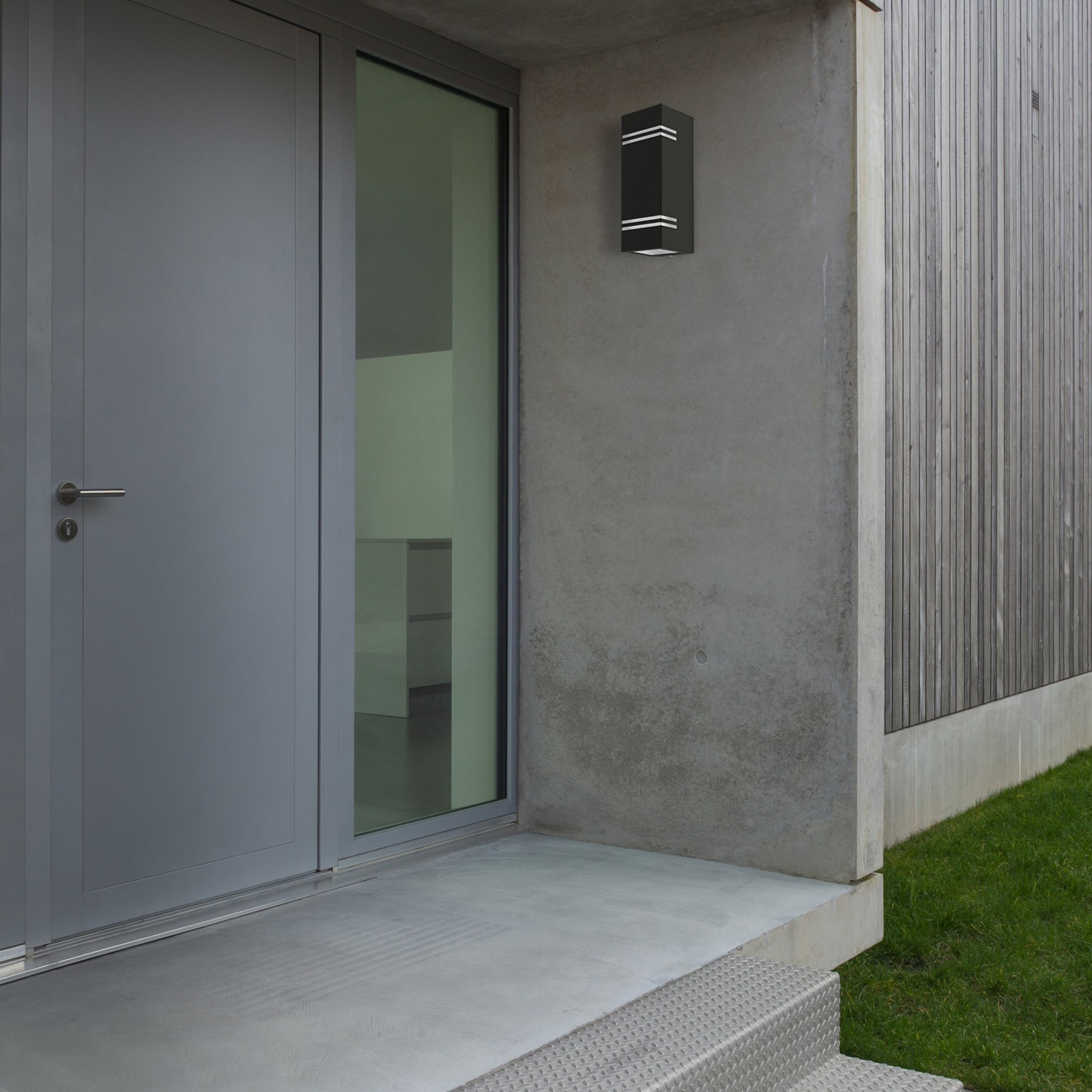 Design Wandleuchte für die Aussenbeleuchtung (oder wahlweise auch für die Innenbeleuchtung) an Häusern, Wänden, Wegen, Mauern, Kellern, Dachböden, Scheunen, Garagen etc. Diese Wandlampe erzeugt wunderbare, effektvolle Beleuchtung an ihrem Haus. Schöne Lichtkegel an der Hauswand nach oben & unten. Gehäuse aus matt-schwarz lackiertem Edelstahl (Rostfrei).