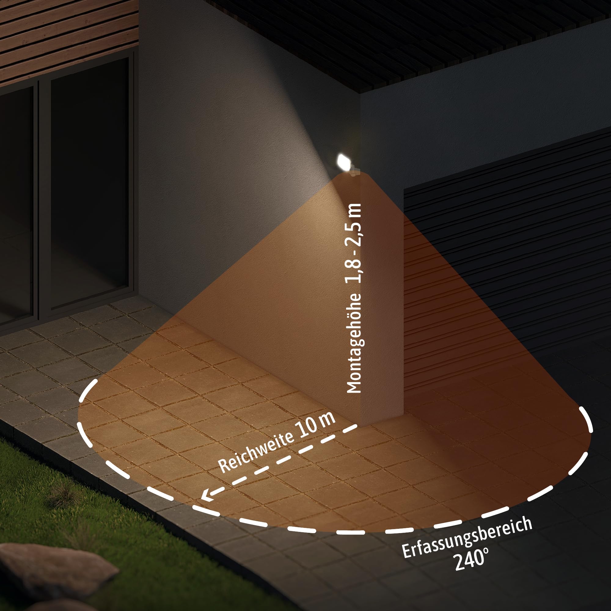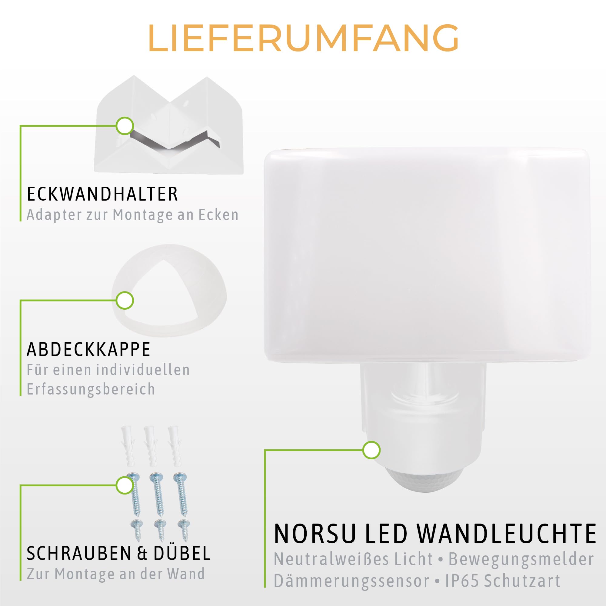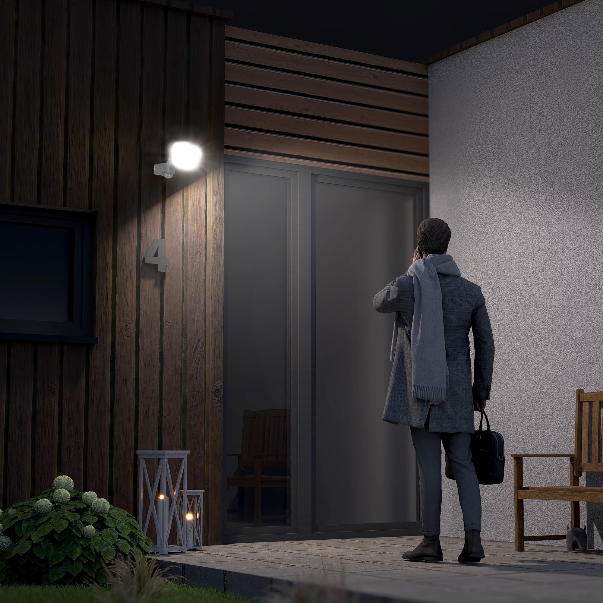 Tauchen Sie Ihren Aussenbereich in ein helles und neutralweisses Licht mit der LED Aussenlampe mit Bewegungsmelder. Diese Eingangslampe weiss leuchtet mit einem breiten Licht, welches Ihren Hof, Wege und den Carport in Szene setzt. Das Wand LED Flutlicht sorgt stets für eine hervorragende Ausleuchtung.Bewegungsmelder & Dämmerungssensor